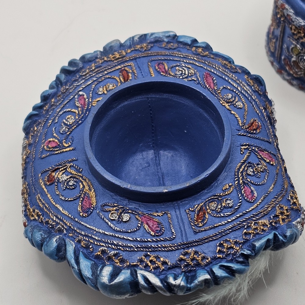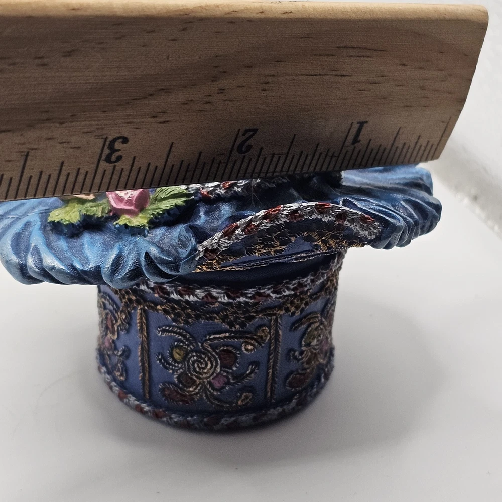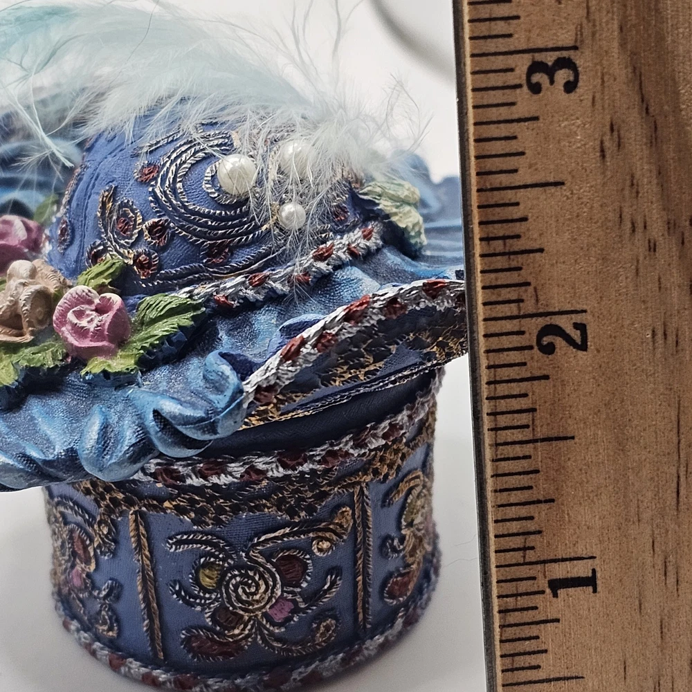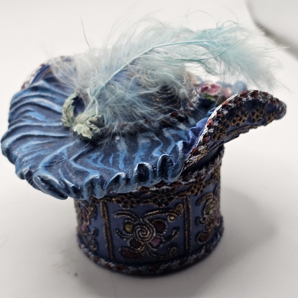 This trinket box features a nostalgic hat design with ornate detailing and a feather embellishment. It is designed by Popular Imports and serves as a decorative storage solution for small items....