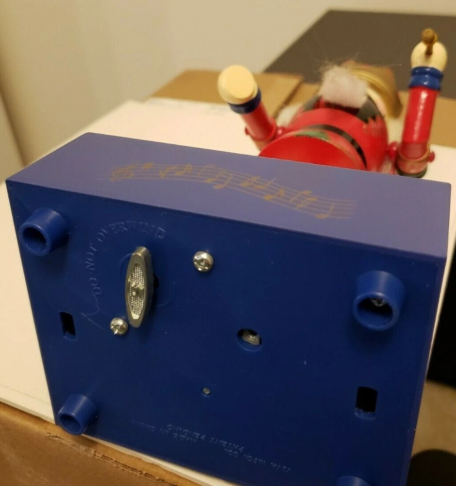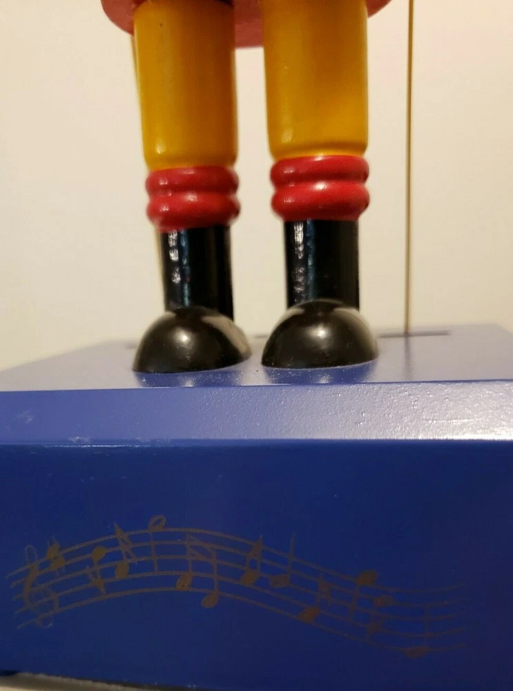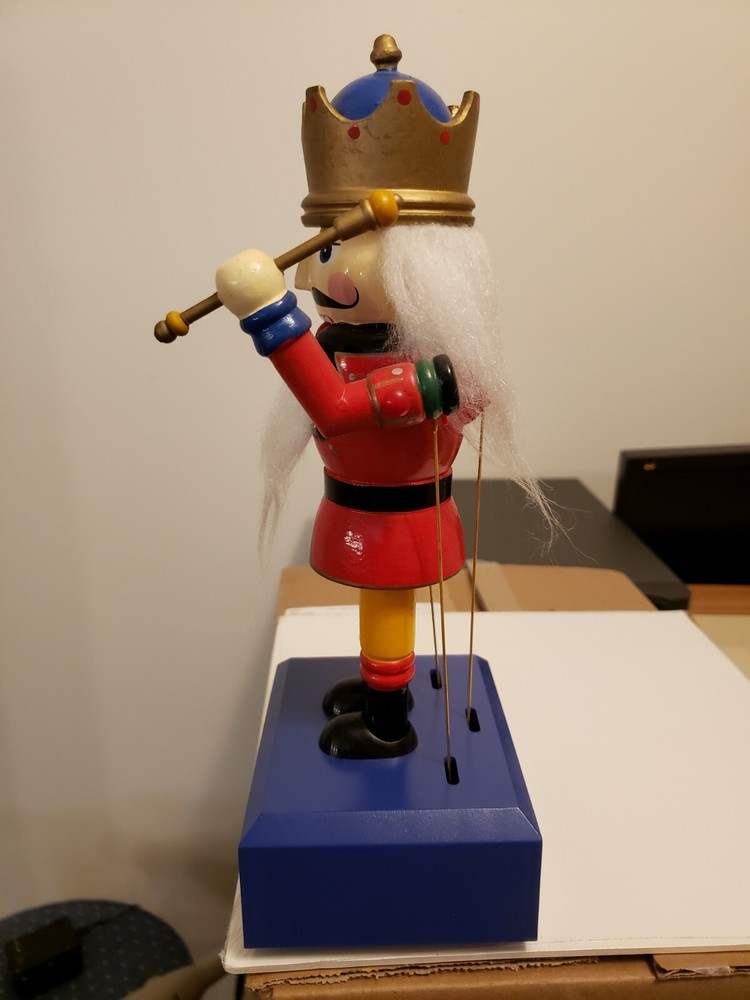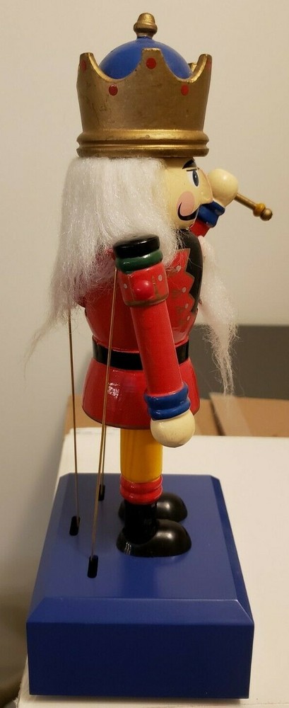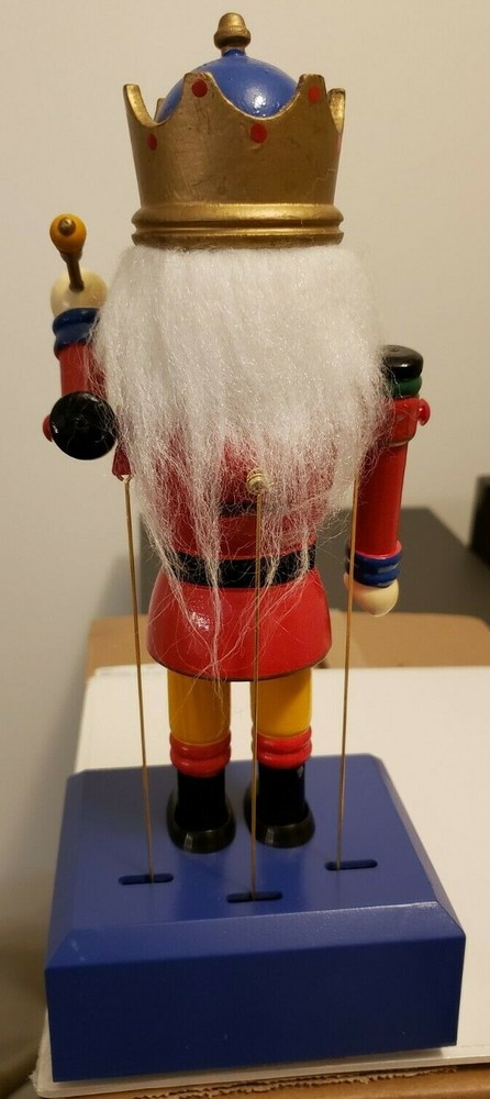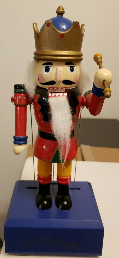 Item: Nutcracker Drummer King Musical Animated Wind-Up Wooden Figurine on Plastic Base Colors are Vivid and hair is in excellent condition. Maker: Viva Mfg. Co. Dimensions: 11" high, 4" wide. Base 3 3/4" x 4 1/2" Colors: Red, Green, Beige, White, Blue, Gold, Black