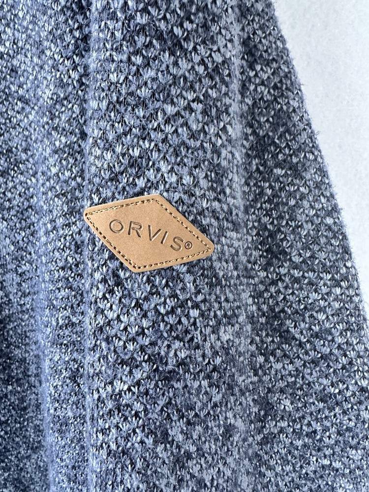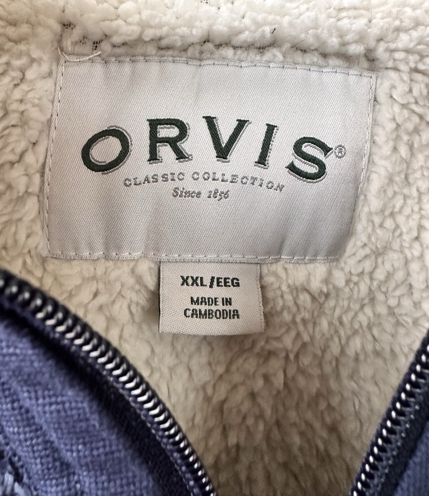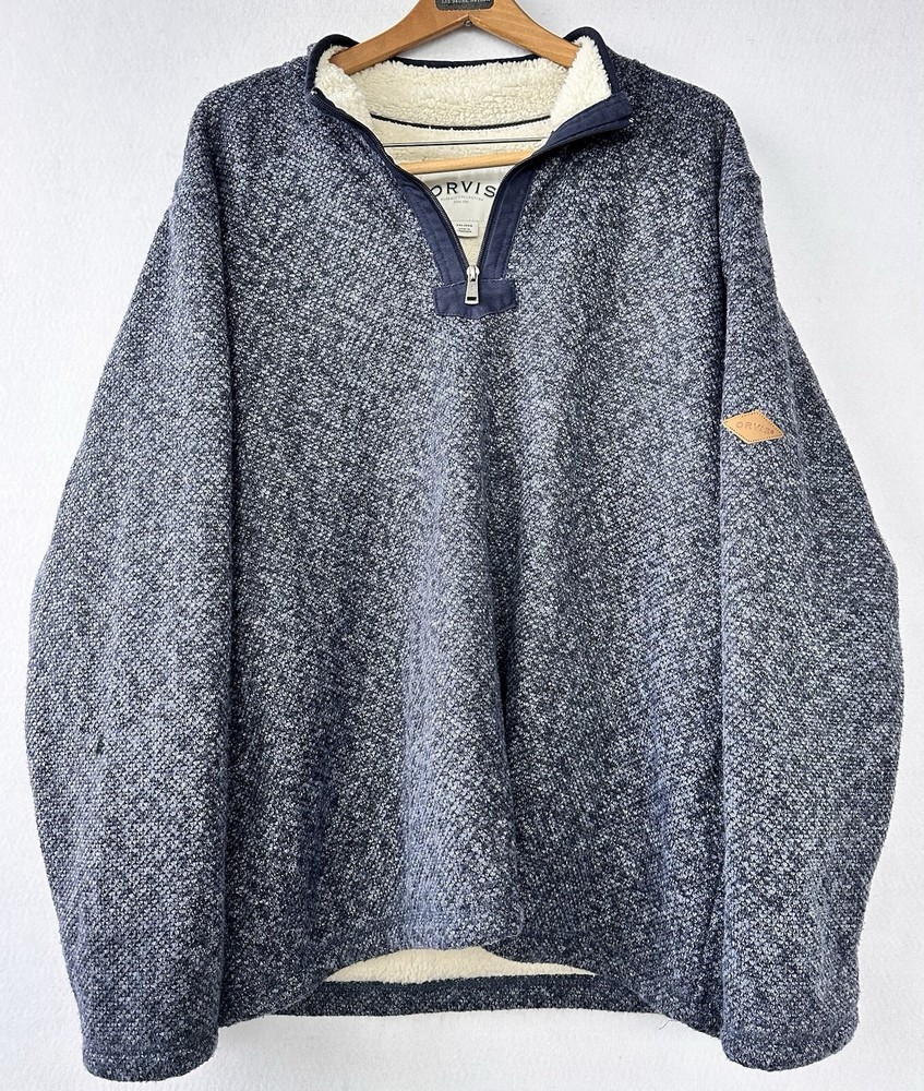 This ORVIS Sherpa Lined Pullover Sweater is the perfect addition to your wardrobe. With a mock neck and long sleeves, it's perfect for staying cozy in the colder seasons. The blue color and accents, such as the zipper and logo, add a touch of style to this classic piece. 52 inches chest 30 inches length Made from a comfortable blend of polyester and cotton, this sweater is great for outdoor activities, college, or even just lounging around the house. It's available in size 2XL for Big & Tall men and is suitable for winter, fall, and spring seasons. The lined feature provides extra warmth, making it the perfect choice for a chilly day.