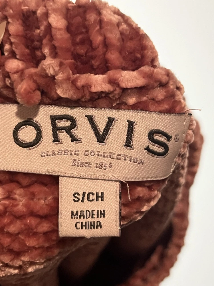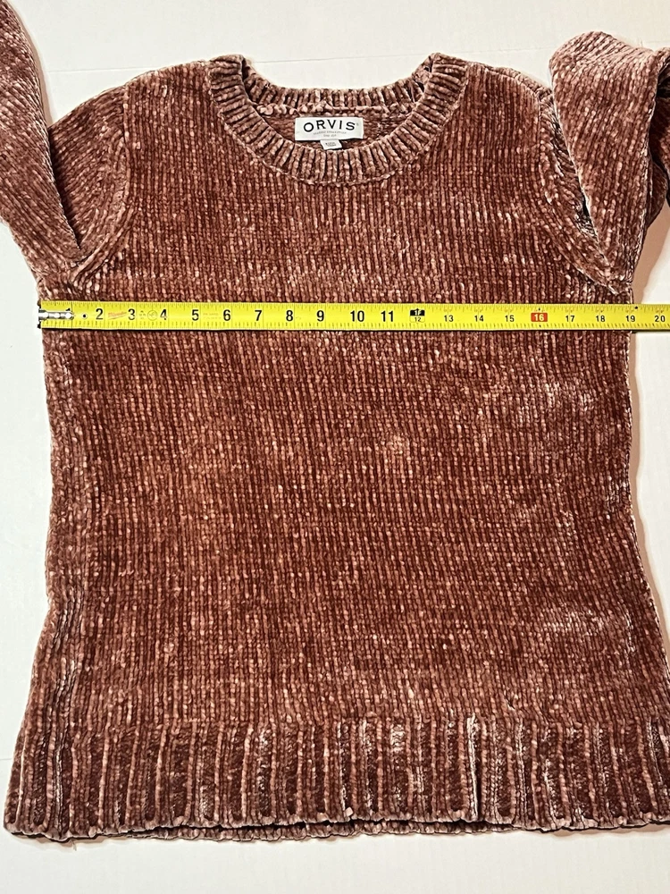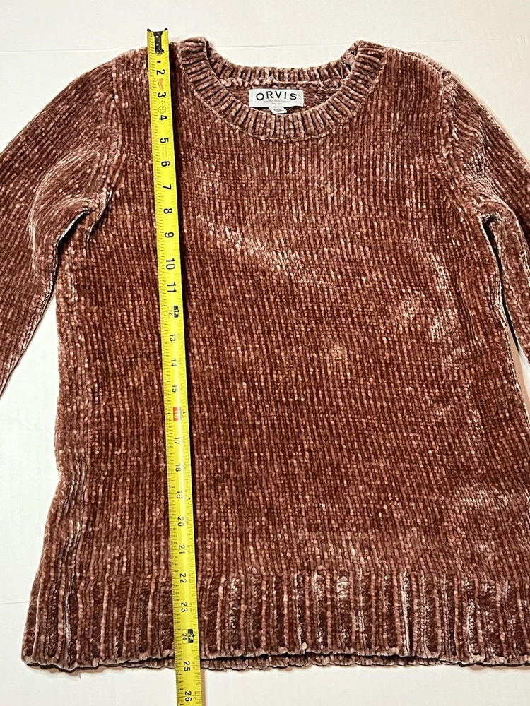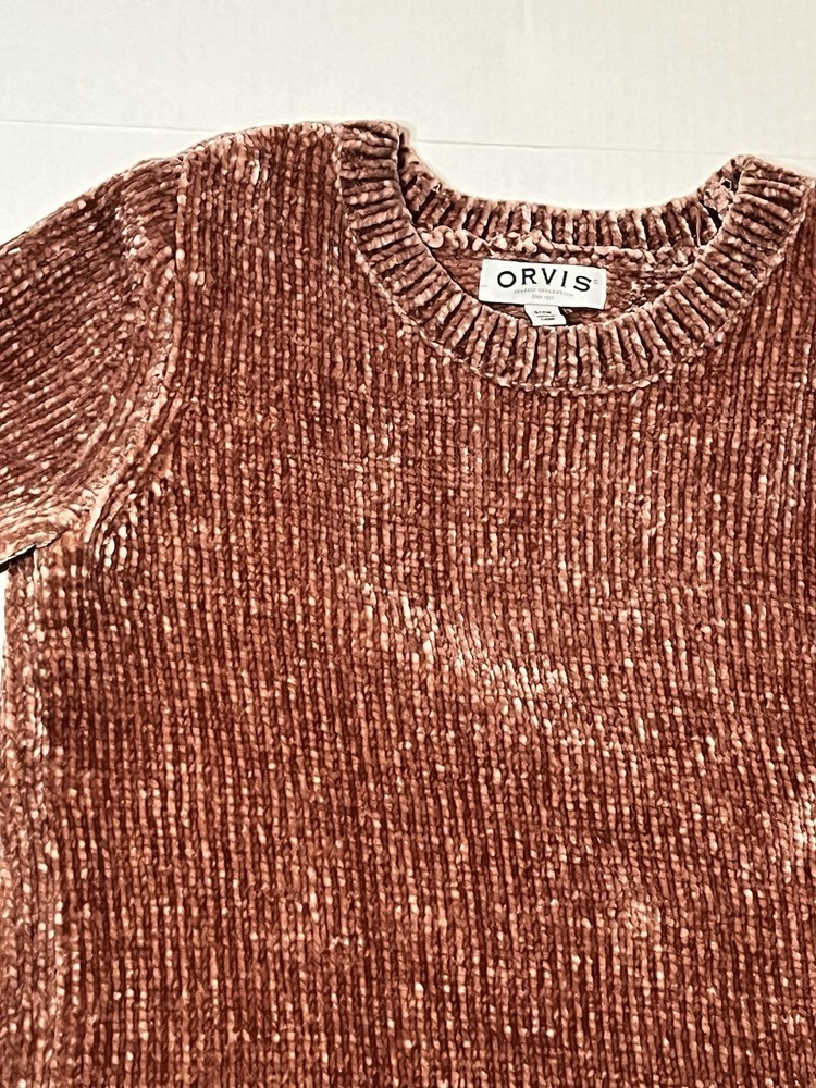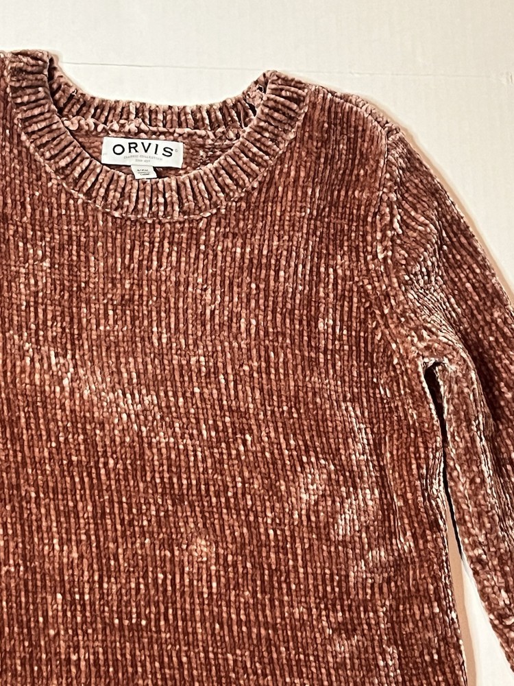 This ORVIS women's sweater is a cozy chenille pullover in a rust orange color. It features a crew neck neckline, long sleeves, and a straight hem. The knit style is chunky-knit, providing a stretchy and soft feel. The sweater is designed for a regular fit in size small. It is suitable for various occasions such as travel, parties, casual outings, and formal or business settings, making it a versatile and stylish addition to your wardrobe.