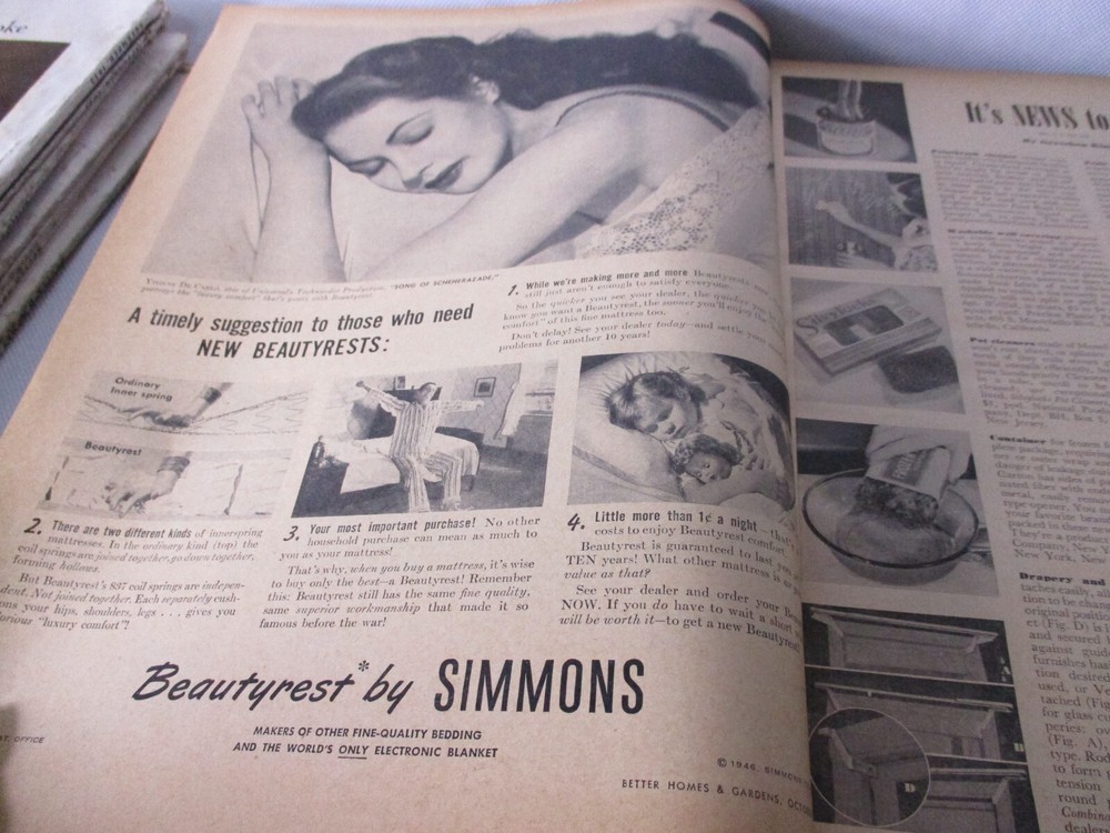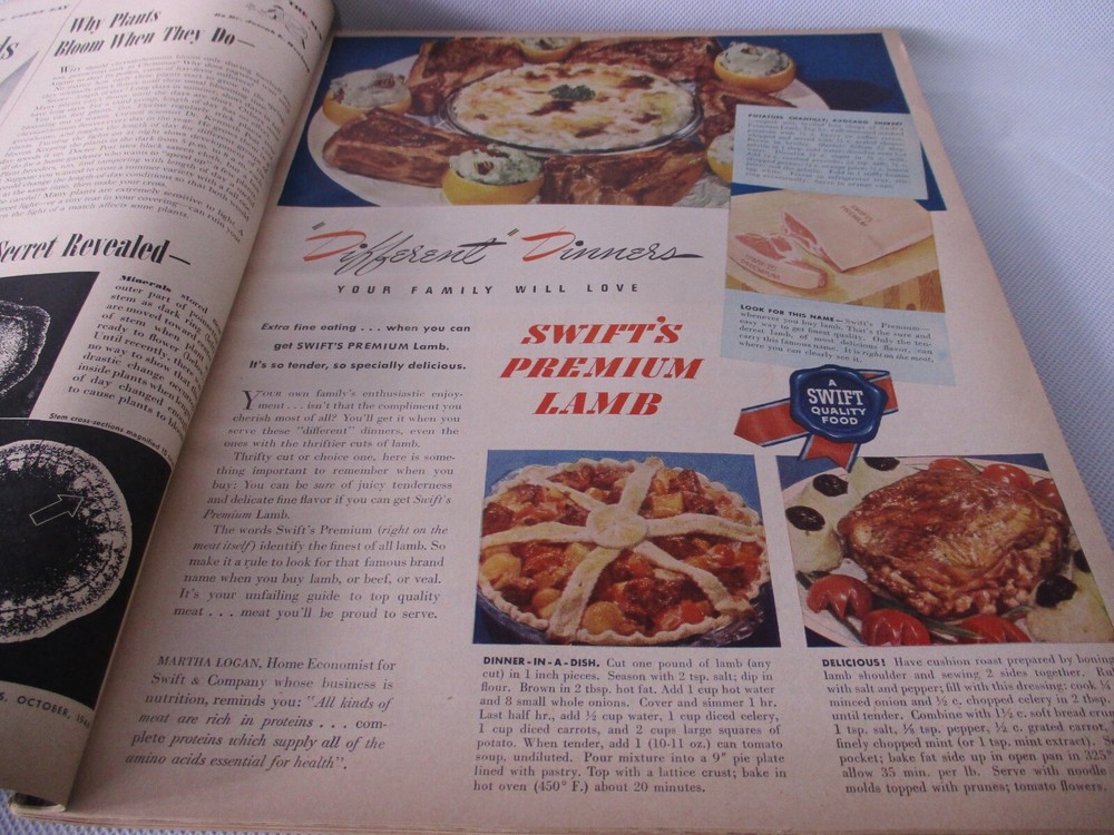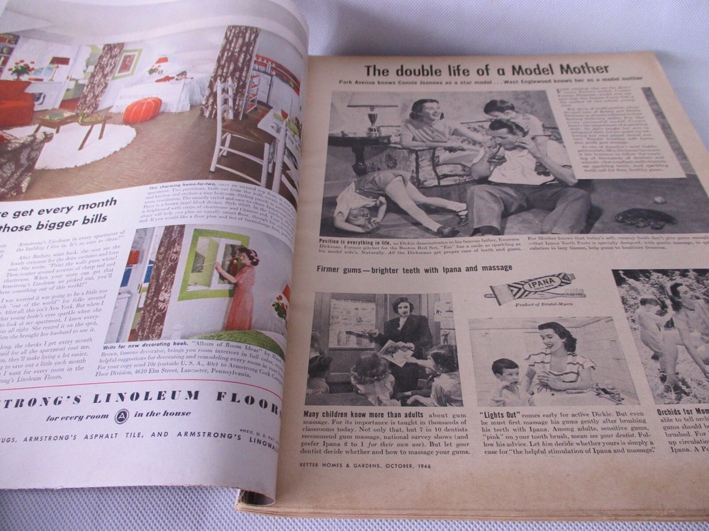 October 1946 Better Homes & Gardens Magazine Stokley's Peas, Buick, Simmons, Dutch Boy, Swift's Lamb, Maytag, Dole Vintage Ads, solid vintage issue, has some wear from reading and storage, dings on the spine and edge dings, spine is solid and pages are tight, good looking magazine for its age. (50761 Hi! And thanks for looking. Hope I can send something good your way. I pack items with care and work my best to get items to you in the best of condition. I have been collecting for over 30 years and do my best to describe everything as well as possible. If I missed something feel free to ask.