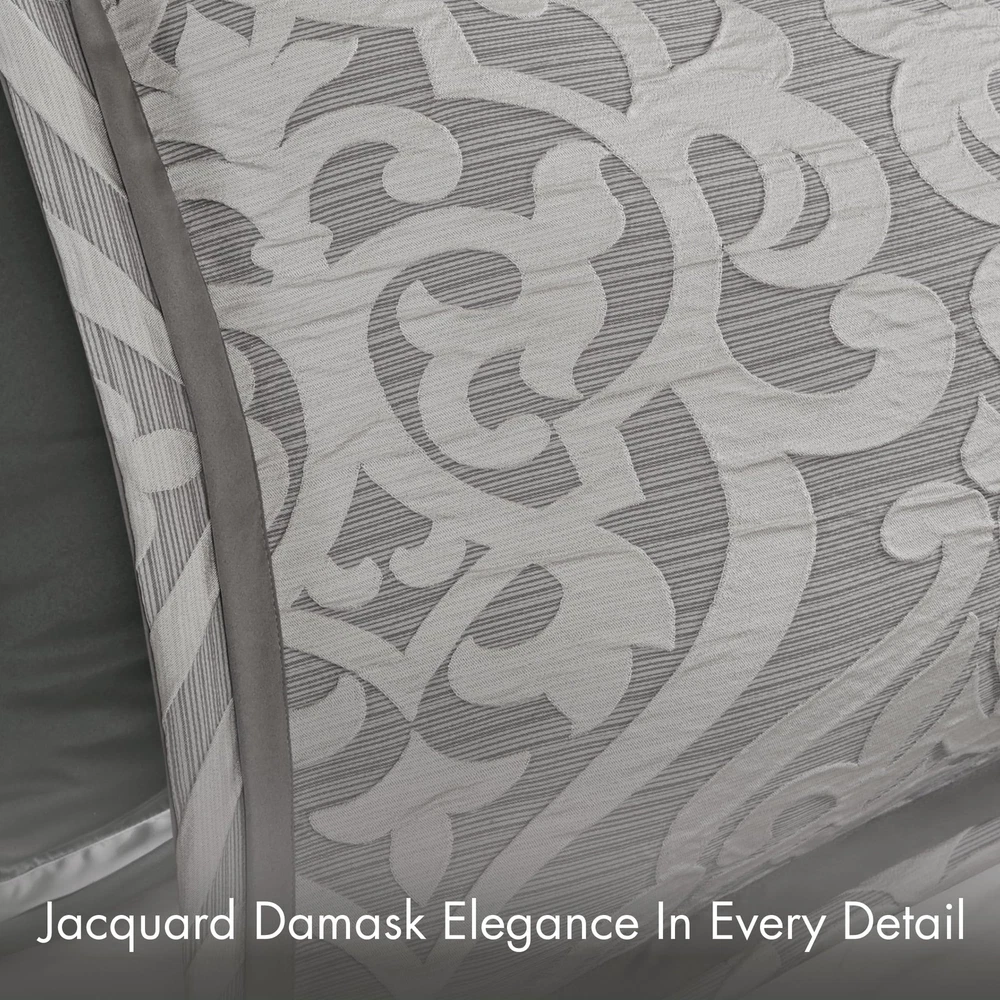 FEATURES - Add a touch of class to your bedroom with the comforter set. The luxurious comforter and shams flaunt a gorgeous medallion design with striations on the satin ground that add dimension to the lavish look. PACKAGE INCLUDE - 1 Comforter, 2 King Shams, 1 Bedskirt, 2 Decorative Pillows, 2 Euro Shams MEASUREMENT - 1 Comforter - 104(W) inches x 92(L) inches, 2 King Shams - 20(W) inches x 36(L) inches - 2 inch flange each, 1 Bedskirt - 78(W) inches x 80(L) inches - 15 inch drop, 2 Decorative Pillows - 12(W) inches x 18(L) inches/18(W) inches x 18(L) inches, 2 Euro Shams - 26(W) inches x 26(L) inches - 2 inch flange each MATERIAL DETAILS - Polyester jacquard with damask stria texture comforter and shams, microfiber reverse, 8oz/sq yard polyester filling, charmeuse bed skirt and euro shams, embroidered pillow with decorative cording, polyesting filling EASY CARE - Machine wash cold on gentle cycle, tumble dry on low heat, do not bleach, Spot Clean Pillow