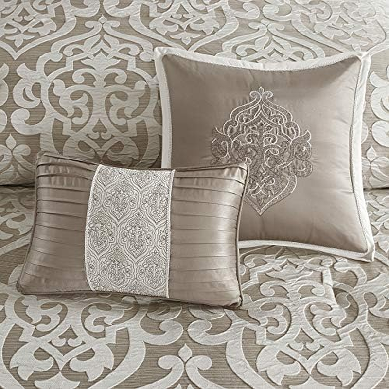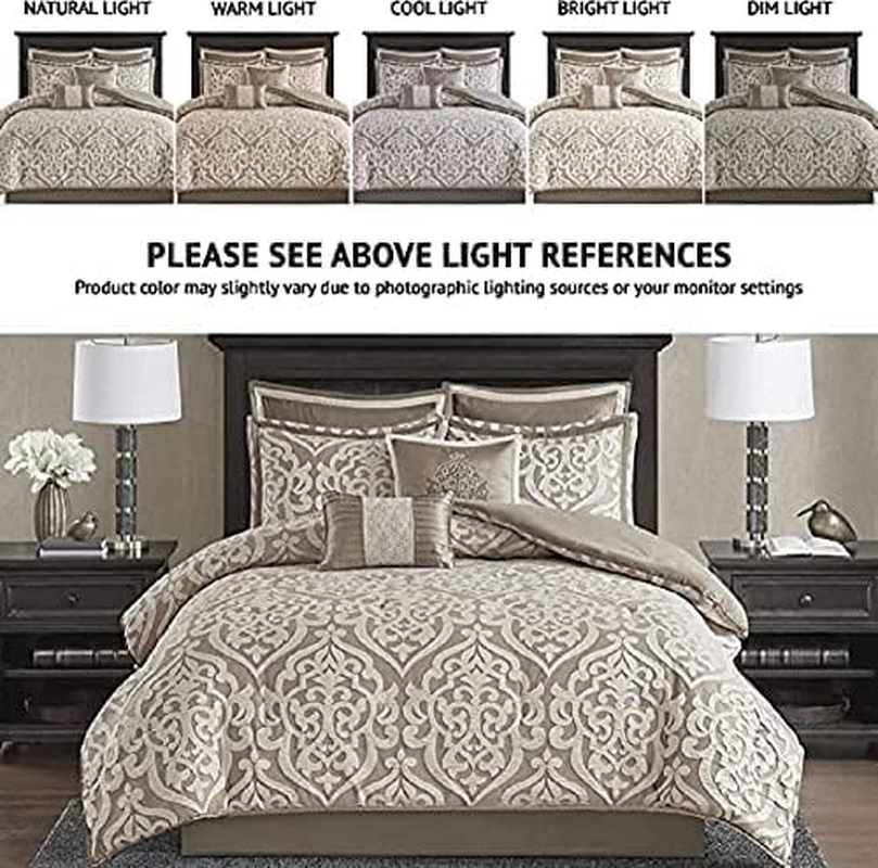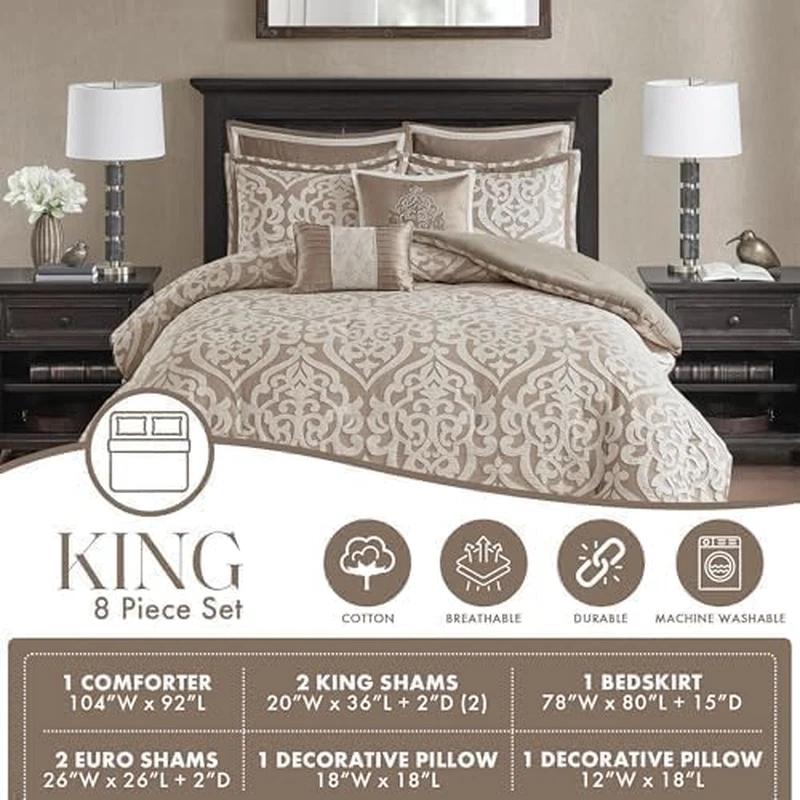 Store New Arrivals Add to Favorite View Feedback Contact Odette Cozy Comforter Set Jacquard Damask Medallion Design - Modern All Season, down Alternative Bedding, Shams, Decorative Pillow, King(104 in X 92 In), Tan 8 Piece Description Item model number MP10-6288 Style Contemporary Assembly required No Pattern Damask Country of Origin China Theme Medallion,Modern,Damask Department unisex-adult Number of Pieces 8 Batteries required No Product Dimensions 92 x 104 x 1.5 inches Seasons All Included Components 1 Comforter, 2 Decoratvie Pillows, 2 King Shams, 2 Euro Shams, 1 Bedskirt Item dimensions L x W x H 92 x 104 x 1.5 inches Fabric Type 100% Jacquard Item Weight 12.78 pounds Color Tan Global Trade Identification Number 00086569209030 Refill down Pillowcase Closure Width 2 Inches Product Care Instructions Machine Wash Size King (104 in x 92 in) 100% Jacquard Add a touch of class to your bedroom with the Madison Park Odette 8 Piece Jacquard Comforter Set. The luxurious textured jacquard comforter and shams flaunt a gorgeous damask medallion design. With the right amount of fill to keep you warm and comfortable year round. Set includes: 1 Comforter:104"W x 92"L, 2 King Shams:20"W x 36"L plus 2"D, 1 Bedskirt:78"W x 80"L plus15"D, 2 Decorative Pillows:12"W x 18"L/18"W x 18"L, 2 Euro Shams:26"W x 26"L plus 2"D Care instructions: Machine wash, delicate and separately. Tumble dry low. Spot clean decorative pillows. Add a touch of class to your bedroom with the Madison Park Odette 8 Piece Jacquard Comforter Set. The luxurious textured jacquard comforter and shams flaunt a gorgeous damask medallion design with ivory striations on the satin ground that add dimension to the lavish look. A solid neutral reverse and stunning Euro shams complement the top of the bed to complete the ensemble. Also included are two decorative pillows that feature embroidery and cording details, while a solid neutral bed skirt provides a clean and elegant finish. Machine washable for easy care, This jacquard comforter set offers a strikingly luxurious update to your décor. ABOUT US We offer the best prices around on high quality products. Our E-store includes media such as books, movies, music and games while offering electronics, toys, sporting apparel, clothing, tools, general home, garden items and more. SHIPPING We are always working hard to ensure your package arrives as soon as possible. Please understand that some factors like weather, high postal traffic, and the performance of shipping companies are outside of our control. We offer free shipping to the lower 48 states and ship within 2 business days of payment, usually sooner. We do not accept P.O. Boxes. Please provide a physical address. For shipping outside of the continental USA, we only use eBay's Global Shipping Program.The item is shipped to KY and then sent to the rest of the world. International customers are responsible for all duties and taxes. Continue to check out in order to calculate costs for shipping the item to your country. Messages regarding eBay's Global Shipping Program MUST be directed at eBay EXCLUSIVELY. RETURNS We offer a 30-Day Return Policy on items which you are not completely satisfied with. You have the option for a full-refund or an exchange of the item. No returns are available on items shipped outside of the USA. PAYMENT We accept PayPal. CONTACT US This page content is yet to come Please ad us to your favorite seller and visit again later Thank You CUSTOMER SATISFACTION We try our very best to make sure every customer is completely satisfied. If there's a problem, message us! We're happy to help.
