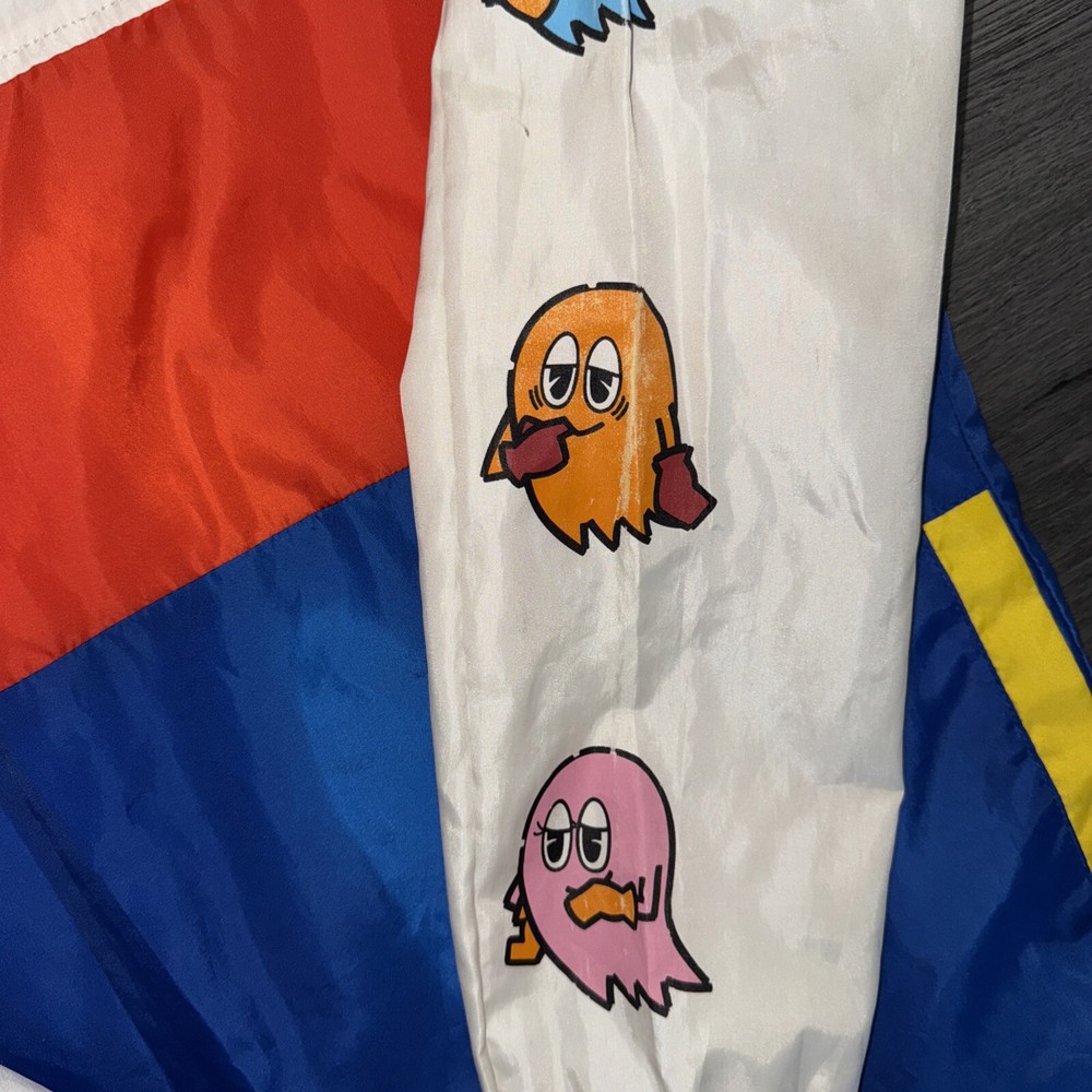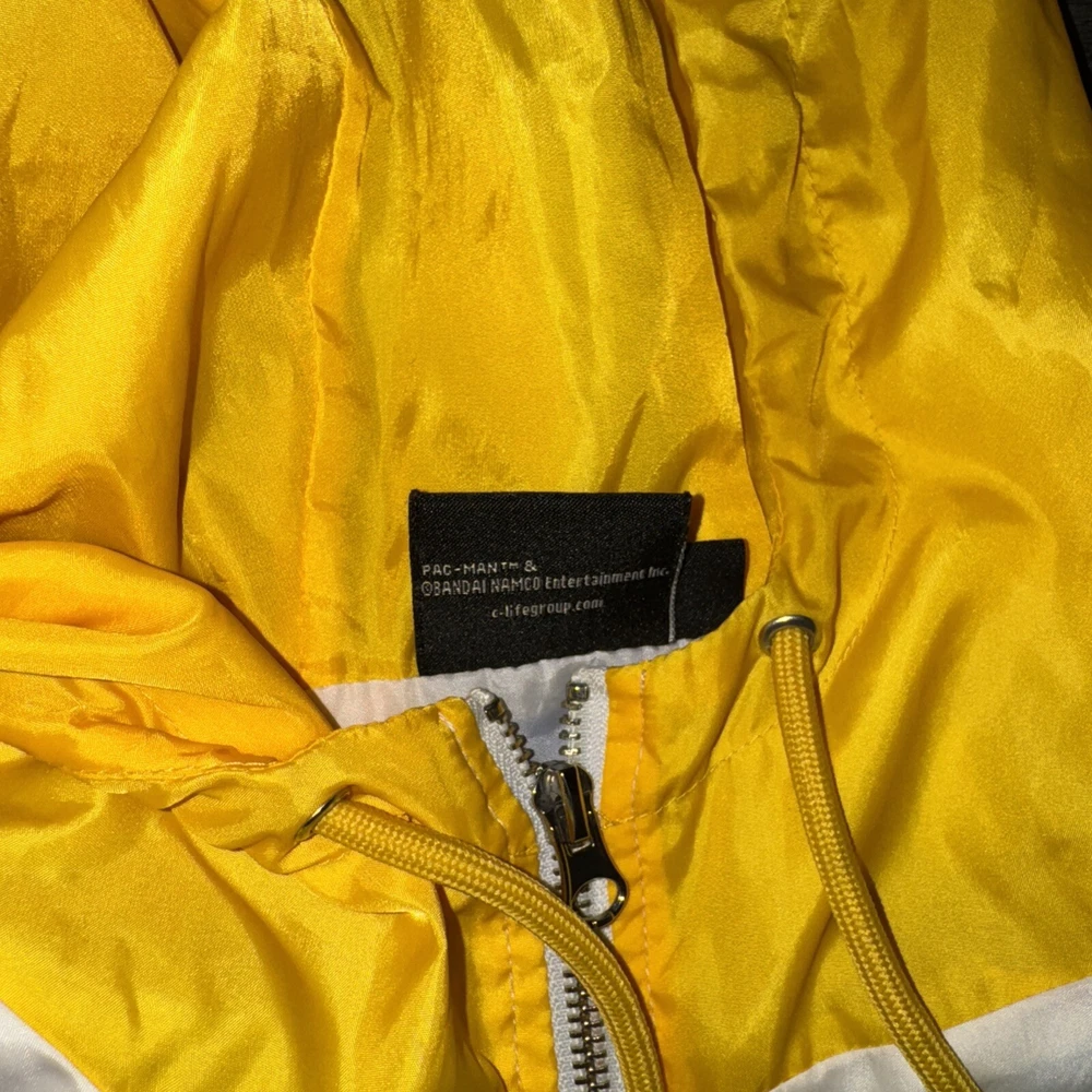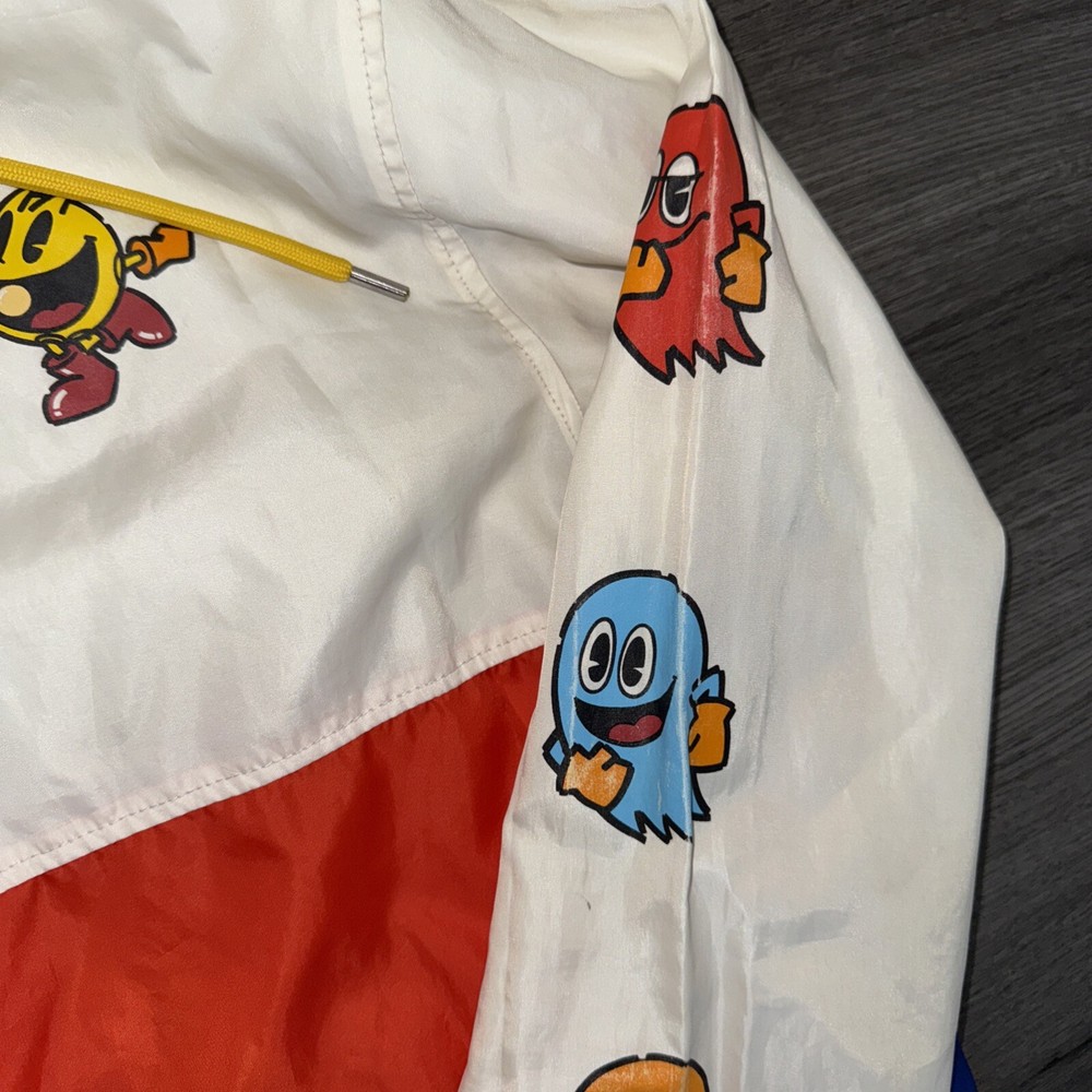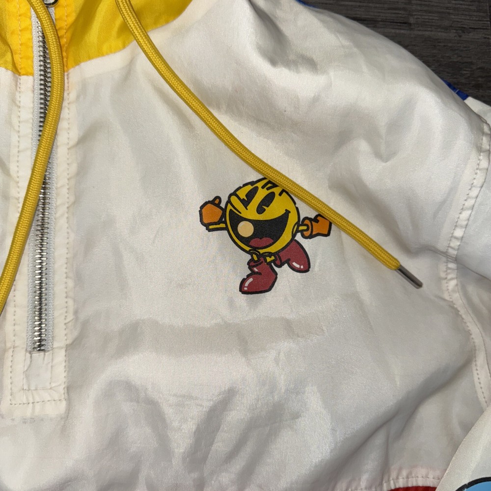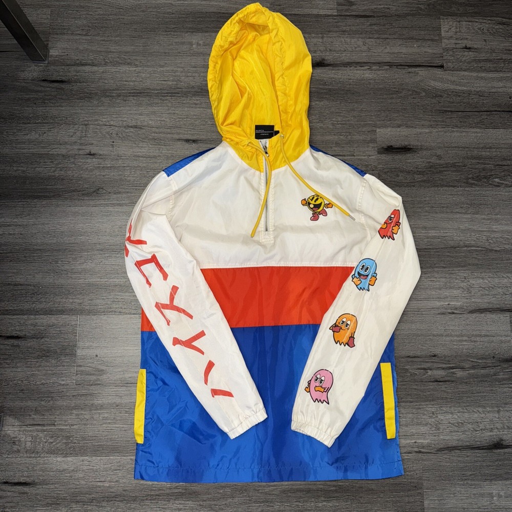 The official Bandai Namco Japanese PAC-MAN Colorblock Windbreaker is a men's jacket featuring a 100% polyester softshell fabric with a multicolor colorblock design. This lightweight windbreaker has a hooded collar, elastic waist, and quarter-zip closure. It is lined with polyester and offers windproof protection, making it suitable for all seasons. The jacket showcases a unique Pac-Man graphics theme, perfect for fans of the 80s video game character.