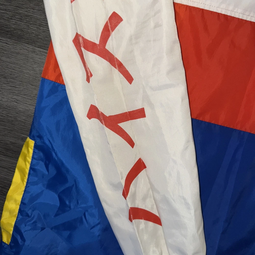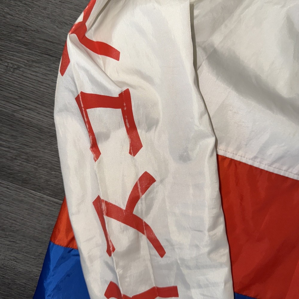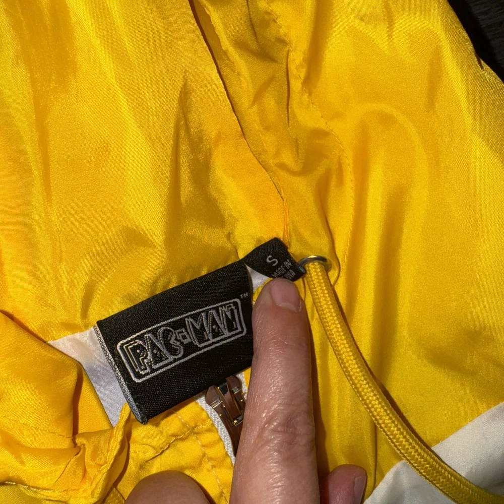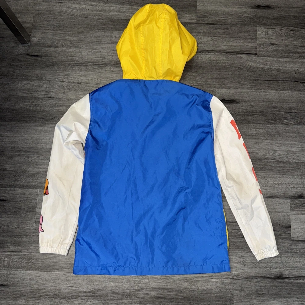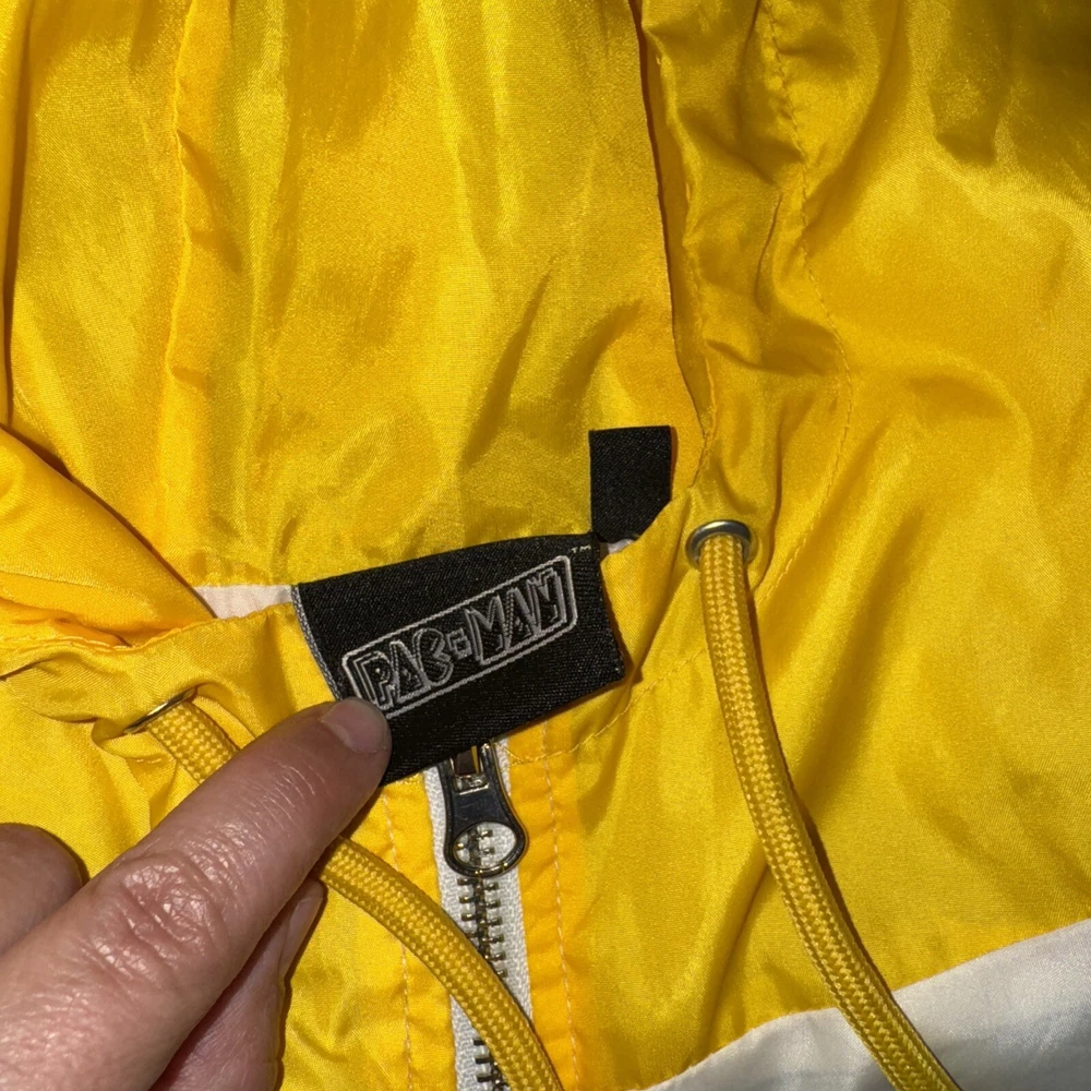 The official Bandai Namco Japanese PAC-MAN Colorblock Windbreaker is a men's jacket featuring a 100% polyester softshell fabric with a multicolor colorblock design. This lightweight windbreaker has a hooded collar, elastic waist, and quarter-zip closure. It is lined with polyester and offers windproof protection, making it suitable for all seasons. The jacket showcases a unique Pac-Man graphics theme, perfect for fans of the 80s video game character.