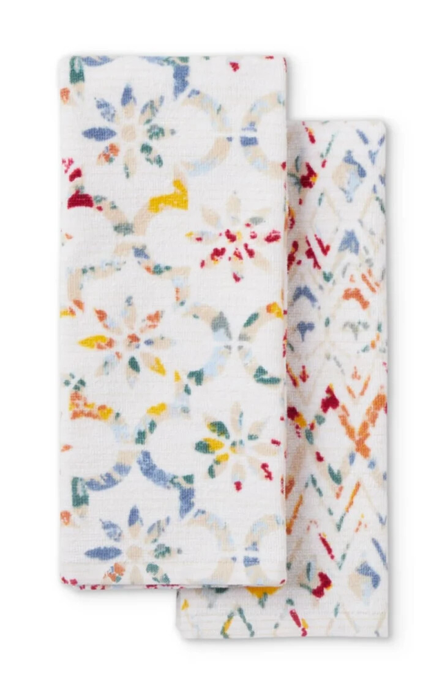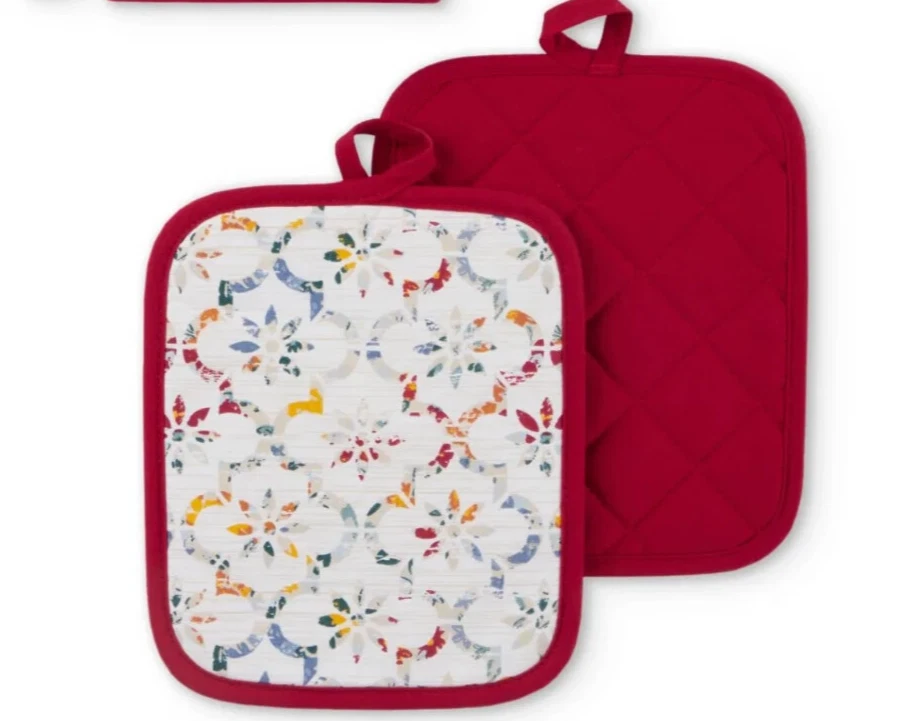 Ogee Tile 5-Piece Kitchen Towel Set 5-Piece set. Includes (2) two kitchen towels - 15" x 25"; (2) two potholders - 6.75" x 8"; and (1) oven mitt - 7" x 11". 100% Cotton. Machine washable. Stylish and durable. My items come from a non-smoking and pet-free environment. Fast shipping always! Shelf AA-5