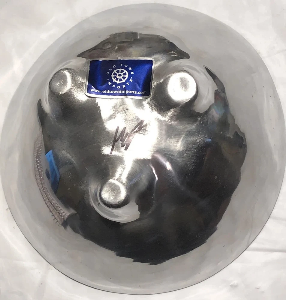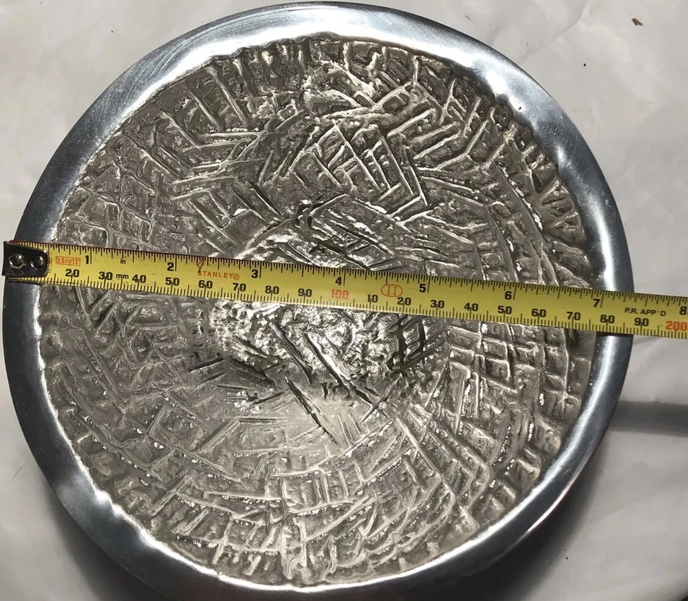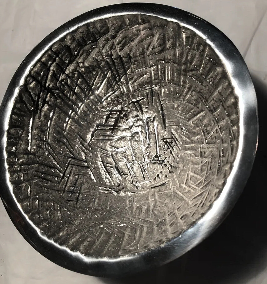 Old Town Imports SIGNED Metal Abstract design bowl. Original sticker Condition is "Used" but I see no flaws Shipped with USPS 7" DIAM 3" DEEP Weighs 1 lb 10 oz...