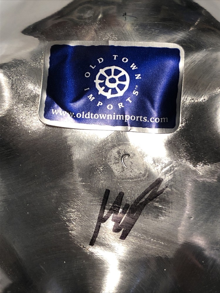 Old Town Imports SIGNED Metal Abstract design bowl. Original sticker Condition is "Used" but I see no flaws Shipped with USPS 7" DIAM 3" DEEP Weighs 1 lb 10 oz