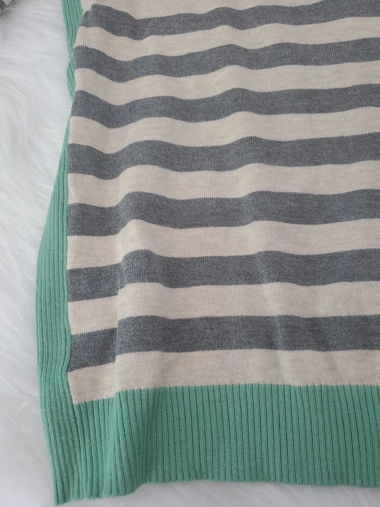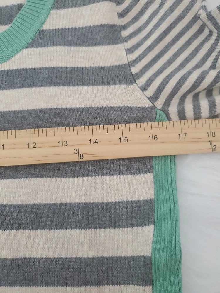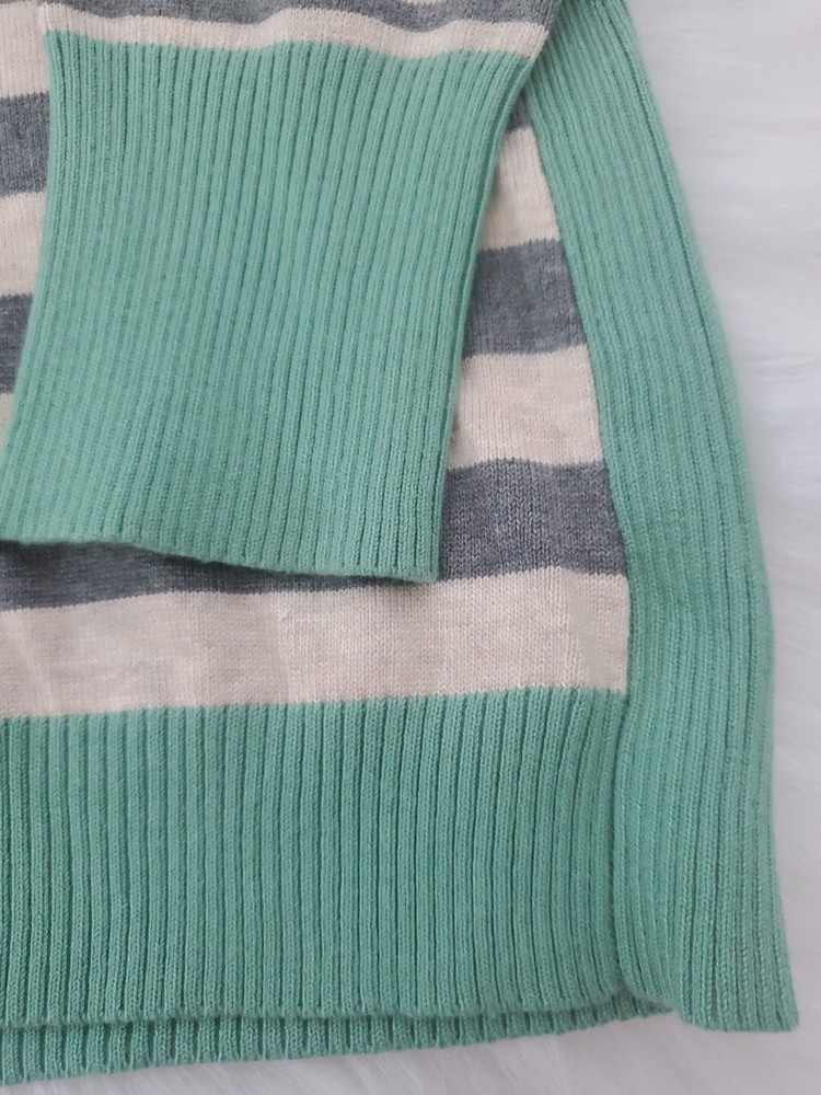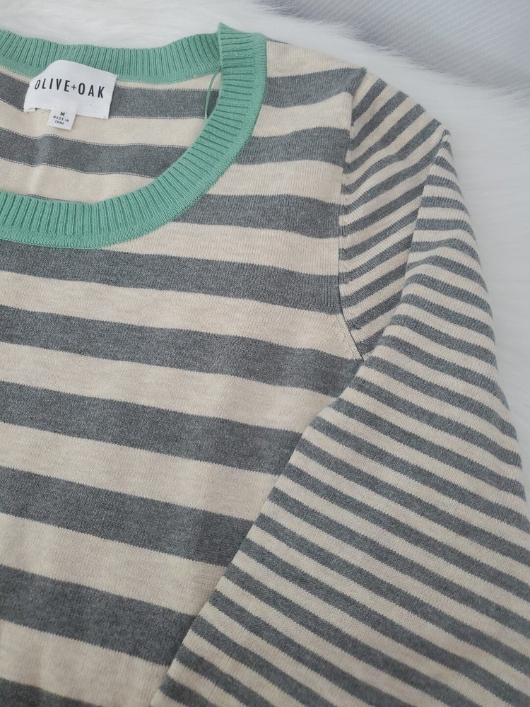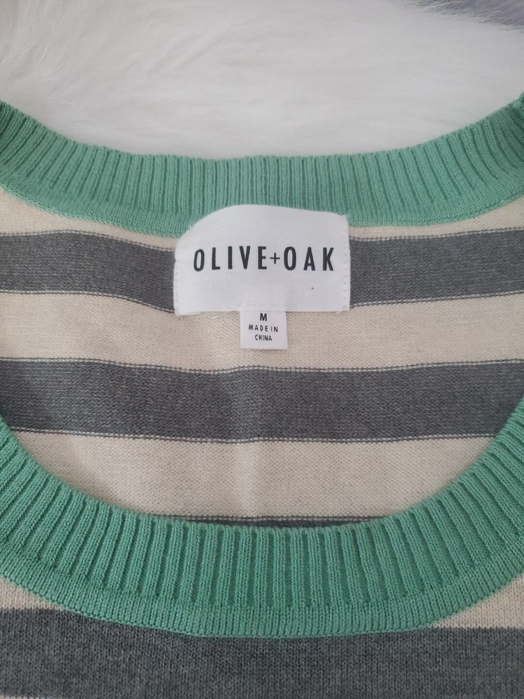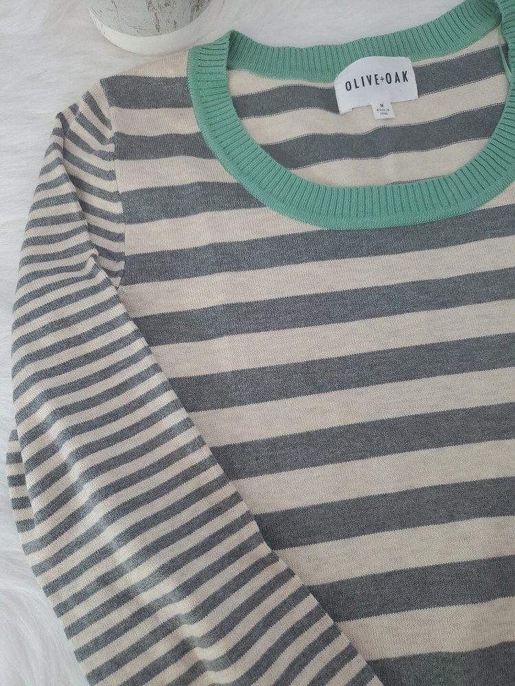 Elevate your wardrobe with this Olive+Oak sweater in size M. The tight-knit, raglan sleeve sweater features a round neckline and a gray with green stripe pattern that exudes classic and bohemian vibes. Perfect for travel, casual outings, or workwear, this sweater is made of a lightweight and breathable blend of polyester and rayon, making it suitable for all seasons. Machine washable for easy care, this pullover is a must-have addition to any fashion-forward woman's collection. Pre-owned and in excellent condition!