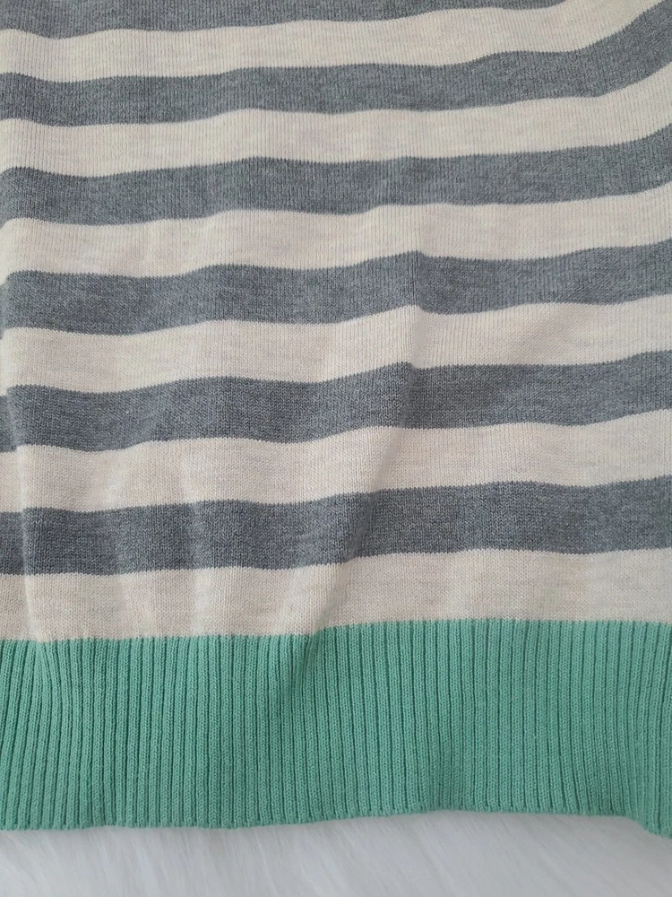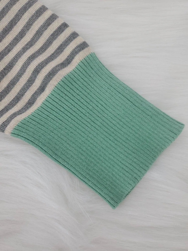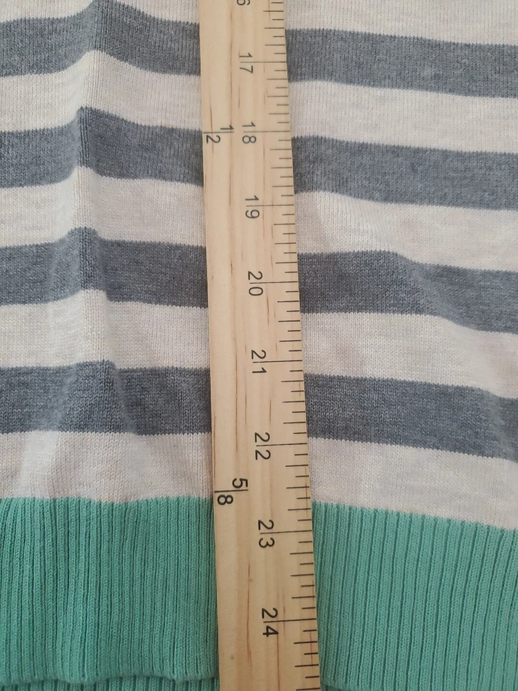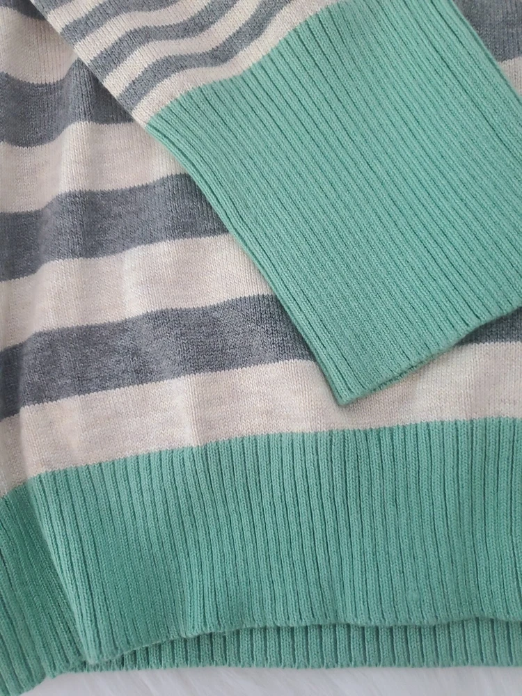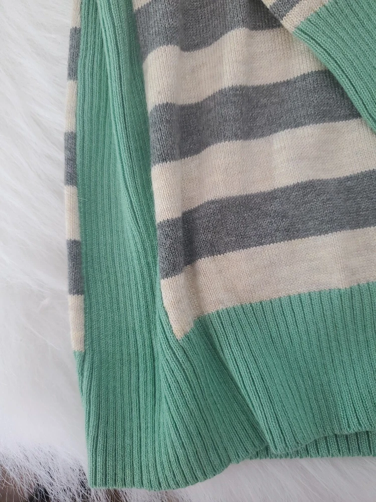Elevate your wardrobe with this Olive+Oak sweater in size M. The tight-knit, raglan sleeve sweater features a round neckline and a gray with green stripe pattern that exudes classic and bohemian vibes. Perfect for travel, casual outings, or workwear, this sweater is made of a lightweight and breathable blend of polyester and rayon, making it suitable for all seasons. Machine washable for easy care, this pullover is a must-have addition to any fashion-forward woman's collection. Pre-owned and in excellent condition!