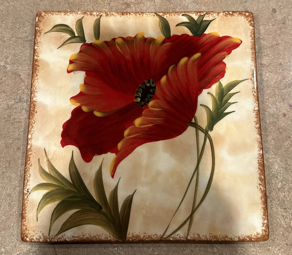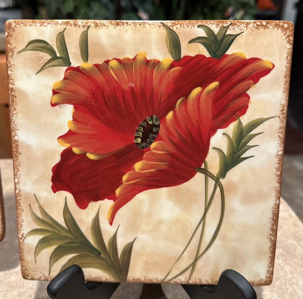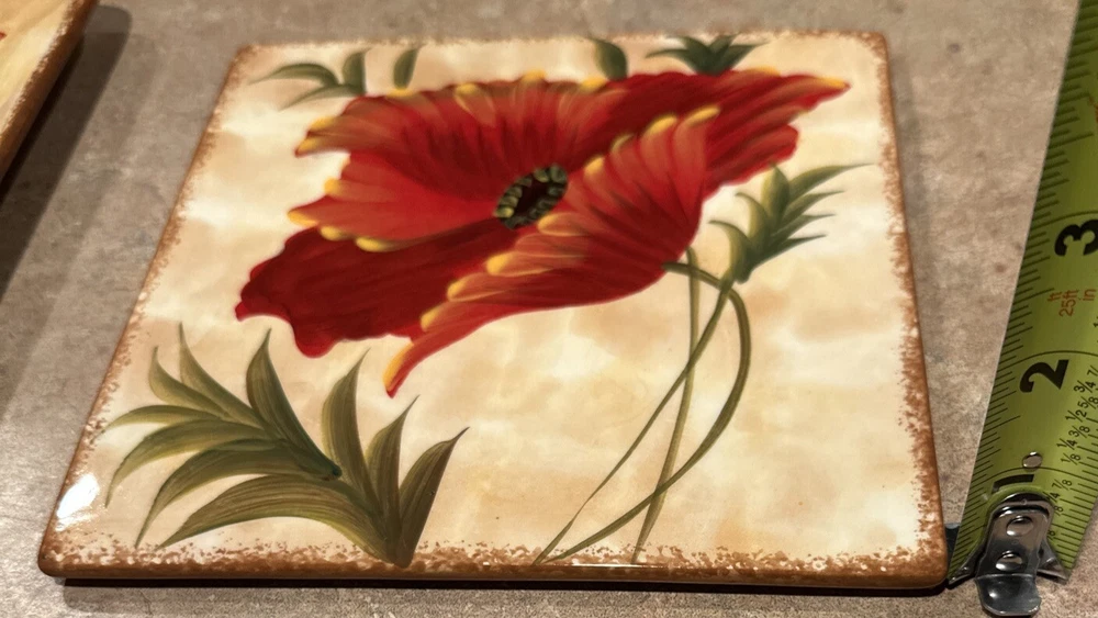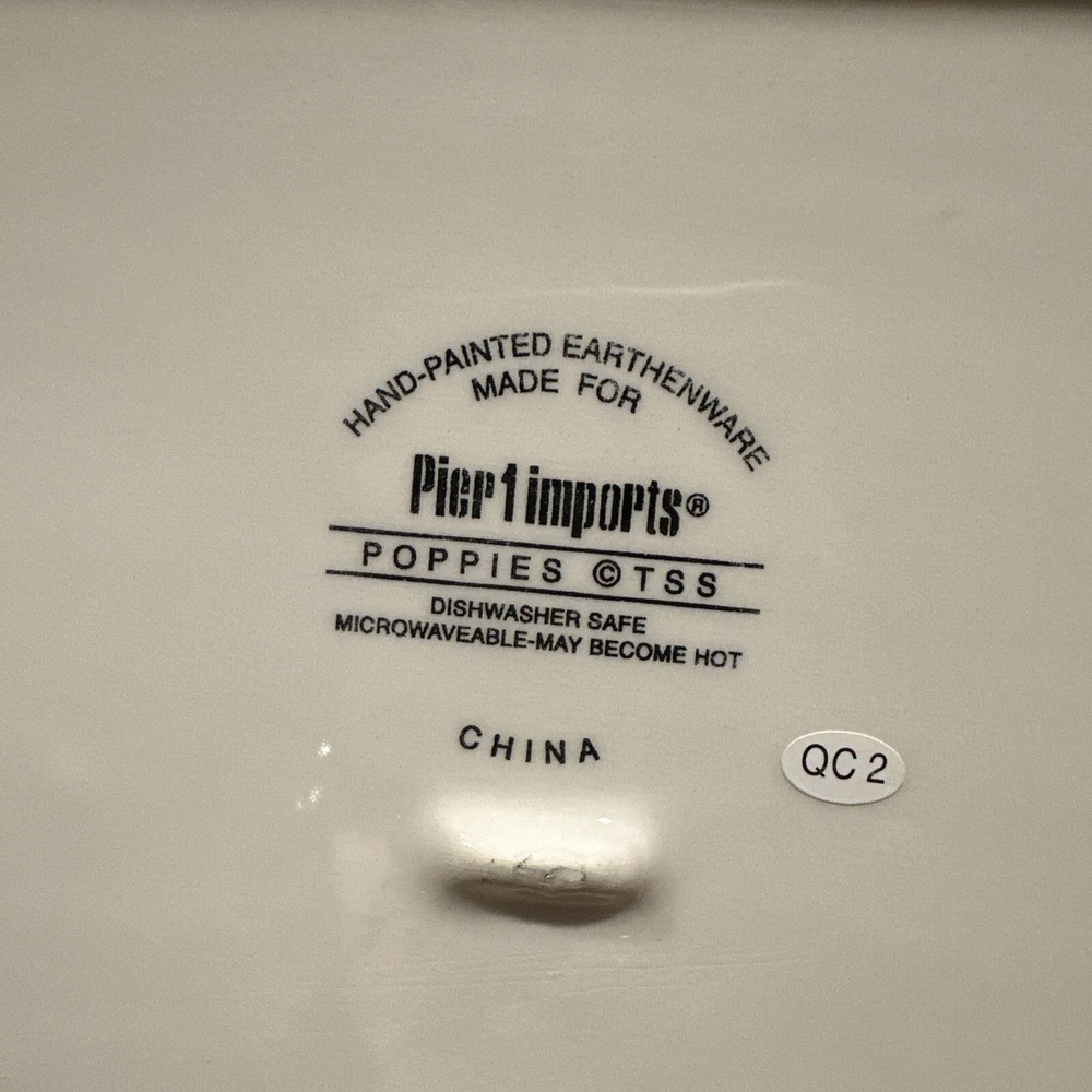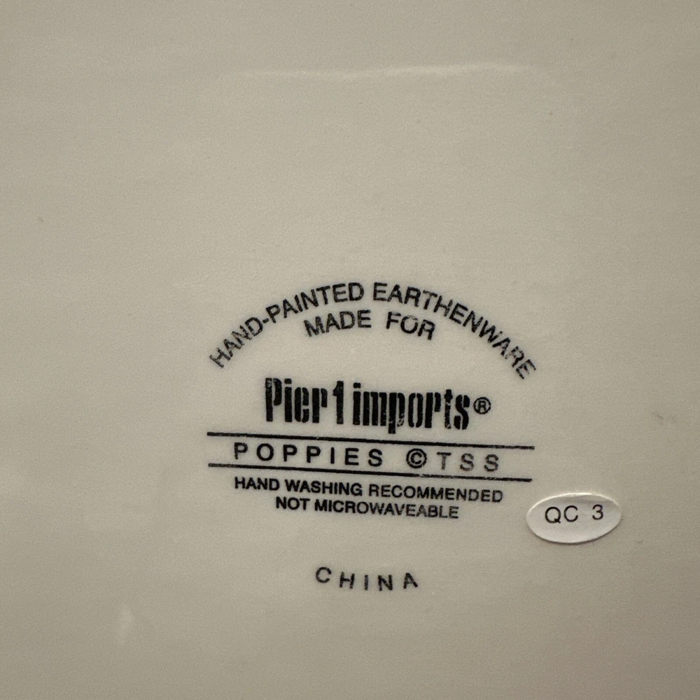 This beautiful set from Pier 1 features a hand-painted design of vibrant poppies on a glossy earthenware material. The set includes one 8.5" salad plate and one 7" trivet, perfect for any occasion. The set is an original production and features a printed backstamp. The set is perfect for adults and is a great addition to any collection of decorative cookware, dinnerware, and serveware. The set should be hand washed only and is not an antique or vintage item. Add this stunning set to your collection today!