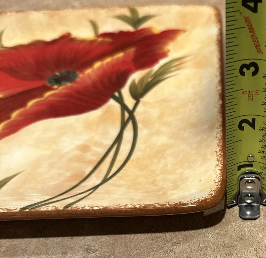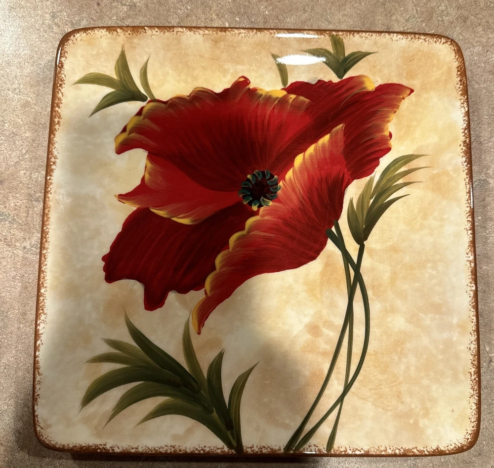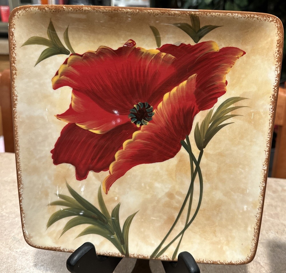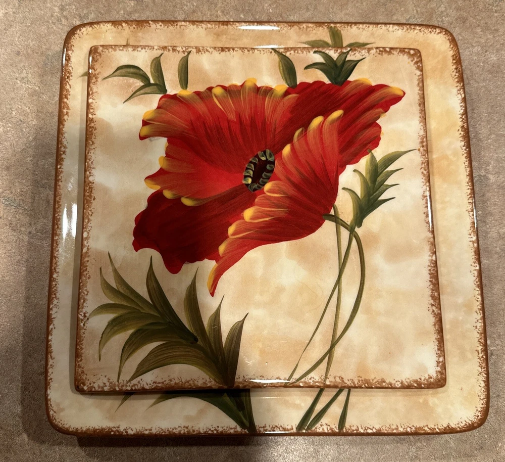 This beautiful set from Pier 1 features a hand-painted design of vibrant poppies on a glossy earthenware material. The set includes one 8.5" salad plate and one 7" trivet, perfect for any occasion. The set is an original production and features a printed backstamp. The set is perfect for adults and is a great addition to any collection of decorative cookware, dinnerware, and serveware. The set should be hand washed only and is not an antique or vintage item. Add this stunning set to your collection today!