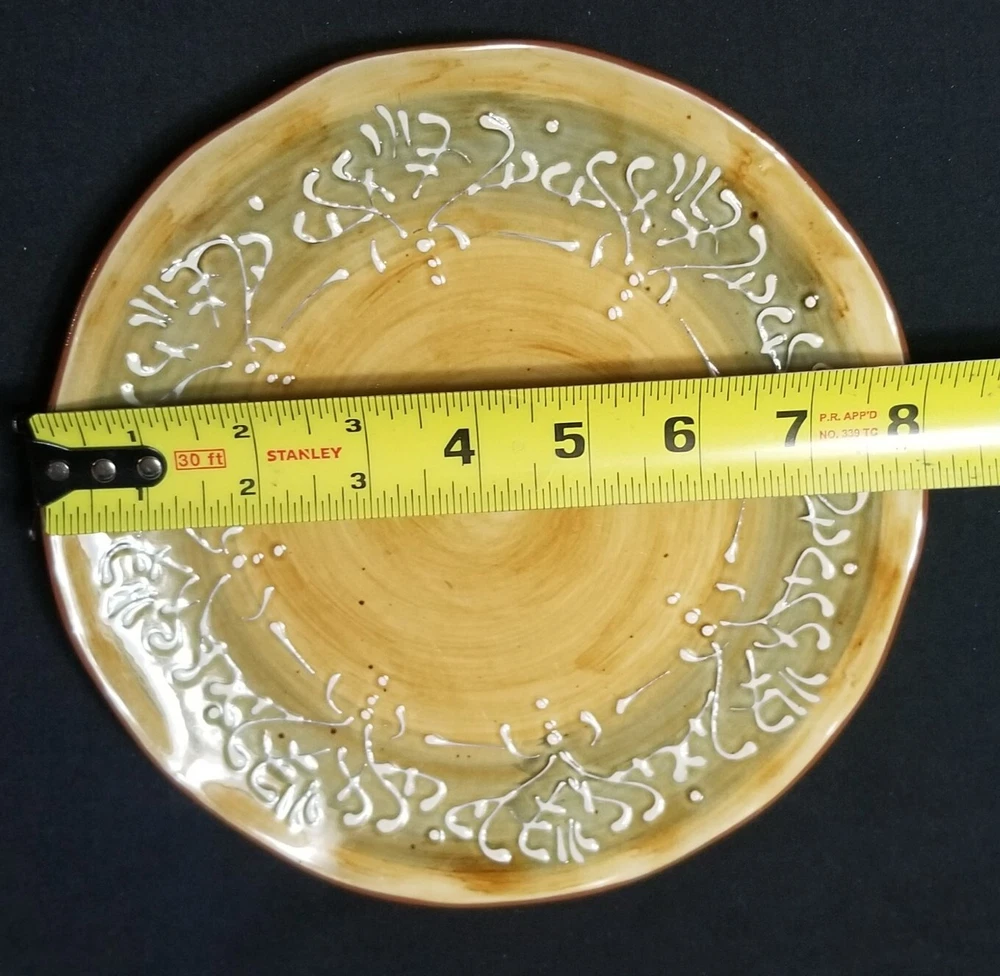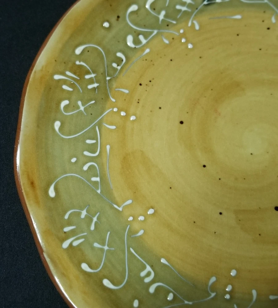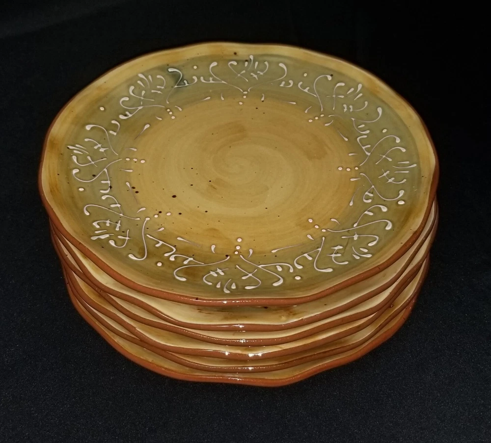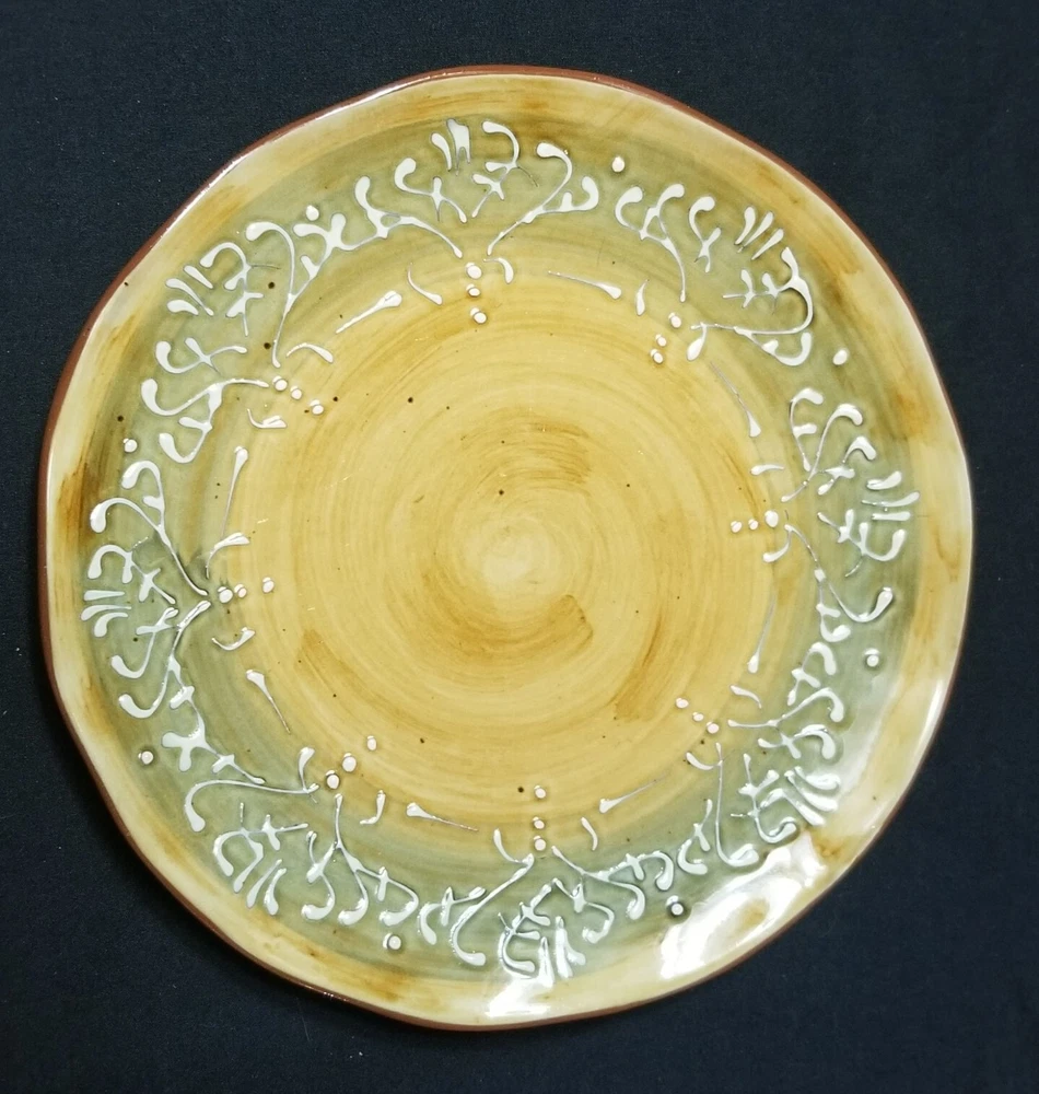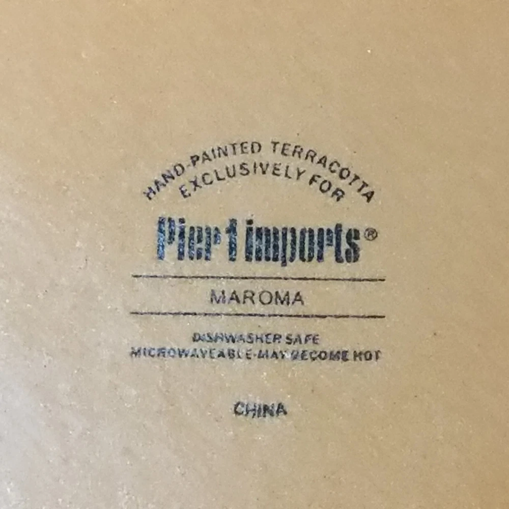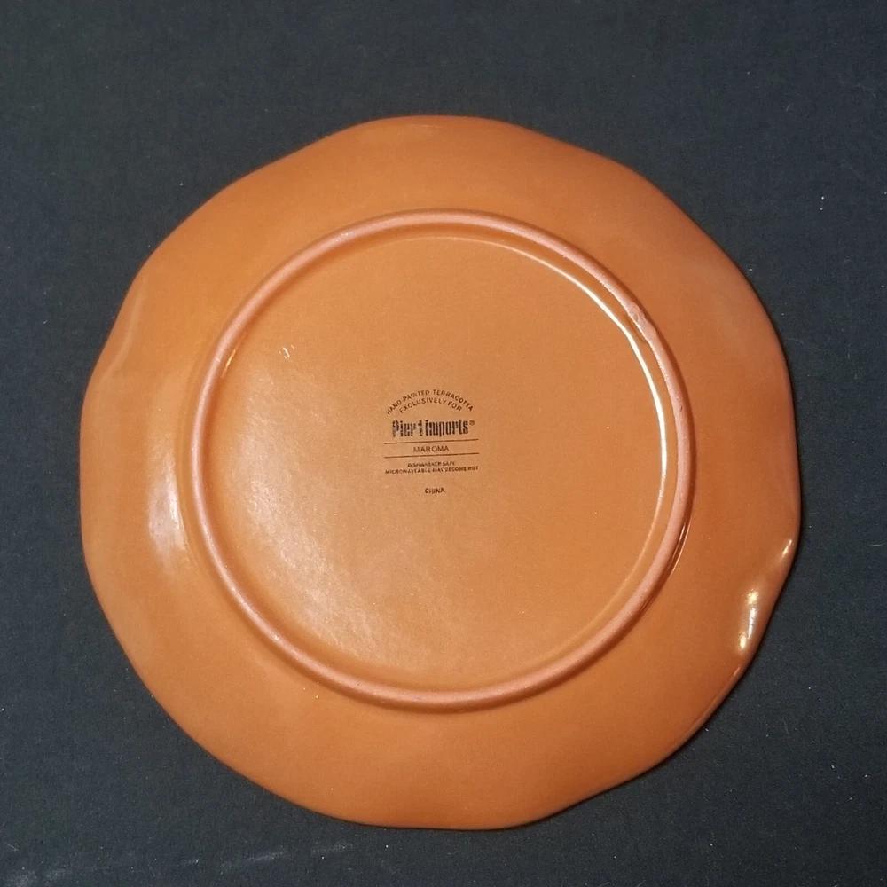 Add a touch of contemporary style to your dinnerware collection with this Pier 1 Imports Maroma Salad plate (s) Listing is for one Plate 6 available they are all in Excellent Condition no Chips or Cracks some Light Utensil Marks/Wear and Light Crazing see Photos for Detailed Description of Condition. The plates are approximately 8" in diameter they weight Approximately 1 lb. Each they feature an embossed white scroll pattern on a glossy terracotta base in amber, tan, green, and white hues. They are dishwasher and microwave safe, making them perfect for everyday use and all occasions.