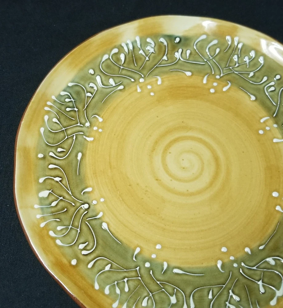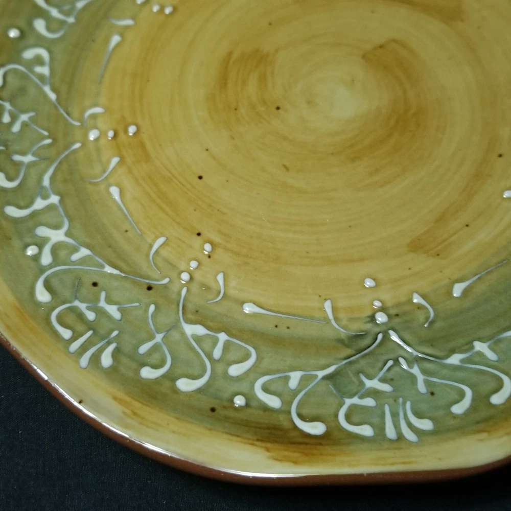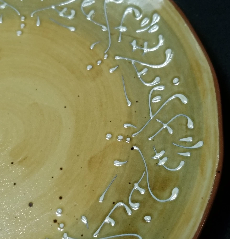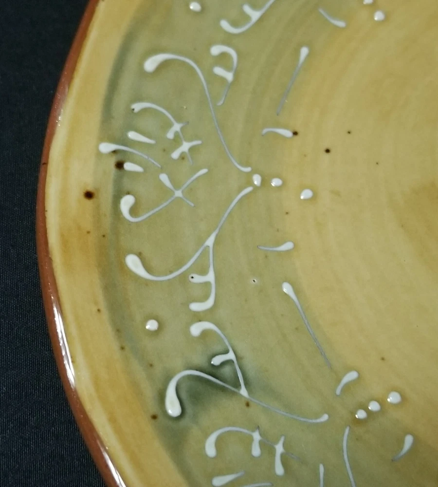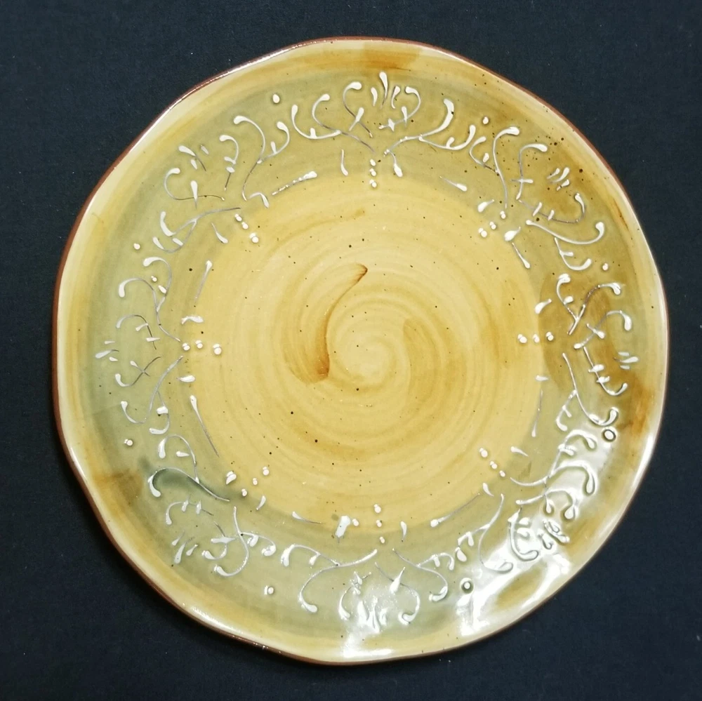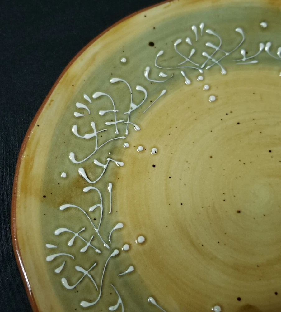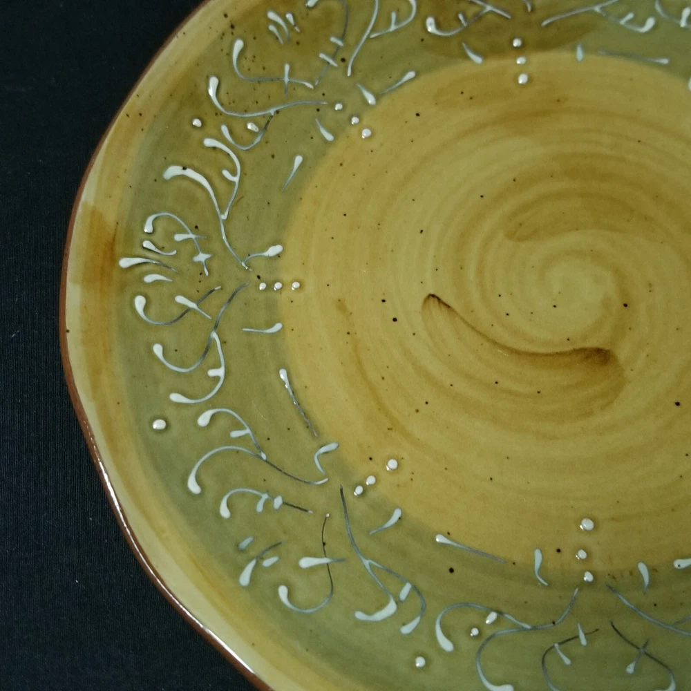 Add a touch of contemporary style to your dinnerware collection with this Pier 1 Imports Maroma Salad plate (s) Listing is for one Plate 6 available they are all in Excellent Condition no Chips or Cracks some Light Utensil Marks/Wear and Light Crazing see Photos for Detailed Description of Condition. The plates are approximately 8" in diameter they weight Approximately 1 lb. Each they feature an embossed white scroll pattern on a glossy terracotta base in amber, tan, green, and white hues. They are dishwasher and microwave safe, making them perfect for everyday use and all occasions.