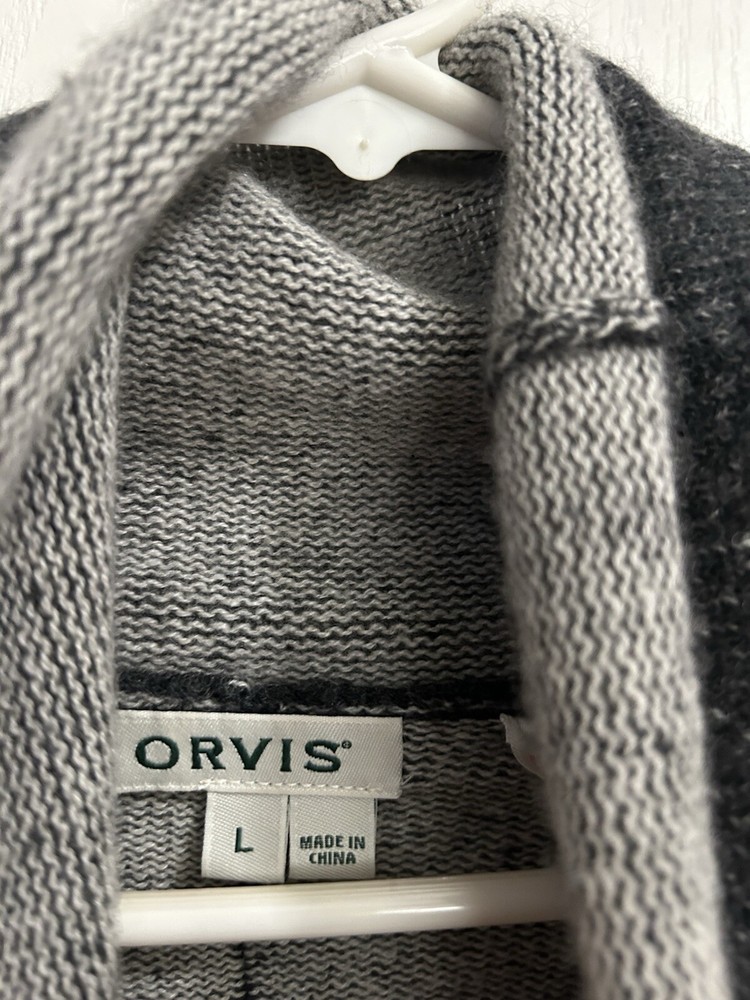 This is a cozy and soft Orvis sweater for women in size Large. It features a cowl neck, long sleeves, and a solid gray color. Made from a comfortable cotton blend material, this pullover style sweater is perfect for staying warm and stylish. Very Good Condition Shipped USPS