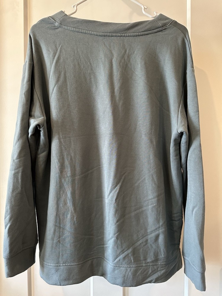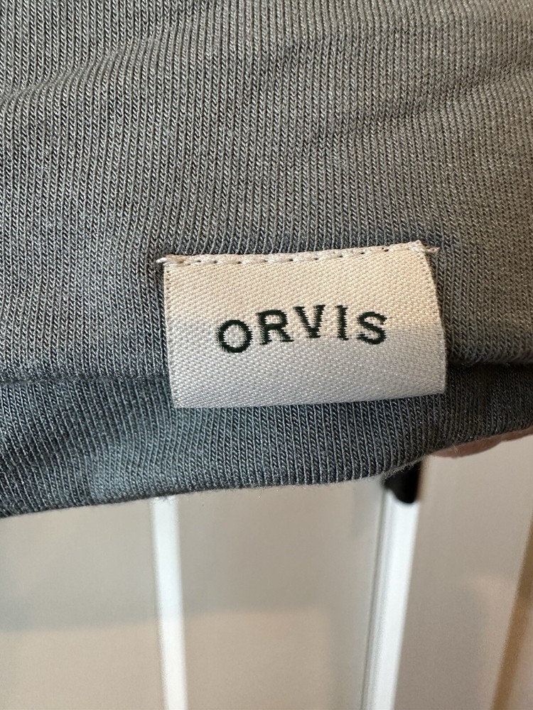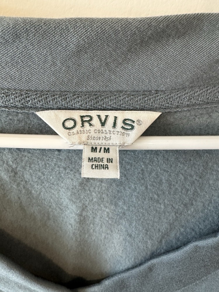 This Orvis sweatshirt is a soft fleece pullover in blue, featuring a V-neck with a large rim and a relaxed fit. It has long sleeves with dropped shoulders for a comfortable and cozy feel. Made of a modal blend with spandex and polyester, this sweatshirt is machine washable and suitable for casual or activewear occasions, perfect for winter, fall, and spring seasons.