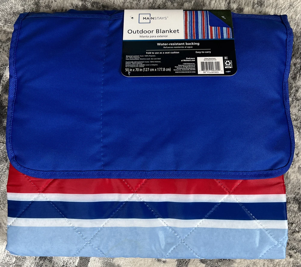 Get ready for your next outdoor adventure with this Mainstays Outdoor Blanket. Perfect for picnics, beach trips, and outdoor sports, this blanket is made of durable polyester material with a water-resistant bottom. The blanket measures 50 inches by 70 inches and features a patriotic red, white, and blue striped design. Easily portable with a convenient travel strap, this modern picnic blanket folds easily for convenient storage. The machine-washable feature ensures that cleaning this blanket will not be a hassle. With its California Prop 65 Warning-free status, this outdoor blanket is a safe and comfortable choice for all your outdoor activities.