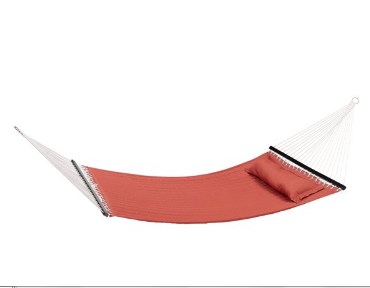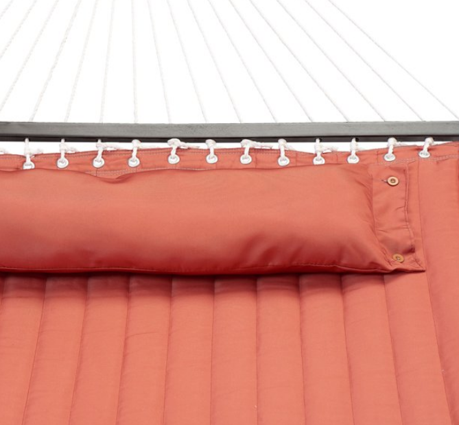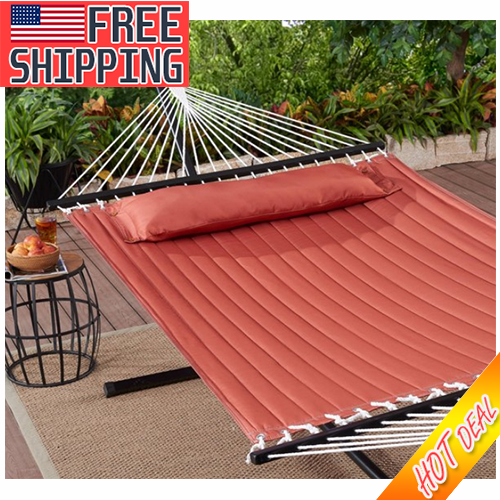 Outdoor Camping Quilted Double Hammock w/ Pillow 445 lb Capacity Heavy duty NEW Brand New In Box | Peace of Mind | 100% Customer Satisfaction 30 Day Returns Available (Re-Stocking Fee May Apply) **IMPORTANT NOTICE** Please advise that the shipping times for this item is less than what is advertised on the listing. The listing shows estimated delivery times between one to two weeks from the time of the order being placed. The delivery time for this item is actually less than one week. We process ALL orders within two business days. If you have any questions at all please message us and we will be happy to assist you further. Thank you for your business! Relax with a friend in the Mainstays Terracotta Quilted Double Hammock with Pillow. Sized to comfortably hold two adults, you can set up this hammock just about anywhere: in your backyard, on the deck, or under your favorite tree. This full-size Tree hammock comes complete with a matching bolster pillow so you have a comfortable place to relax, read, or nap outdoors. Made from a durable polyester in a pretty orange red color, the Mainstays Terracotta Quilted Double Hammock with Pillow has durable rope construction, macrame ends, and strong hardwood spreader bars that make it easier to get in and out. Quilted hammock with bolster pillow holds two adults Comfortable hammock is perfect for outdoor relaxation and fun Includes matching pillow to cradle your head for total relaxation Pillow can be buttoned into place or removed for easy cleaning Made from durable, quilted polyester fabric in terracotta Ropes with macrame ends securely connect to spreader bars Heavy-duty spreader bars are made from durable hardwood Hammock measures 55" wide and 135" long to comfortably hold two adults Hang in backyards, decks, patios, porches, and more Some assembly needed Hammock Stand Not Included 100% Polyester Holds up to 445 lb. Includes 2 chains and 2 S-hooks for easy hanging Dimensions:135"L x 55"W x 0.79"H Shipping & Handling We offer fast standard shipping to the lower 48 states and ship within 3-5 business days after payment is cleared, usually sooner. We do not accept P.O. Boxes. Please provide a physical address. Due to high shipping fees, we add a surcharge to the States of CT, DC, MA, MD, MS, and TN. Return Policy We hope you love what you purchased, but if something isn?t right, let us know, please. We want you to be completely satisfied with your purchase from us. We offer a 30-Day Return Policy on items in which you are not completely satisfied with. Items must be in new, unused condition, and is in the same packaging when received. Please contact us for a Return Merchandise Authorization (RMA) and a return shipping address. We advise you to use a reputable shipping carrier service when returning your goods. Please pack all returns appropriately. ALL original contents MUST be present when returned . Customer Satisfaction If you have any problem with your purchase please contact us first! We strive to make every customer experience positive and we will work with you until you are completely satisfied. Our team members here take pride in ensuring that all of our customers are completely satisfied with their orders made through us. Your satisfaction is very important to us! If you have any problems at all with your order, please contact us and we will do our very best to make it right so you are completely satisfied with your order. As long as you are happy with your purchase, please leave positive feedback for us. We would greatly appreciate it! Payment We accept Credit Cards, Debit Card, Apple Pay, Google Pay, and PayPal only. Immediate Payment is required! THANK YOU FOR YOUR BUSINESS!! **IMPORTANT NOTICE** Please advise that the shipping times for this item is less than what is advertised on the listing. The listing shows estimated delivery times between one to two weeks from the time of the order being placed. The delivery time for this item is actually less than one week. We process ALL orders within two business days. If you have any questions at all please message us and we will be happy to assist you further. Thank you for your business!