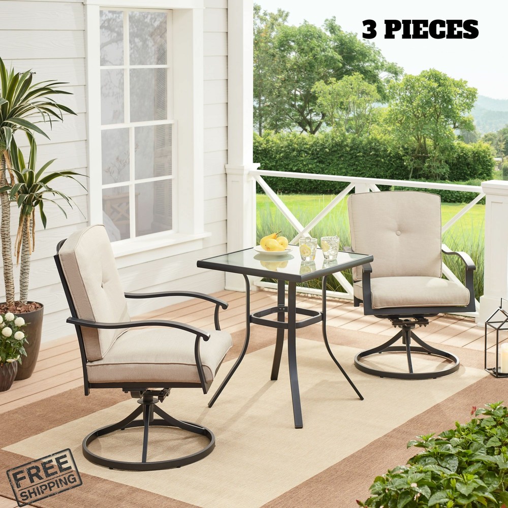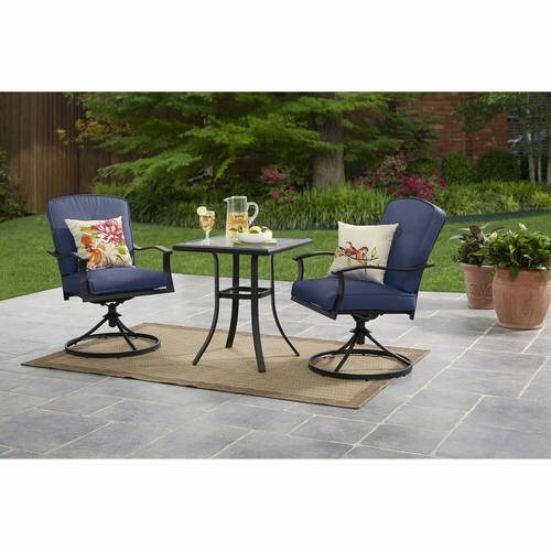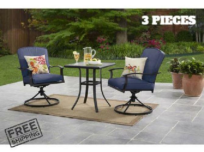 Outdoor Patio Bistro Set Swivel Rocking Chair Table Set Of 3 Chair Furniture Set Get more enjoyment out of your deck, patio, porch, garden, and other outdoor areas with the Belden Park 3-Piece Outdoor Patio Bistro Set. The set is crafted with sturdy steel frames for you and a friend to have a pleasant conversation on two chairs with button tufted back cushions and a tempered glass top table to hold drinks, snacks reading materials, and more. Easily assembled with the included instructions, the Belden Park 3-Piece Outdoor Patio Bistro Set is a great way to help transform your outdoor living area and is just one part of the entire Belden Park collection of outdoor furniture (other pieces sold separately). Available in Red, Beige, and Blue. 3-Piece Outdoor Patio Bistro Set 3 piece outdoor patio bistro set Chairs feature button tufted back cushions Tempered glass top side table Durable steel frame for a long life 1 part of the entire Mainstays Belden Park collection of outdoor furniture (other pieces sold separately) Easily assembled with the included instructions Chair weight capacity 250 lbs. Easy to care for: use a mild solution of soap and water; pat out excess moisture with dry towel after rinsing; air dry. Never use bleach or strong solvents for cleaning. Available in Red, Beige, and Blue Arrives in 1 box Shipping dimensions: 29.92” x 26.38” x 26.77” Assembled Product Dimensions (L x W x H) 90.00 x 39.00 x 37.00 Inches Shipping Fast shipping is very important for us. Our standard US shipping service is FREE. Your order will be shipped within 2-3 business days upon full payment received. Your order will be delivered within 2-3 business days after the handling time. We only ship to the confirmed Paypal address. We reserve the right to cancel any order for any reason at any time. We are not responsible for undeliverable addresses. Returns and payment We offer a 30 days return policy from checkout winning date. We allow only PayPal as payment method FeedBack Your feedback very important to us, after you get your package and you are satisfied with our service please leave us positive feedback If you have any problem with your order / any questions please before leave any type of feedback For any questions, using eBay contact system Please visit our eBay store to check out other items for sale! Thank you for shopping at our store.