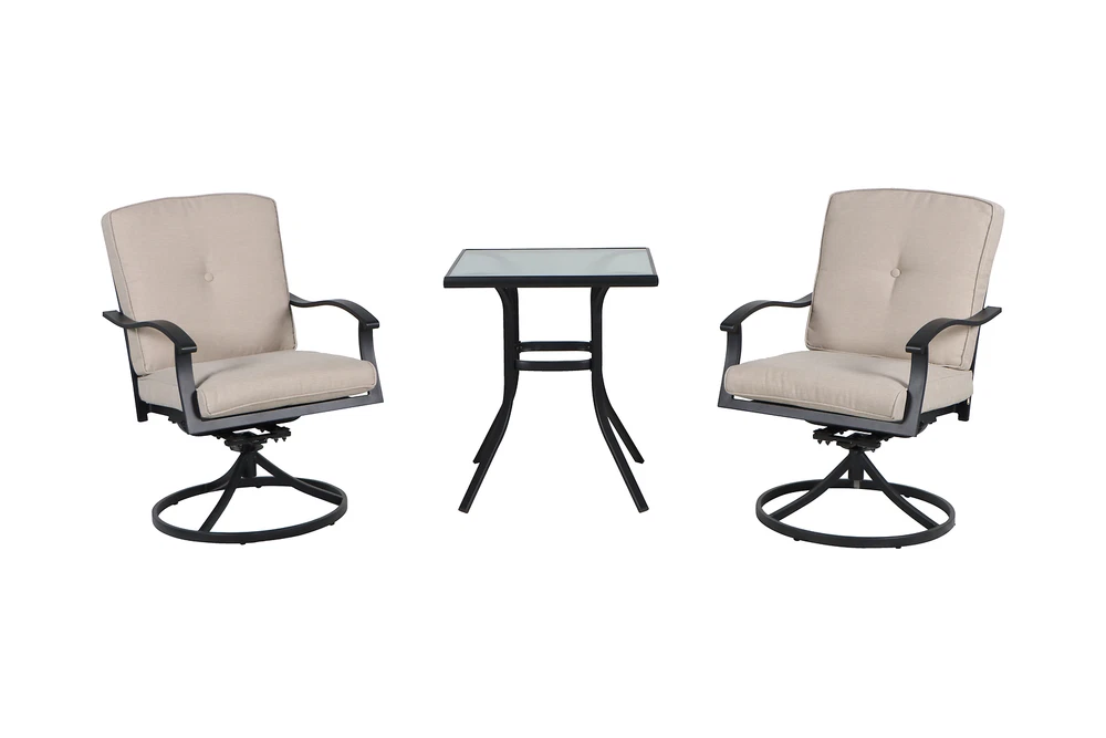 This bistro set is perfect for relaxing outdoors! The swivel rocking chairs are super comfortable with their plush cushions, and the glass-top table is sturdy yet stylish. Assembly was quick and easy, and the steel frame feels durable. Love spending mornings with coffee or evenings with drinks on my patio—great value for the price!