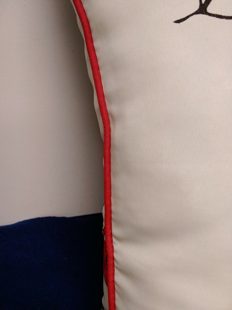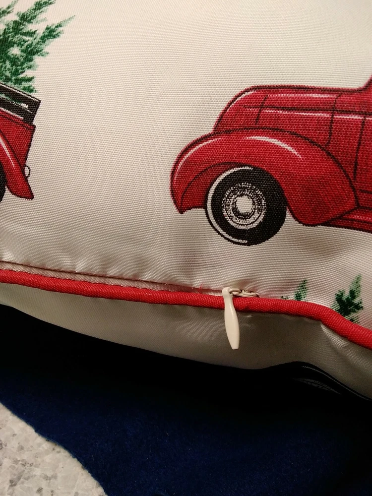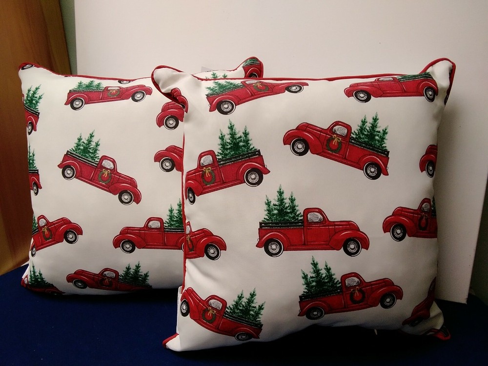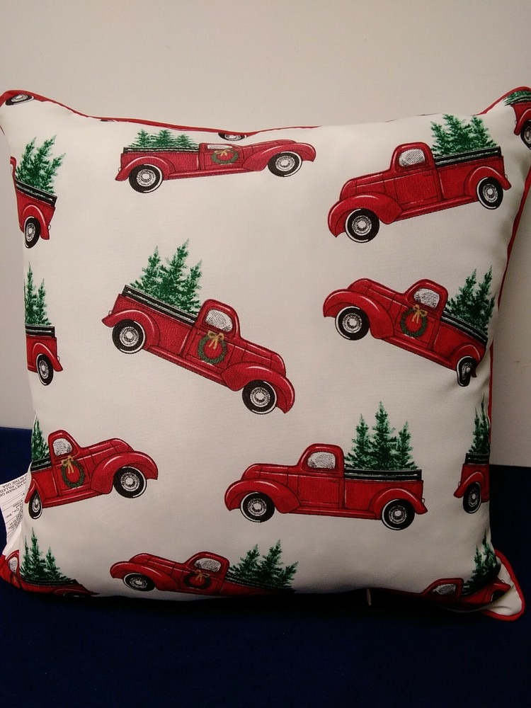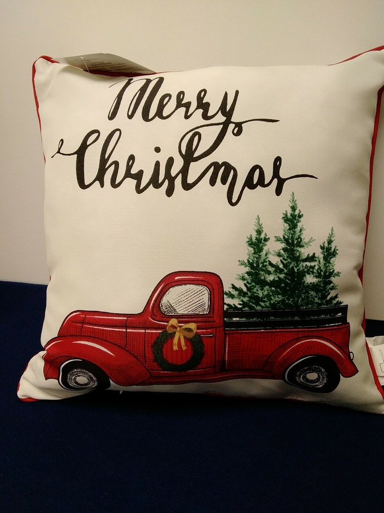 New Outdoor Pillows Ivory Red Pick-Up with Tree 16X16 Set of 2 "Merry Christmas" * 100% Polyester * Fade Resistant Fabric * Surface Wash Only * Back Side Red Pick Ups with Christmas Trees * Zip for Closure * Red Trim