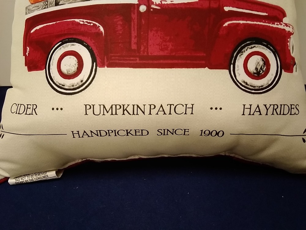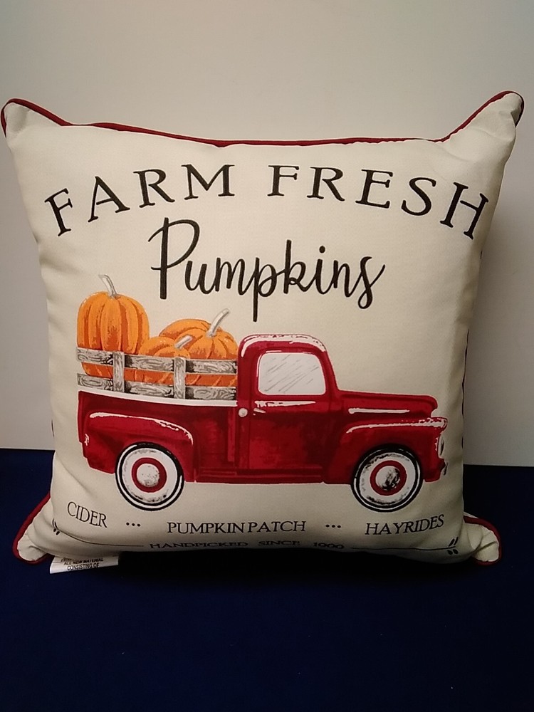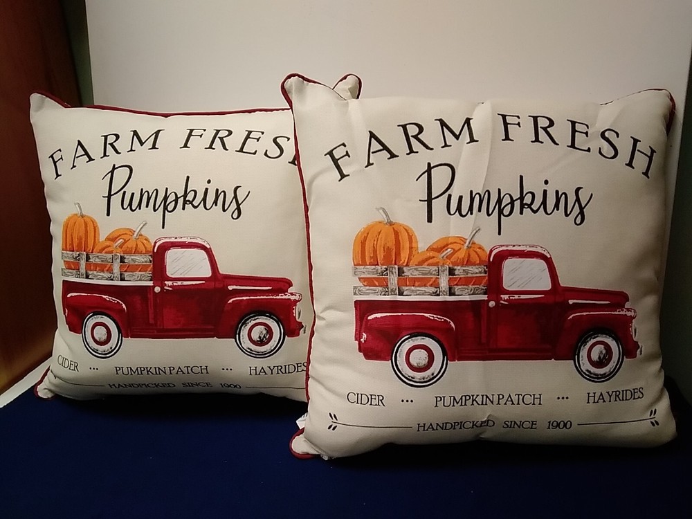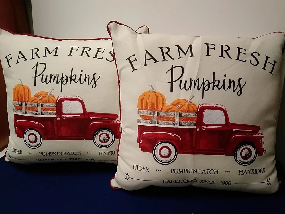 New Outdoor Throw Pillows Set of 2 Ivory with Red Pickup Carring Pumpkins "Farm Fresh Pumpkins" * Polyester 16X16X5 Inches * Zipper * Fade Resistant Fabric * Same on Both Sides: Red Pick Up carring Pumpkins "Farm Fresh Pumpkins"