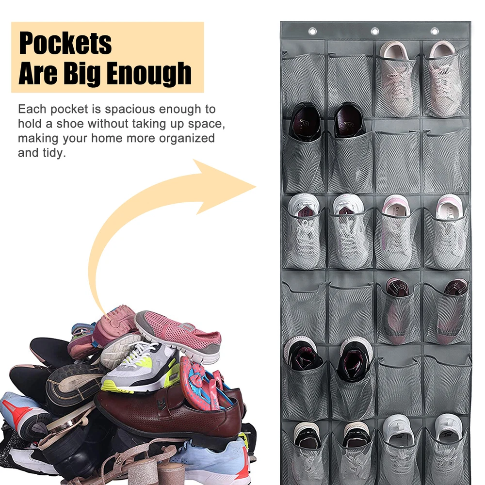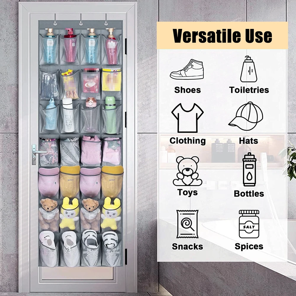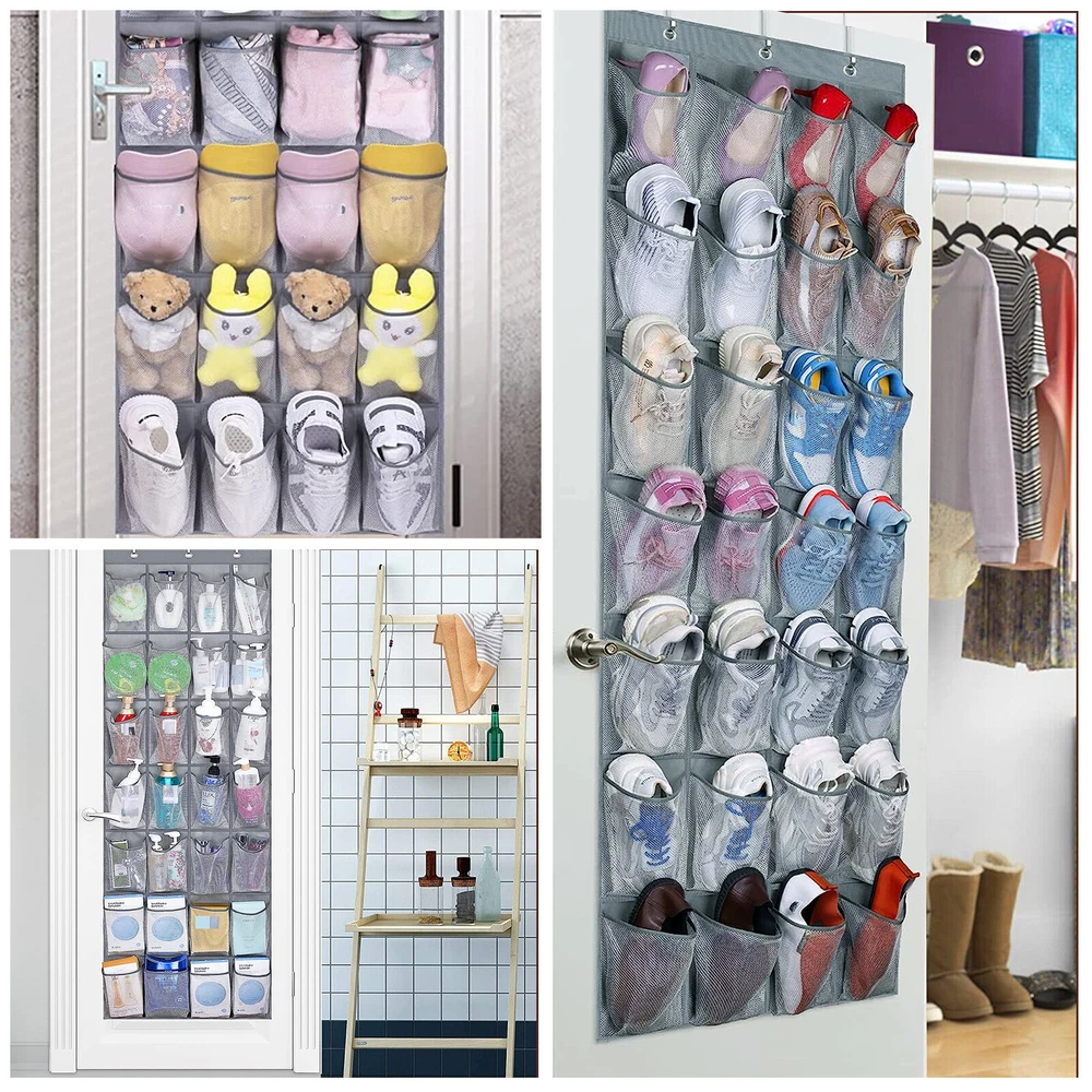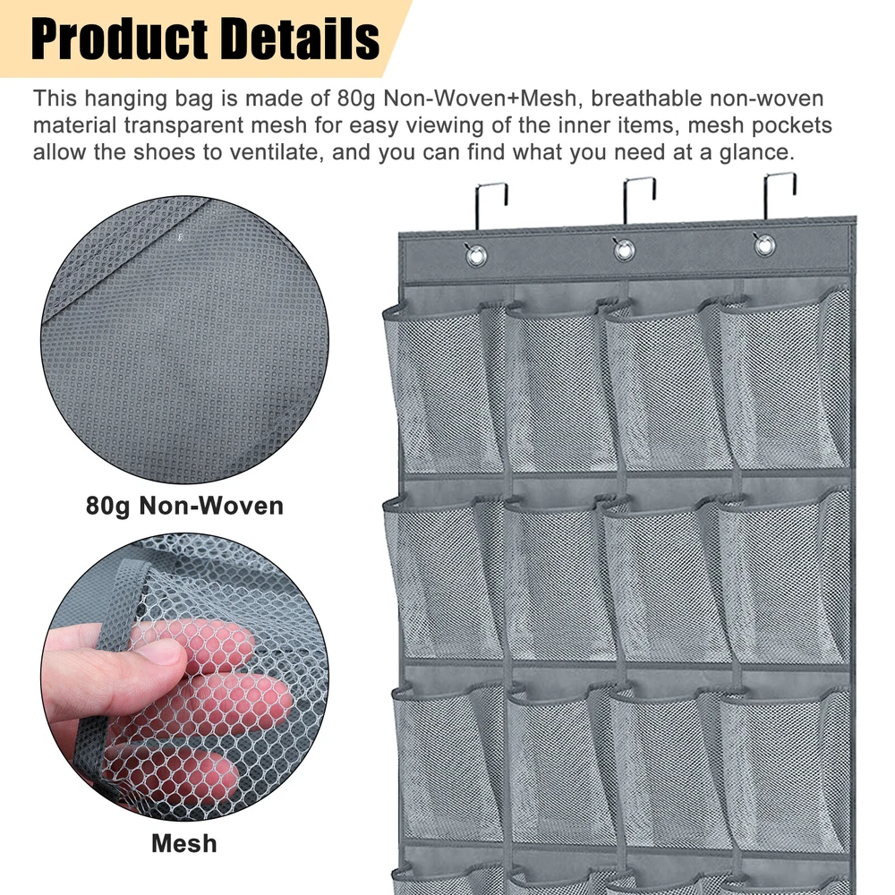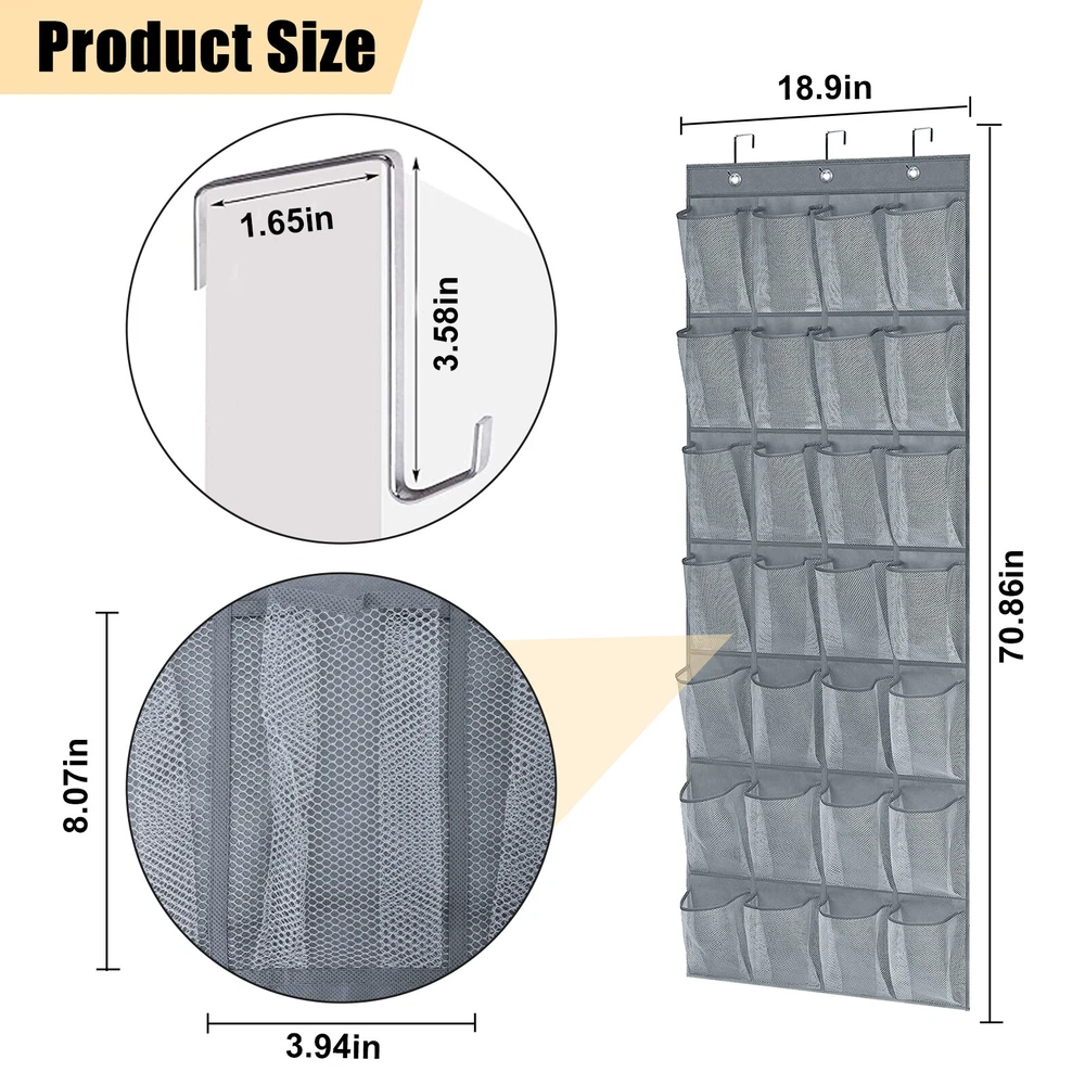 Product Features ✨【 Premium Material 】 This hanging bag is made of breathable non-woven material combined with transparent mesh for easy viewing. The mesh pockets allow shoes to ventilate, ensuring easy identification of items. ✨【 Plenty of Pockets 】 With a total of 28 large pockets, this organizer hanger can hold up to 14 pairs of men's shoes, including tennis shoes, sneakers, or 28 pairs of slippers, flip-flops, sandals, high heels, children's shoes, and more. ✨【 Spacious Pockets 】 Each pocket is generously sized to accommodate a size 13 men's shoe or a pair of kid's shoes without occupying excessive space. This feature allows for a more organized and tidy home. The dimensions of each pocket are 8.07in L x 3.94in W. ✨【 Fits Door Size 】 The hanging bag includes 3 metal hooks for easy installation and fits most standard doors with a thickness ranging from 1.37 to 1.65 inches. Rest assured that you can close the door without any issues. The overall size of the bag is 48x180cm (18.9x70.86in). ✨【 Versatile Use 】 This storage hanging bag is not only suitable for behind-the-door use but also ideal for organizing other items such as socks, hats, accessories, and more. It is perfect for storage rooms, walls, closets, dorms, bedrooms, kids' rooms, and more. Product Specification Type Door Rear Storage Hanging Bag Quantity 1 Material Non-Woven+Mesh Color Gray Number of Pockets 28 Size 48x180cm (18.9x70.86in) Features Plenty of pockets, with hooks, transparent mesh Applicable Wall-Mounted, Bathroom Wall-Mounted, Wardrobe Hanging Package Included ✅ 1 x 28 Compartment Storage Bag ✅ 3 x Hooks Location Description To improve your buying experience and ensure fast delivery, Your order will be shipped from the warehouse located in either new jersey or california that is closest to your address. If you have any questions, Please contact us. Thank you for your support ! Support & Share