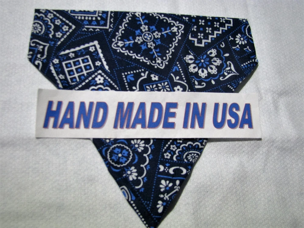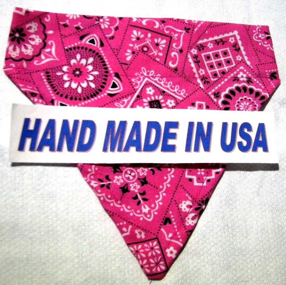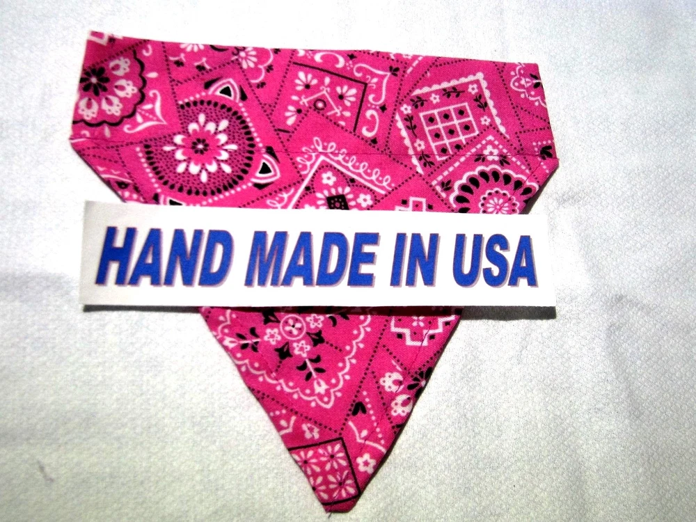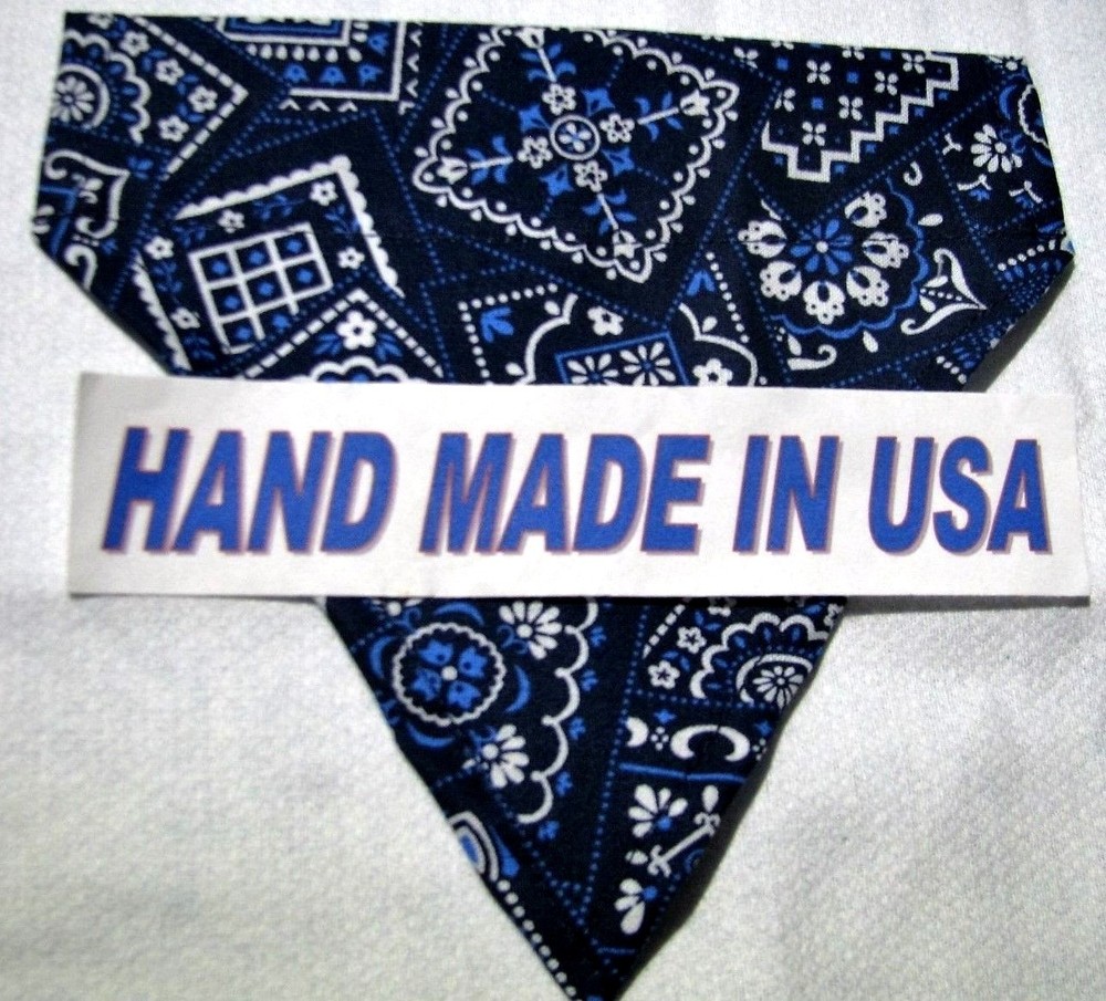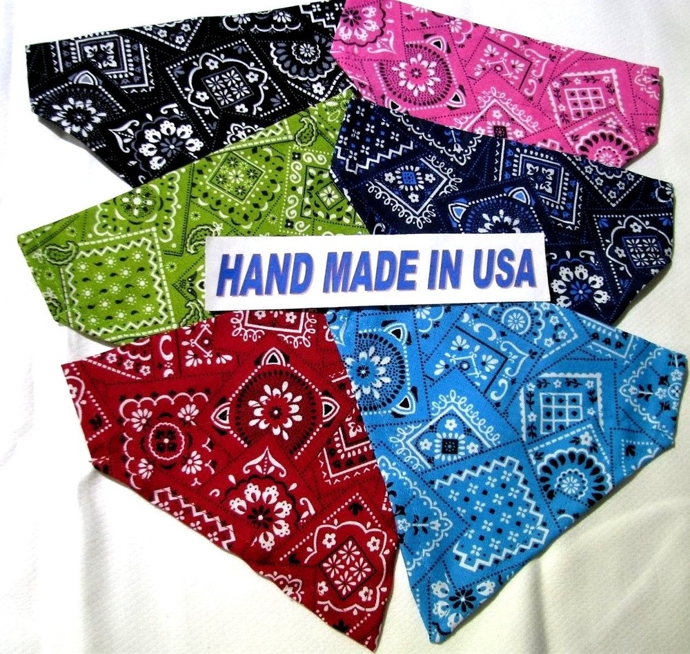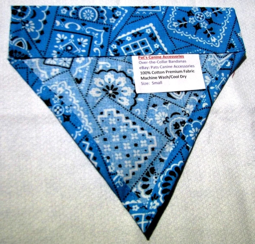 Proudly Offers our Collection of THE CLASSICS Over-the-Collar/No-Tie Bandanas 'Collect them all' Great classic colors, Red, Pink, Black, Green, Navy and Light Blue No-Tie Bandanas slip over your Dog or Cat's collar No Tying No Knots No Trying to Keep your Pup or Kitty still while you put the bandana on No Fraying - All edges are Hemmed (No raw edges) Premium Cotton Fabrics Machine Wash and Dry Always in the right place around the neck Proudly Hand Made in the U.S.A. Please be aware that the bandanas cover about half of your dog or cat's neck. Neck Measurements are: Bandanas are approx: Extra Small: 10-12" Neck 51/2 " wide ¾" Collar Small: 11 - 14" Neck 61/4" wide 1 1/4" Collar Medium: 12 - 16" 7 1/2" Wide 1 ½ " Collar Large : 15 - 24" Neck 10" Wide 1½" Collar We also have groomers' packages available starting at 30 pieces. Please contact us for pricing and size breakdown. We appreciate your interest in our products, and please Check out my other items ! and please, Be sure to add me to your favorites list ! Thanks, Pat