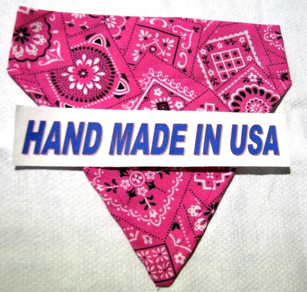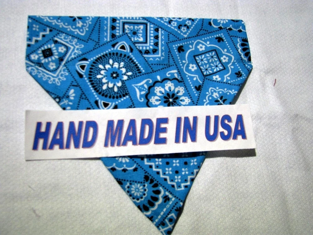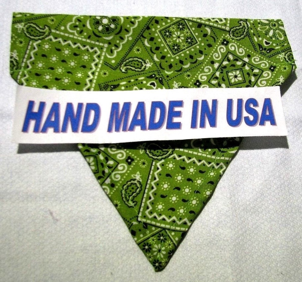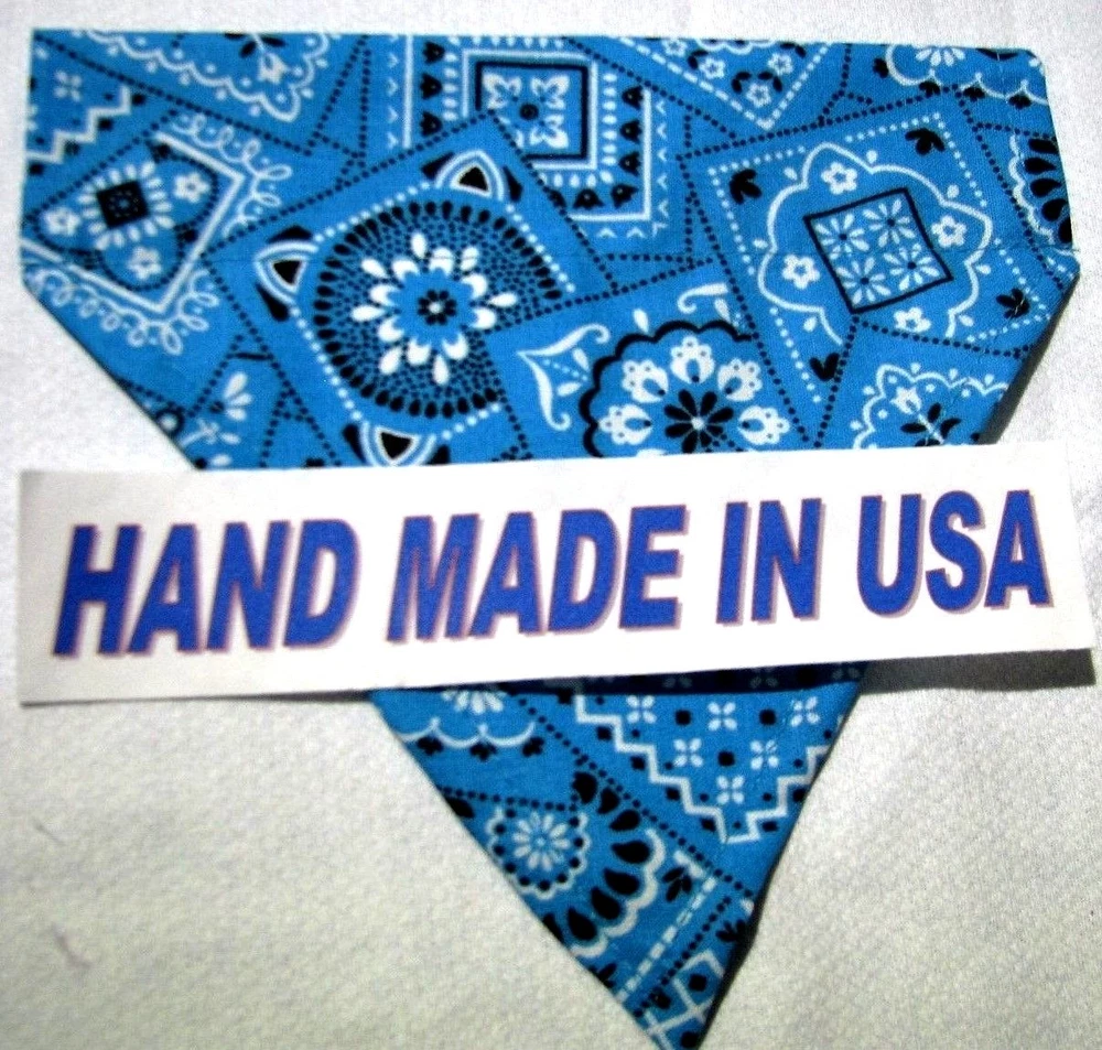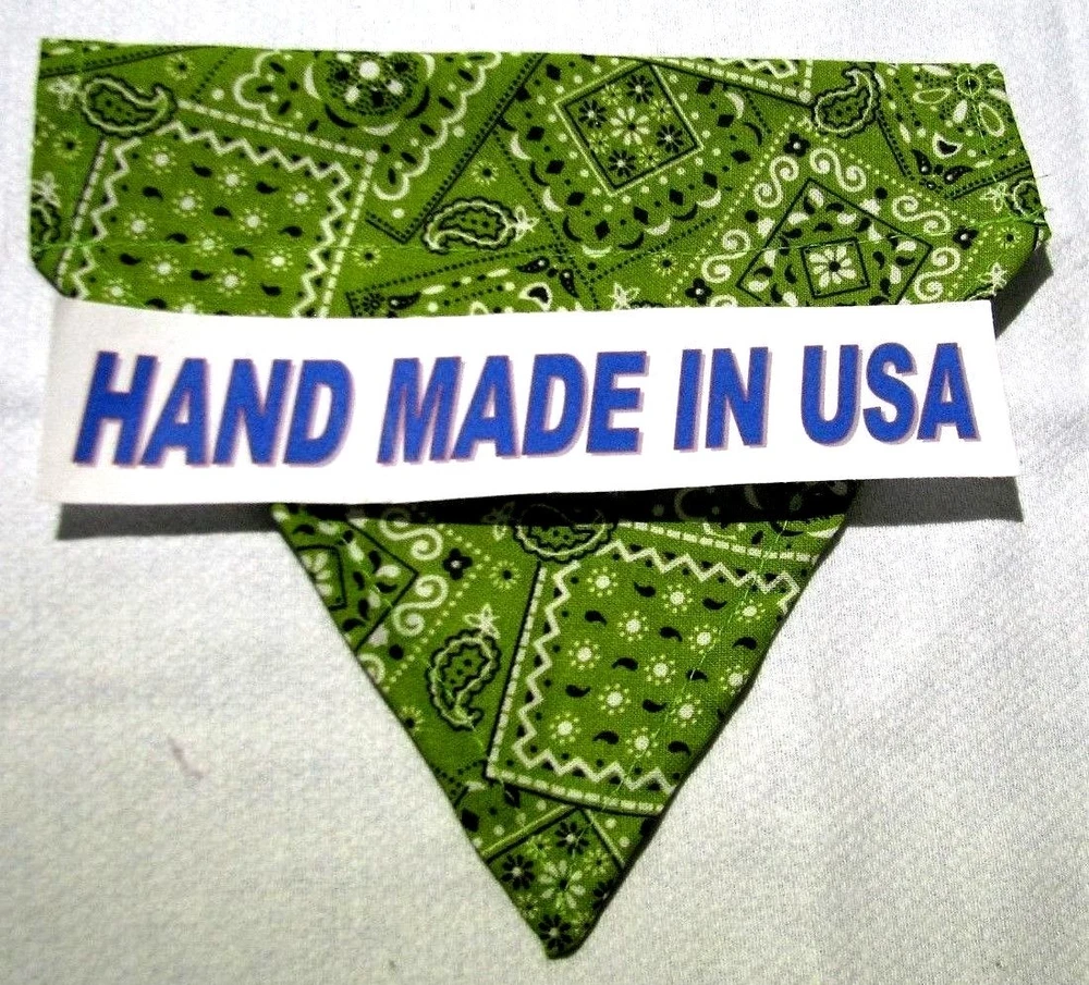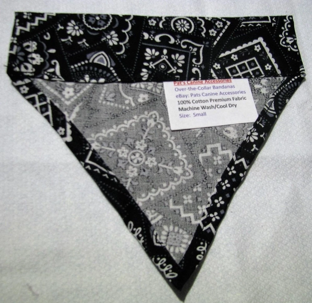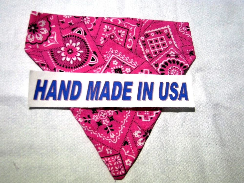 Proudly Offers our Collection of THE CLASSICS Over-the-Collar/No-Tie Bandanas 'Collect them all' Great classic colors, Red, Pink, Black, Green, Navy and Light Blue No-Tie Bandanas slip over your Dog or Cat's collar No Tying No Knots No Trying to Keep your Pup or Kitty still while you put the bandana on No Fraying - All edges are Hemmed (No raw edges) Premium Cotton Fabrics Machine Wash and Dry Always in the right place around the neck Proudly Hand Made in the U.S.A. Please be aware that the bandanas cover about half of your dog or cat's neck. Neck Measurements are: Bandanas are approx: Extra Small: 10-12" Neck 51/2 " wide ¾" Collar Small: 11 - 14" Neck 61/4" wide 1 1/4" Collar Medium: 12 - 16" 7 1/2" Wide 1 ½ " Collar Large : 15 - 24" Neck 10" Wide 1½" Collar We also have groomers' packages available starting at 30 pieces. Please contact us for pricing and size breakdown. We appreciate your interest in our products, and please Check out my other items ! and please, Be sure to add me to your favorites list ! Thanks, Pat