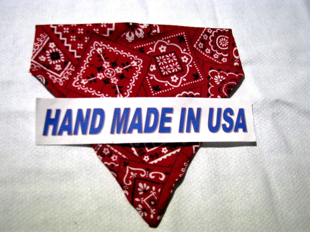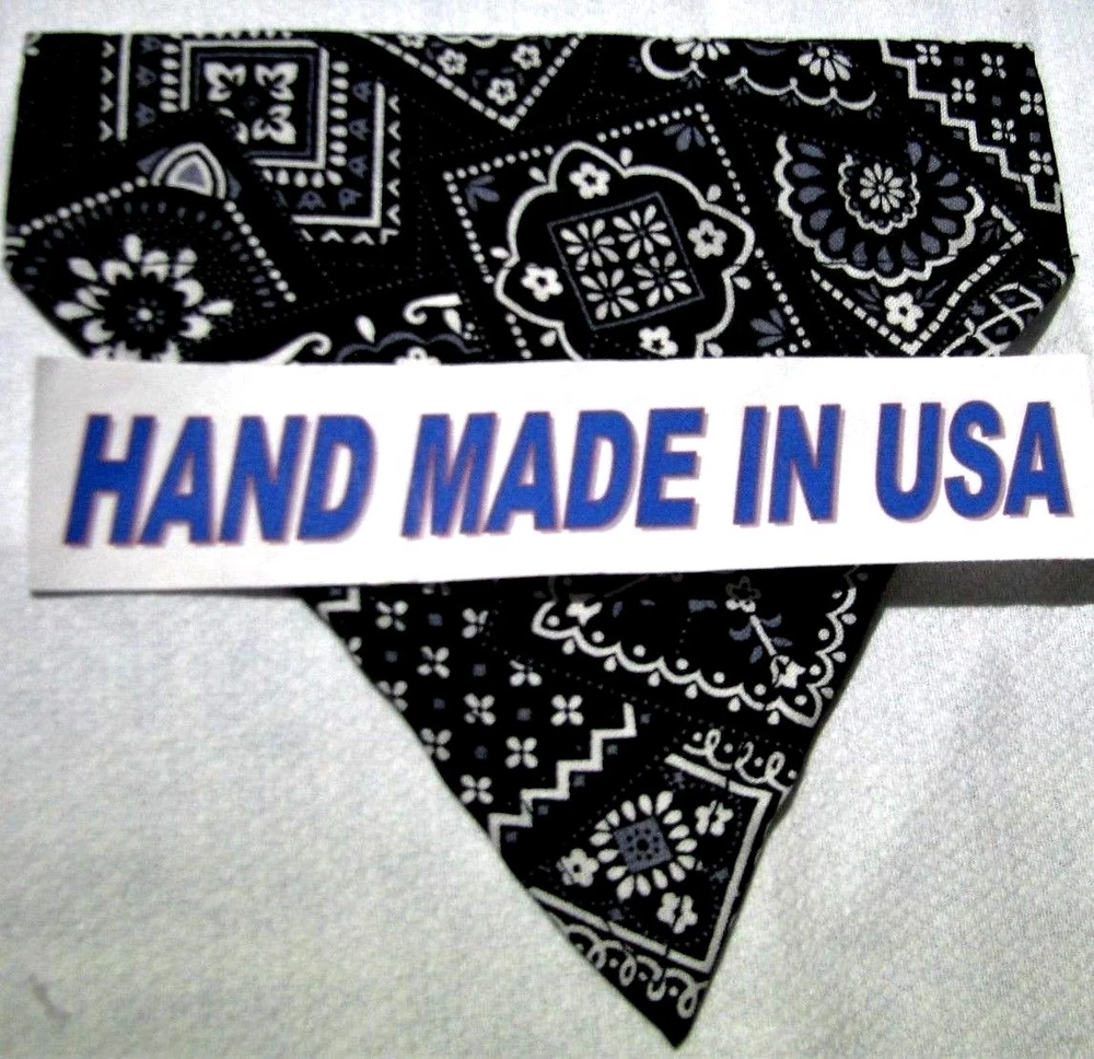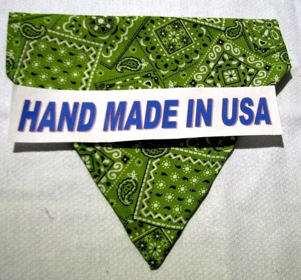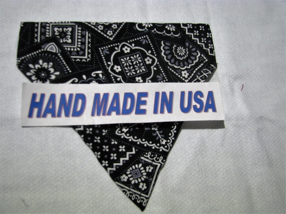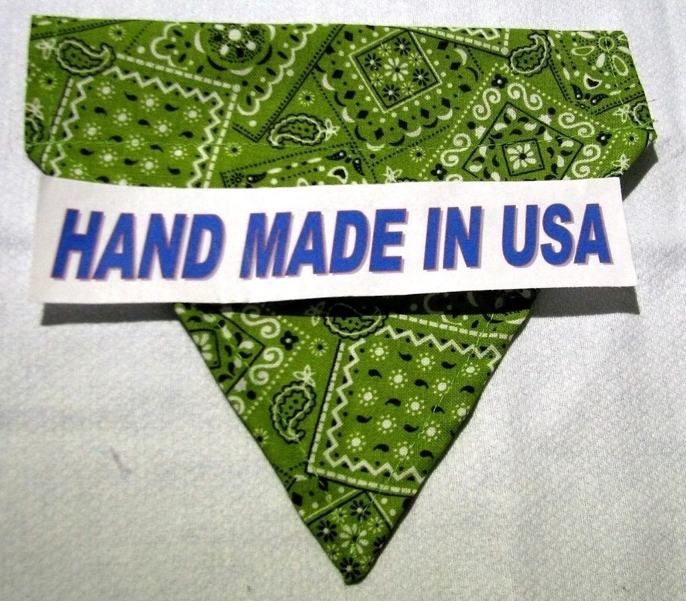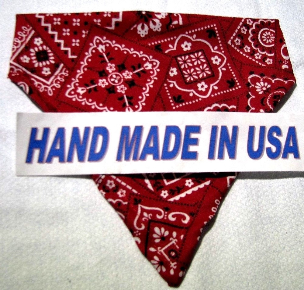 Proudly Offers our Collection of THE CLASSICS Over-the-Collar/No-Tie Bandanas 'Collect them all' Great classic colors, Red, Pink, Black, Green, Navy and Light Blue No-Tie Bandanas slip over your Dog or Cat's collar No Tying No Knots No Trying to Keep your Pup or Kitty still while you put the bandana on No Fraying - All edges are Hemmed (No raw edges) Premium Cotton Fabrics Machine Wash and Dry Always in the right place around the neck Proudly Hand Made in the U.S.A. Please be aware that the bandanas cover about half of your dog or cat's neck. Neck Measurements are: Bandanas are approx: Extra Small: 10-12" Neck 51/2 " wide ¾" Collar Small: 11 - 14" Neck 61/4" wide 1 1/4" Collar Medium: 12 - 16" 7 1/2" Wide 1 ½ " Collar Large : 15 - 24" Neck 10" Wide 1½" Collar We also have groomers' packages available starting at 30 pieces. Please contact us for pricing and size breakdown. We appreciate your interest in our products, and please Check out my other items ! and please, Be sure to add me to your favorites list ! Thanks, Pat