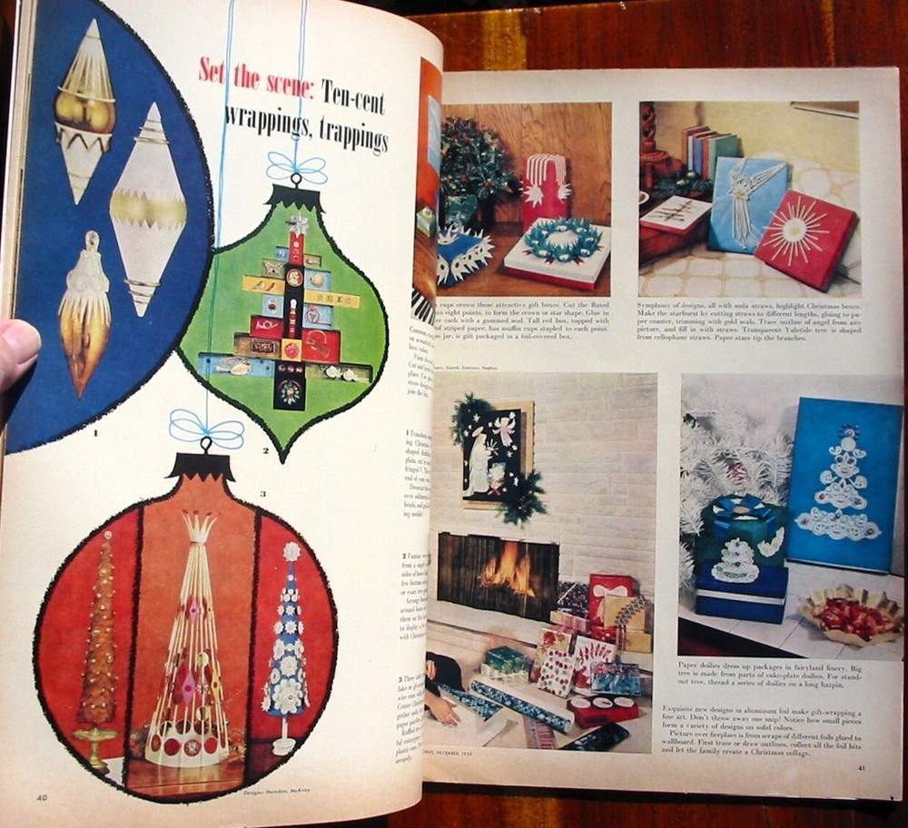 I'm a magazine addict. Nothing makes me happier than getting a bunch of new magazines. Except maybe a bunch of new magazines and a cupcake. The thing is I look at them for 15 minutes and then put them away. So now I have all these great magazines that someone else could surely enjoy. So this is your chance to get some nice magazines at a great price. If you like Mid-century and retro kitsch you'll like this magazine. It's kind of like everything old is new again and you'll find tons of things that are fun and appropriate for now. Make some decorations or food that isn't what everybody else is doing! 116 pages. Original price was just 35 cents. Better Homes and Gardens Dec 1955. Out of print and hard to find. 12 1/2 by 9 3/4 inches. There are some really interesting recipes and projects in this magazine. This issue is absolutely amazing with an article detailing how to create a home style smorgasbord, tuna star salad, cranberry Christmas wreath. Has tons of incredible ads. how to flock a tree, make a tree out of hangers, quick gifts for dad to make (like an entire race car or sailboat--you know QUICK gifts!), (and of course much more) Seems like far more substance than in any recent comparable magazines. Lots of fun stuff! First magazine ships for $5.40 and any additional magazines ship for just 50 cents.