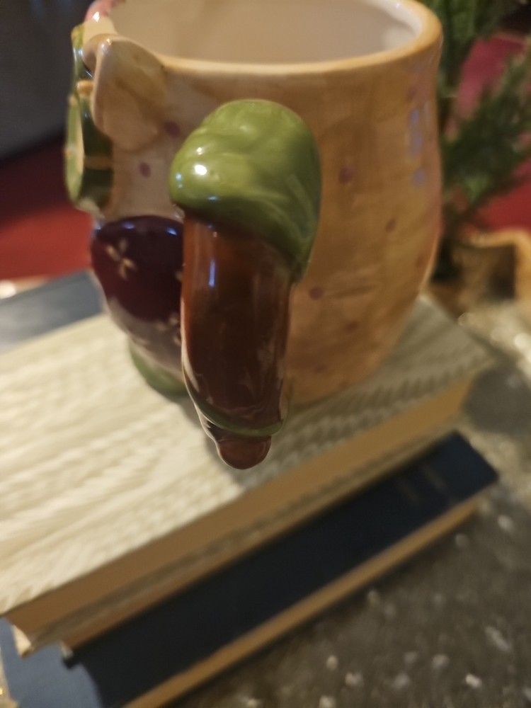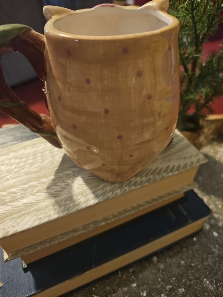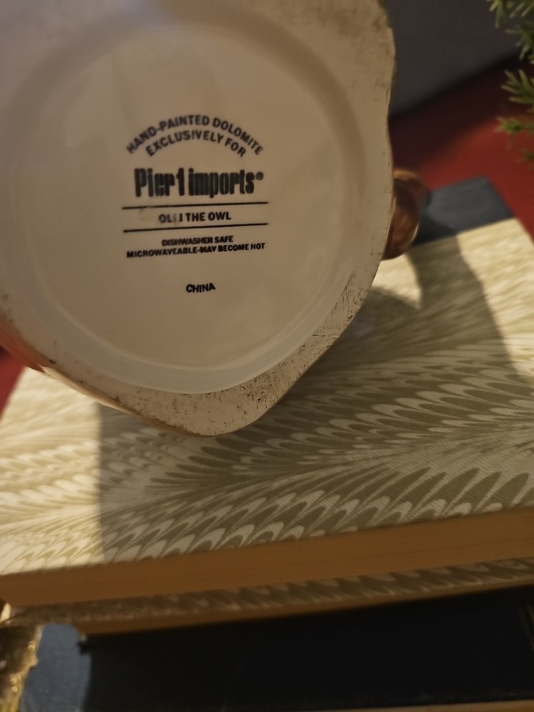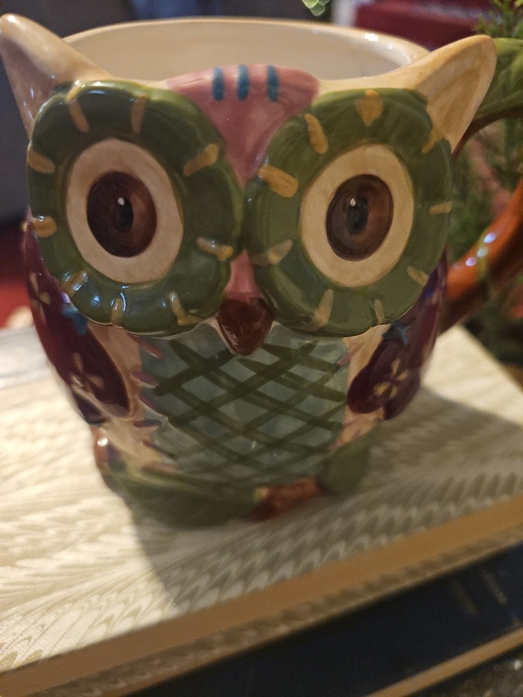 The Owl Mug by Pier 1 Imports, featuring Olli The Owl, is a large 16 oz. coffee mug that is hand-painted with a 3D design. This round mug is perfect for all occasions and can be used for hot or cold beverages. Made of dolomite, ceramic, and porcelain, this art deco style mug weighs 14.4 oz and has dimensions of 4.75 inches in height and 3.5 inches in width. With a colorful owl design and no lid, this unique mug is a collectible item that adds a touch of whimsy to your kitchen or home decor.
