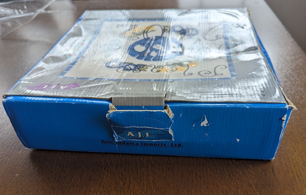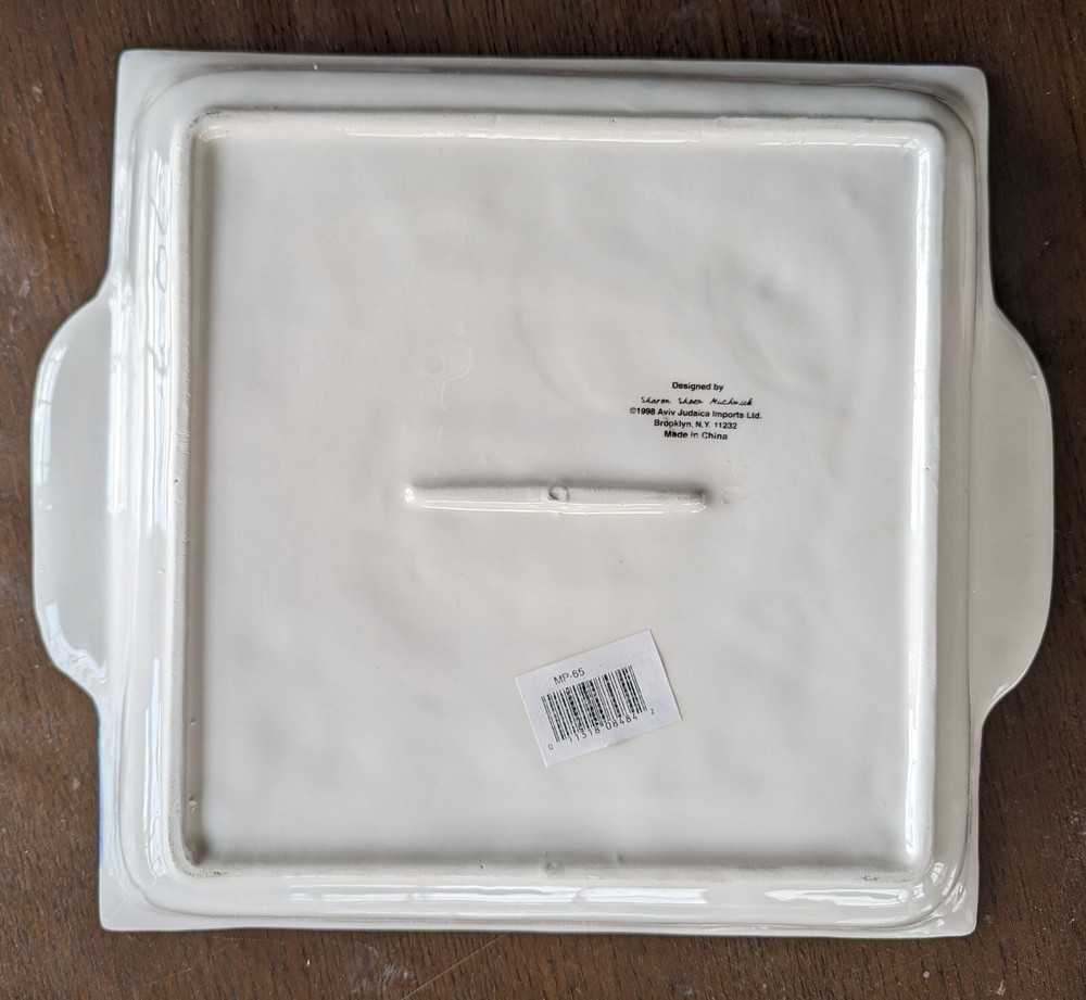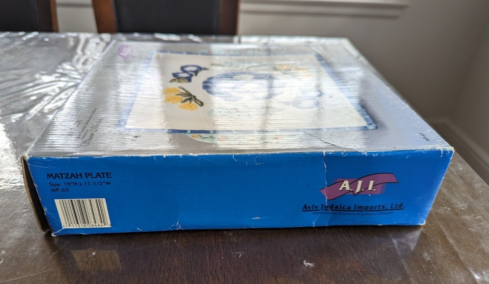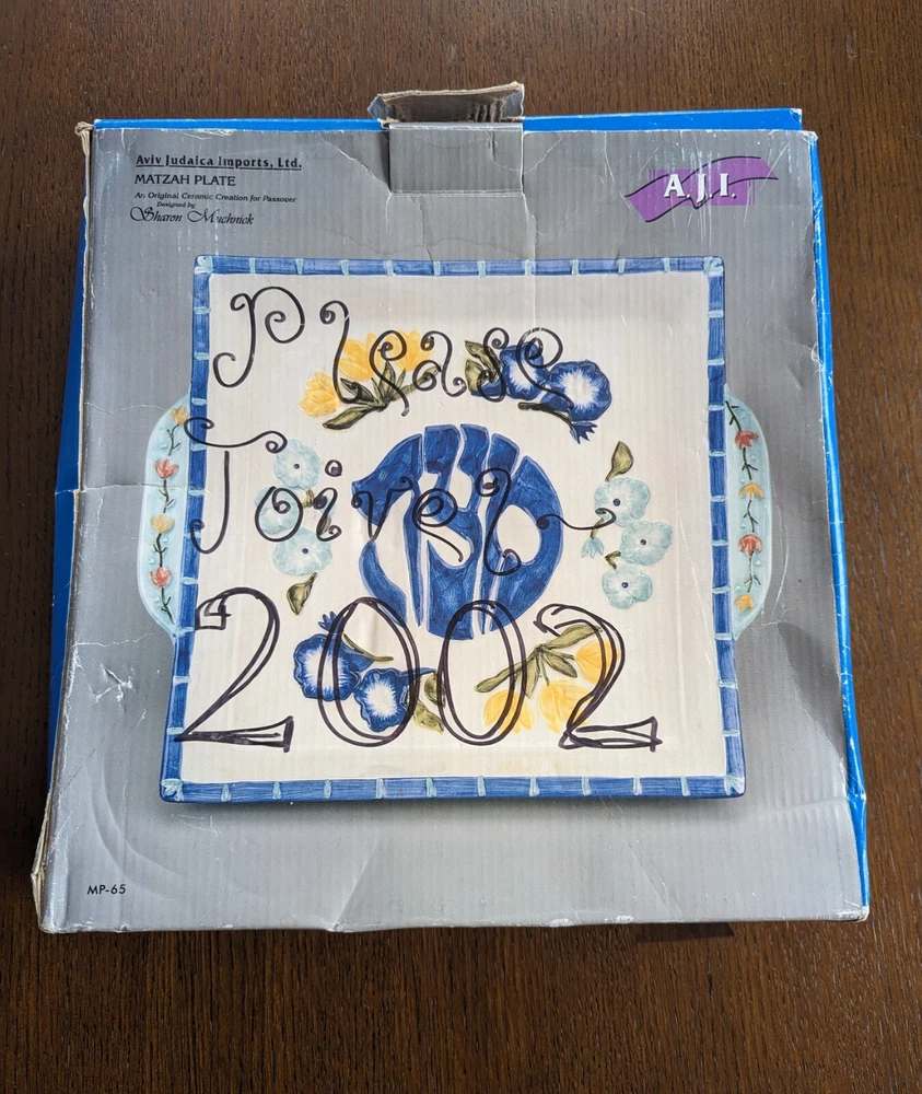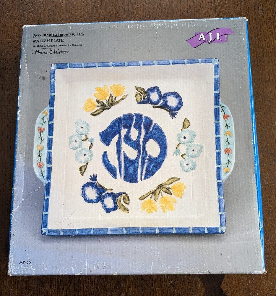 PASSOVER PESACH CERAMIC MATZAH PLATE / TRAY DESIGNED BY SHARON SHOEN MUCHNICK AVIV JUDAICA IMPORTS (AJI) 1999 PLATE IS NEW WITH LABEL, BOX IS DAMAGED Beautiful Passover Pesach Ceramic Matzah Tray / Matzah Plate designed by Sharon Shoen Muchnick, Aviv Judaica Imports (AJI), Brooklyn, NY, 1999. It has bright blue, light blue and yellow flower designs. The middle says “Matzah” in Hebrew letters. The Matzah Plate is new (never used) with label. It is 10 inches high by 11 ½ inches wide including the handles. The box is bent with rips, and someone wrote on one side of the box. Please see pictures for details.