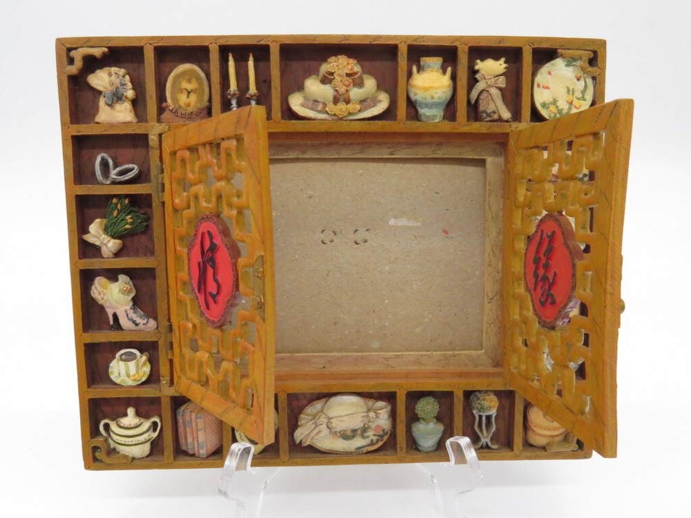 Ornate and unique, this Asian themed Picture Frame shows off your photo memory as surrounded by gorgeously rendered resin objects, such as hats, jewelry, chocolates, etc. The frame holds a 4x6 picture, and the item itself measures approximately 9.5" x 7.75" x 1". (Display stand is not included.) Please note that I have another similar to this. You can see it here, and we can bundle ship: https://www.ebay.com/itm/354197137586 Items mailed via UPS, USPS Priority, or Parcel Select (cheaper, but slower and uninsured), as selected by buyer at checkout. If you want a different service, please ask BEFORE checkout to make the transaction easier. All reasonable offers considered. Know that camera, monitors and lighting can impact perception of color. I've included multiple pictures to ensure you can see what you are getting. Please be advised that items may show signs of normal use such as scuffs, creases, small dings/dents, age marks, dirt, dust, etc. Will be well-packed. Please see other WhimsyNation items, as bundle pricing/shipping is possible! Reach out (via eBay messaging) if you have any questions. Happy to help!
