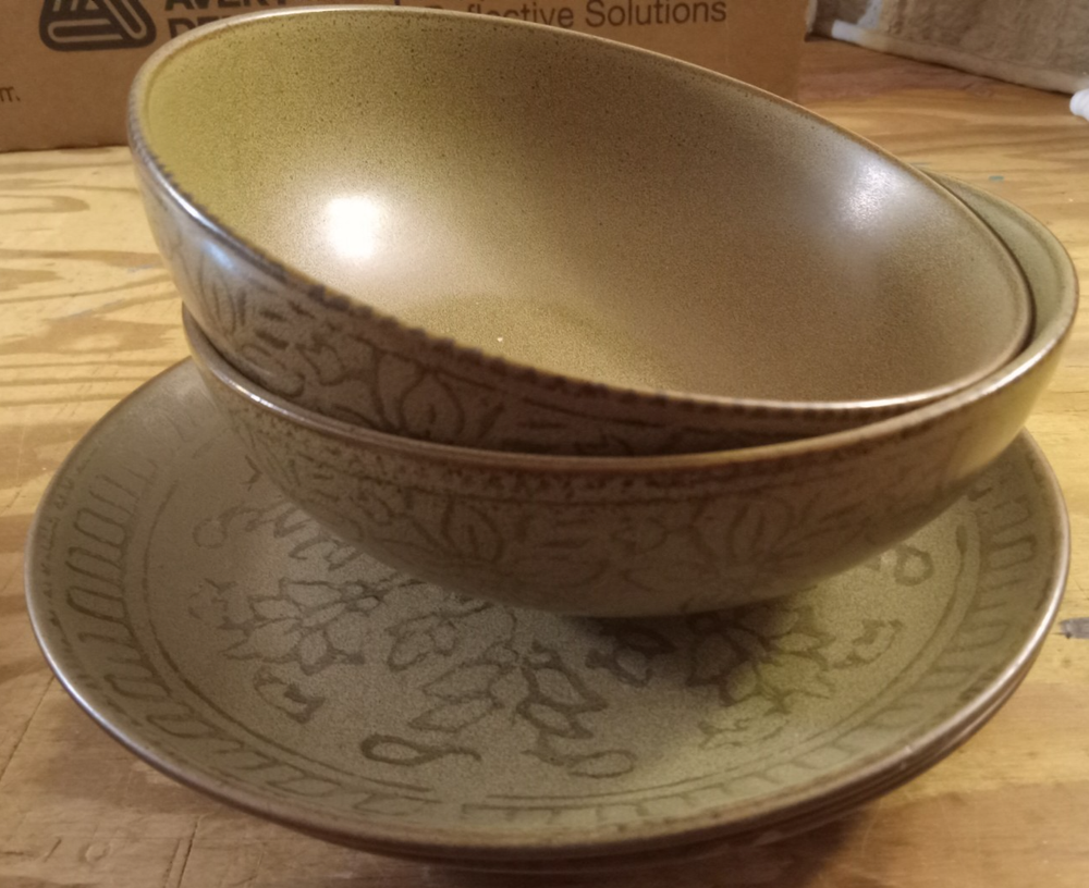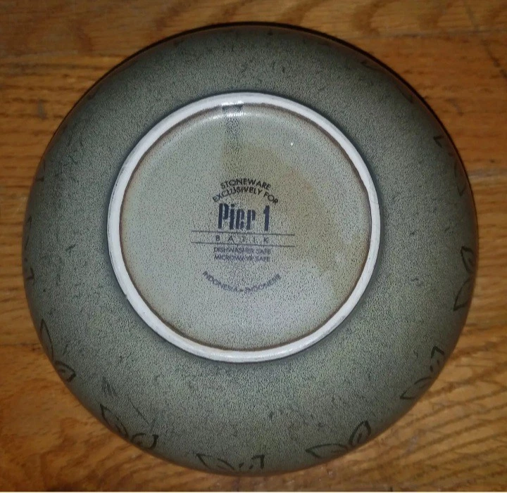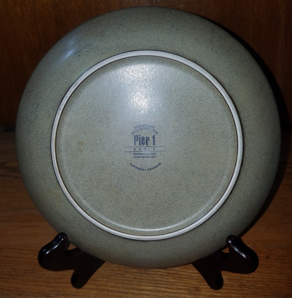 2 salad plates & 2 soup bowls in the moroccan mosaic stamp "batik" pattern made for pier 1. sadly, with the closing of pier 1, this pattern has been discontinued. the batik pattern is characterized by unique, inconsistent stamp like floral pattern in a darker olive green on a speckled olive-green plate with a brown edge. i have taken a bunch of pictures to help give you an accurate idea of the condition. please, please, please look at them and enlarge them. i always try to highlight any flaws with the pictures. they are, by far, the most important part of my ad. please allow for color variations from screen to screen. let's keep it real, colors do vary from device to device. your item has been shipped with shipping insurance. accidents do sometimes happen. if it does arrive damaged or broken, please contact me and we will work through the insurance claim process together. please be sure to include clear pictures of the damage. evidence of damage is needed to make an insurance claim. please remember that this item is used, not new. do not expect new condition at a used price. it may have light markings/wear associated with being used. I try my best to highlight any flaws, but I may miss something by mistake. that is why I strongly encourage you to really look at all of my photos, enlarge them. the item in my pictures is the item you will be sent. I want you to be happy, but I do not accept returns, so please give my pictures a good thorough look. my home is smoke free but not pet free. please note that my measurements are approximate. I try my best to get as close as possible but sometimes measuring can be a bit tricky. they are very close but may not be 100% spot on. If you have any questions please feel free to email me and I will do my best to answer. Thanks for looking and Happy bidding. please pay within 4 days of auction end. * i must warn you, i am an early bird and turn into a pumpkin after about 8:30 pm est. any questions or offers received after this time may very well be answered the next day. please understand that e-baying while half asleep is not the best business practice. lol thank you for your understanding. ** this is a fun hobby for me. I am not a full time seller nor am I a corporation with a call center. I do not devote 100% of my life to online sales. I am a real person with a full time job, a family, friends and puppies to raise. I love to treasure hunt and enjoy selling my finds to folks who have the same likes that I do. I do my best to list correctly and ship in a timely manner. I try very hard to treat people as I would want to be treated. if this works for you then fantastic. if you have other expectations, then I may not be the seller for you. *** please scope out the rest of the items in my store. I would be happy to "bundle" items & combine shipping costs as long as the box does not become too big & heavy. big, heavy boxes of fragile things can be dangerous when shipping. **** I do not accept returns unless a mistake is made in my listing. I do try to be thorough in my listings but mistakes do happen. if you do find something I missed, please contact me within 24 hours of receiving your purchase. also, please include pictures of the area you are concerned about. communication makes it easier for both of us to come to an agreement we are both are happy with. I am committed to doing my best in these tricky situations. this is supposed to be fun, for all of us. *****i absolutely use recycled shipping items. bubble wrap, boxes, styrofoam, packing peanuts and newspapers are not cheap and i do not charge a handling fee to cover those costs. i reuse, repurpose and recycle shipping products whenever i can. recycling shipping products is a great way to keep my costs down and help the environment.