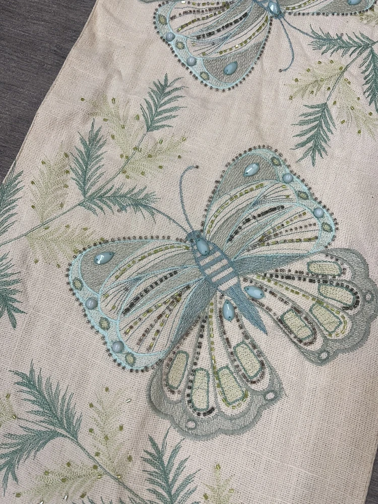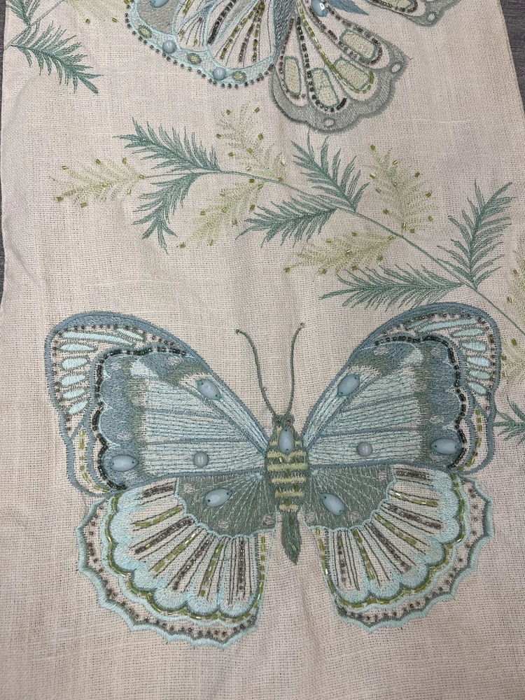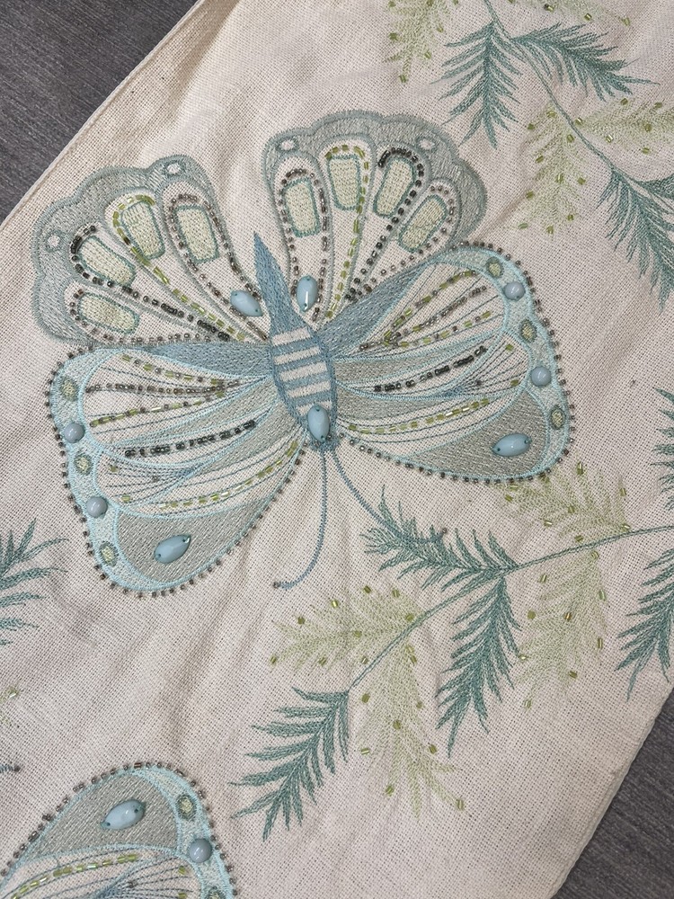 PIER 1 Butterfly TABLE RUNNER~ EMBROIDERED & Embellished w/ Beads Blue Green. Clean and gently used. 47” by 13”
