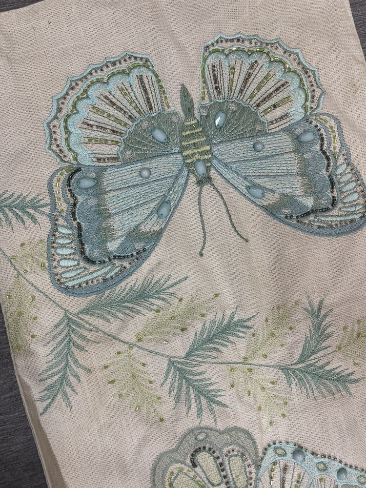 PIER 1 Butterfly TABLE RUNNER~ EMBROIDERED & Embellished w/ Beads Blue Green. Clean and gently used. 47” by 13”...
