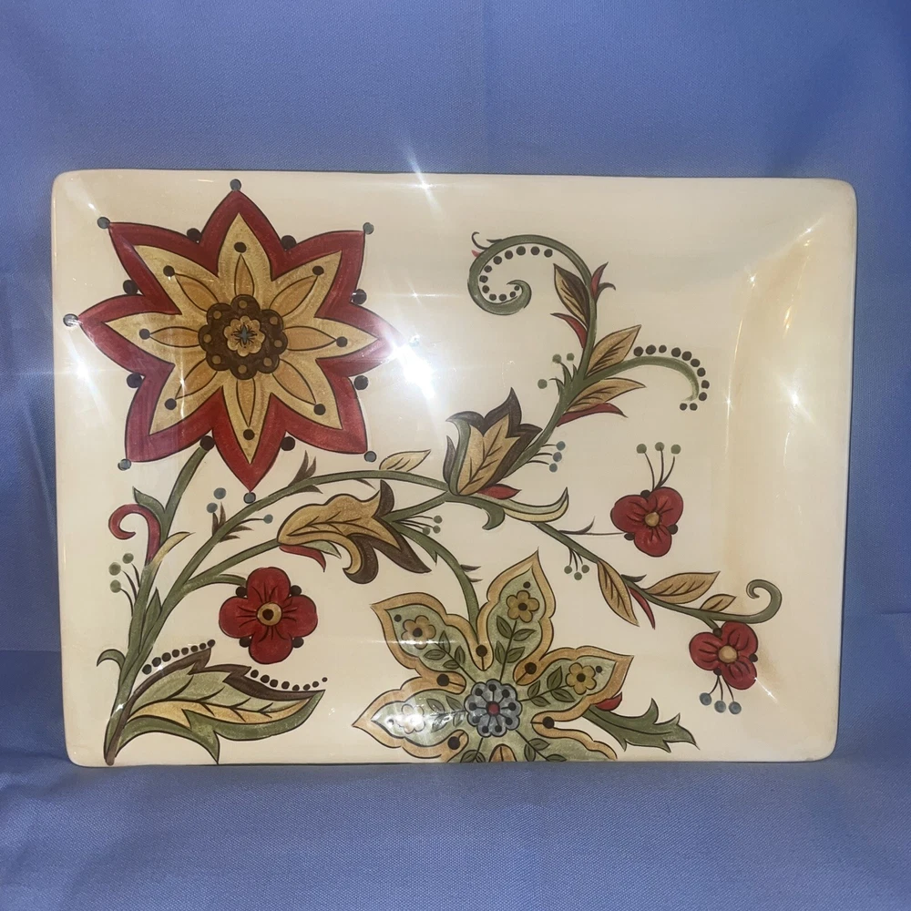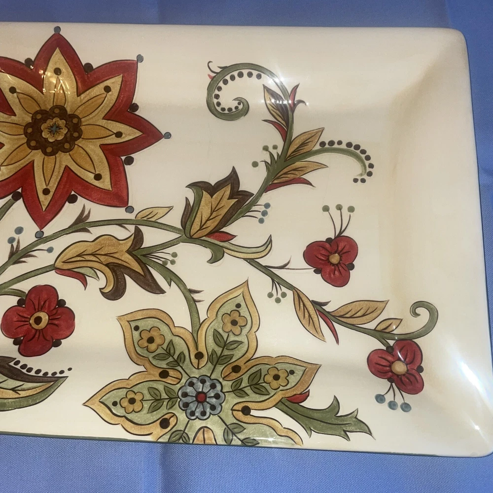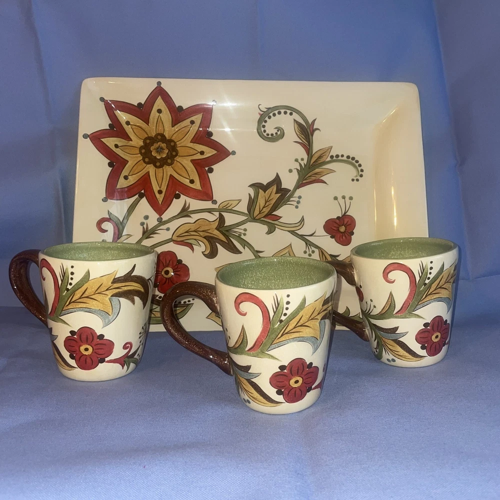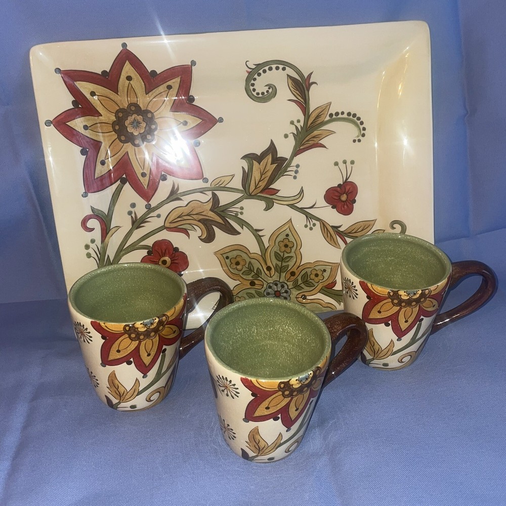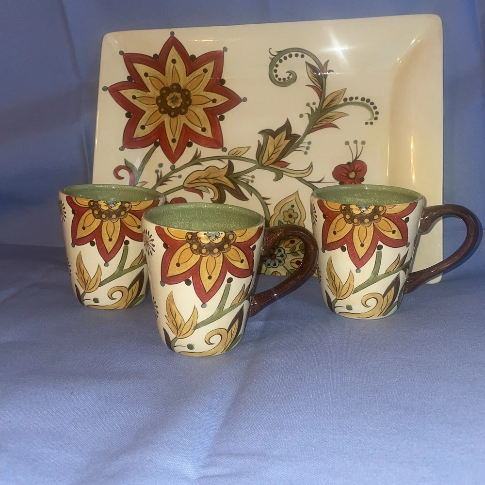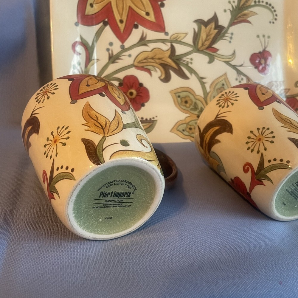 This Pier 1 serving platter and three mugs set features the Carynthum pattern, a colorful floral design perfect for fall or holiday gatherings. The platter is a large 16"x12" rectangle made of ceramic, part of the Pier 1 Imports product line. Both the platter and mugs are dishwasher safe, and mugs are also microwave safe making them practical for everyday use. This retired design adds a decorative touch to your table setting, showcasing a contemporary original production style with an earthenware construction made in China. Perfect for serving and entertaining guests in style. Large platter has a chip (see last photo) I did touch it up and added an acrylic coating over the chip.