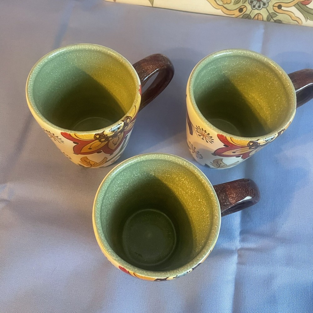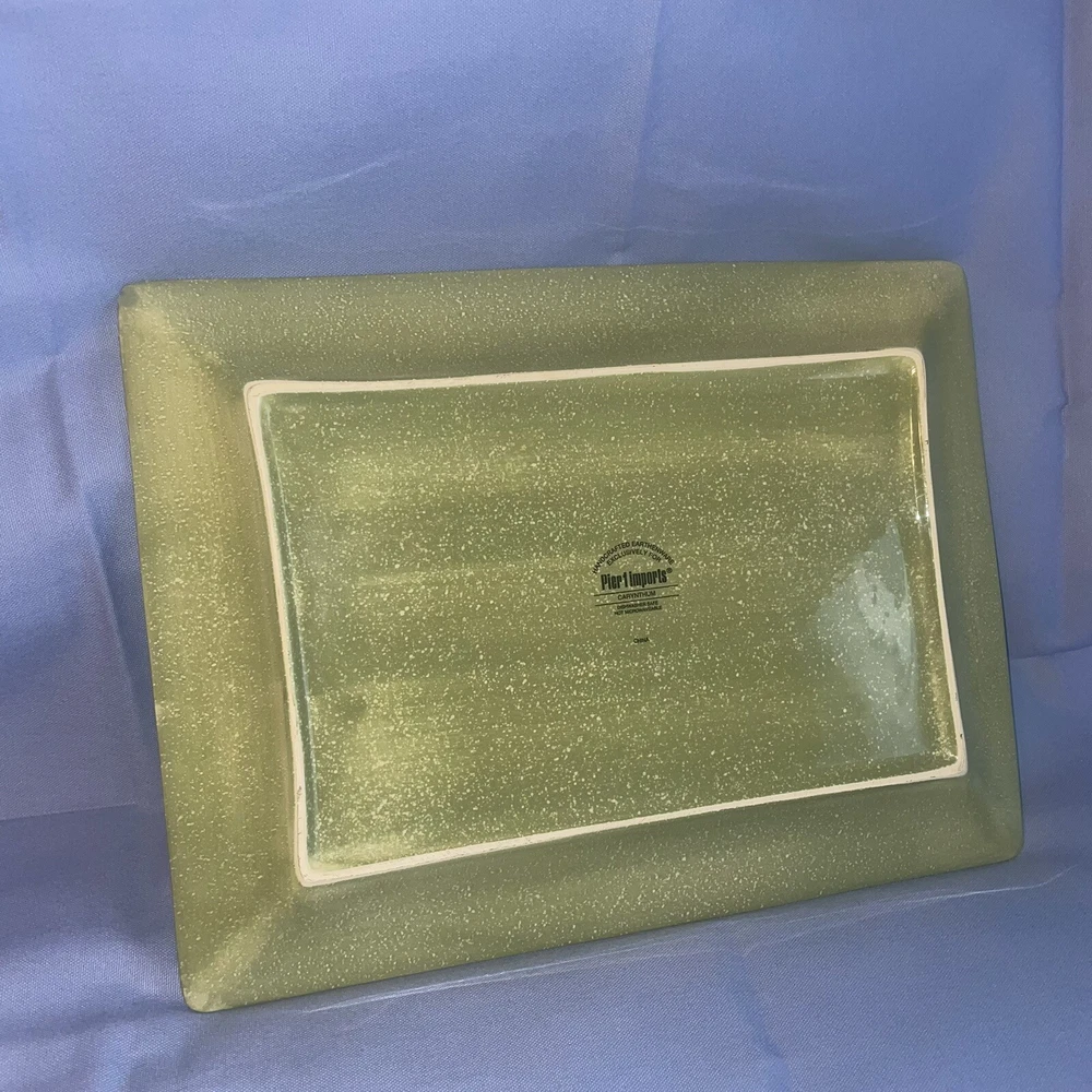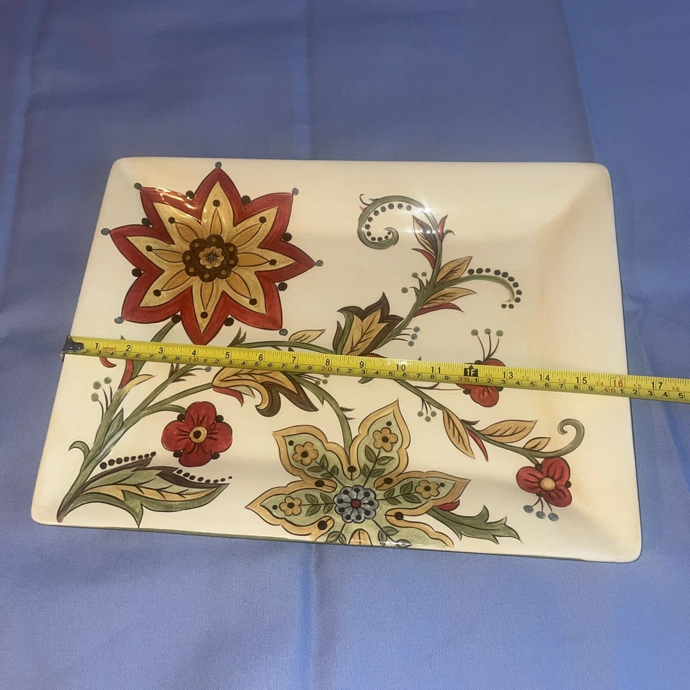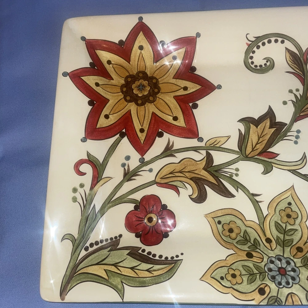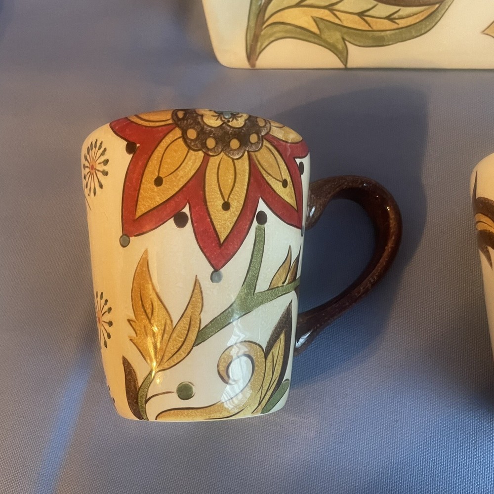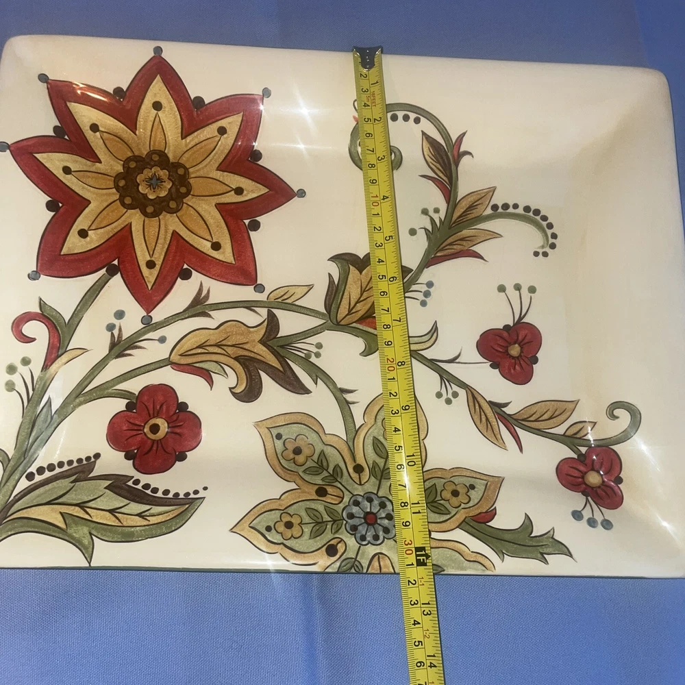 This Pier 1 serving platter and three mugs set features the Carynthum pattern, a colorful floral design perfect for fall or holiday gatherings. The platter is a large 16"x12" rectangle made of ceramic, part of the Pier 1 Imports product line. Both the platter and mugs are dishwasher safe, and mugs are also microwave safe making them practical for everyday use. This retired design adds a decorative touch to your table setting, showcasing a contemporary original production style with an earthenware construction made in China. Perfect for serving and entertaining guests in style. Large platter has a chip (see last photo) I did touch it up and added an acrylic coating over the chip.