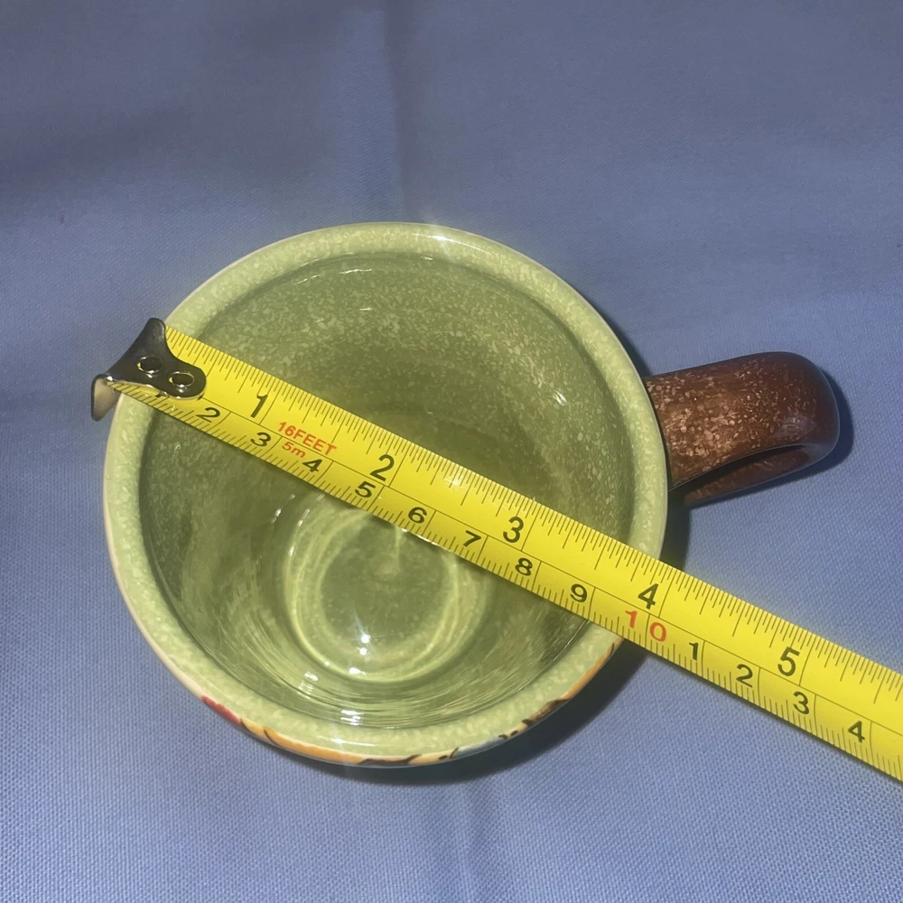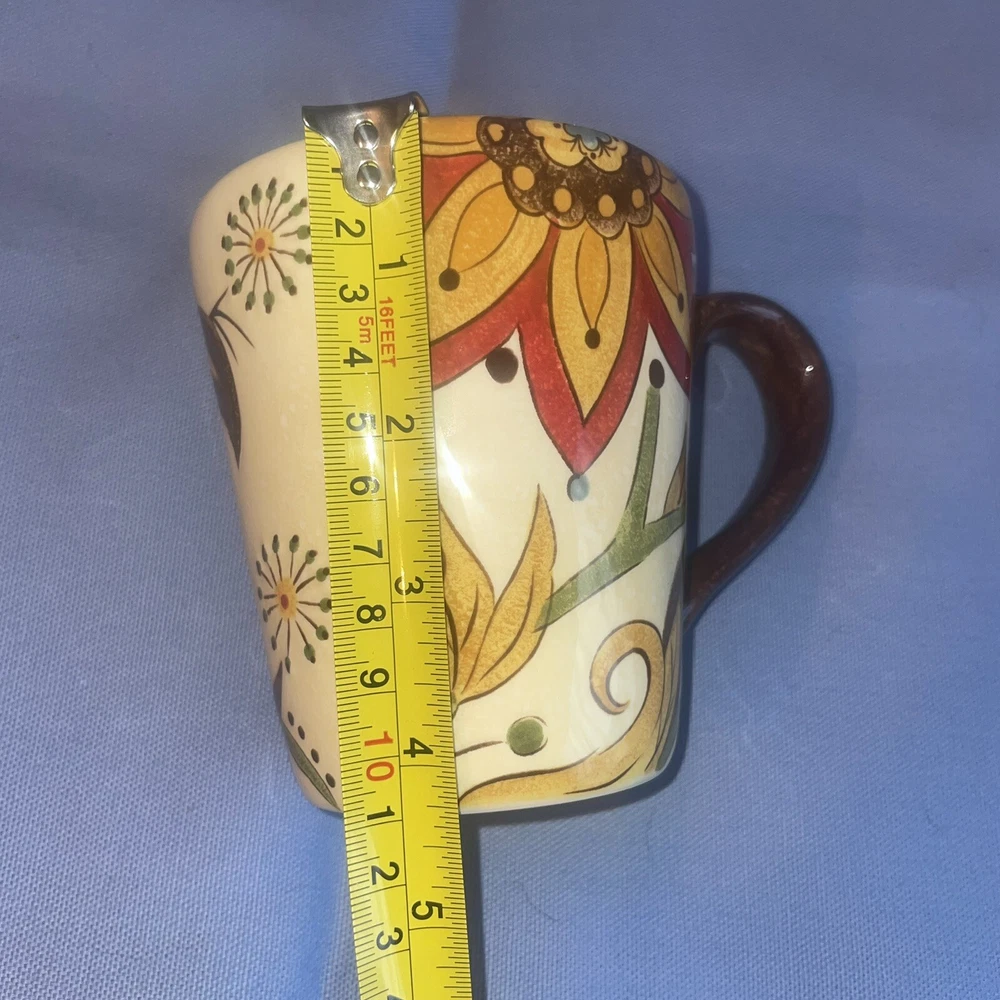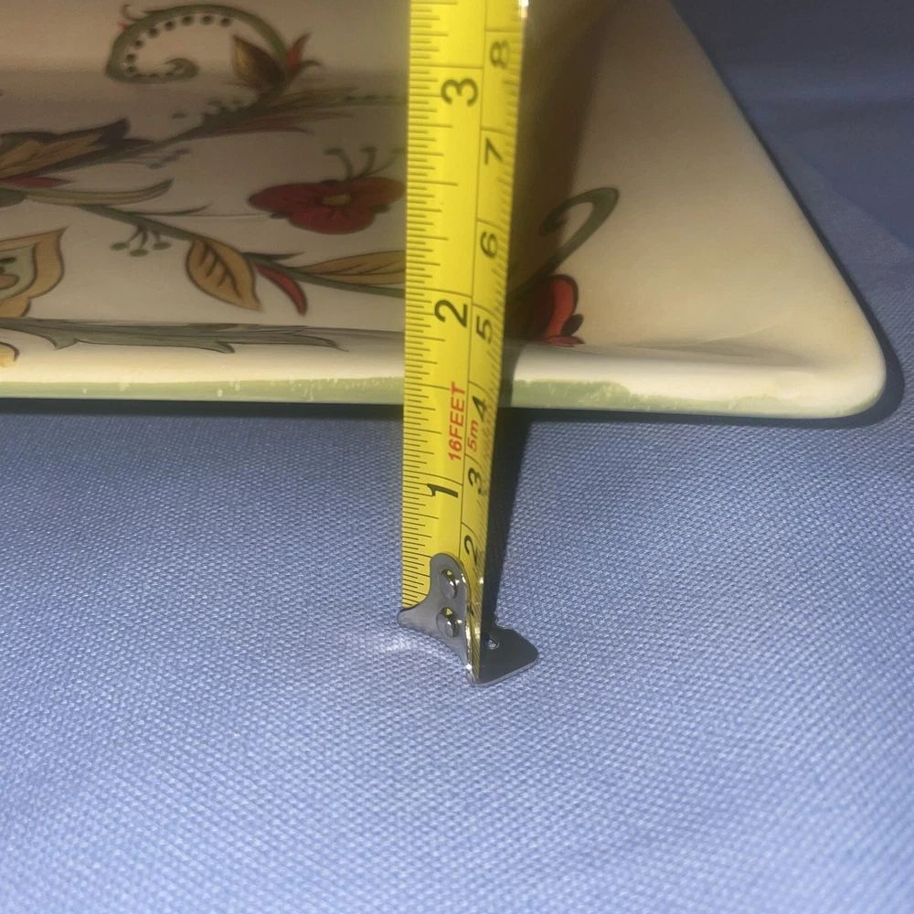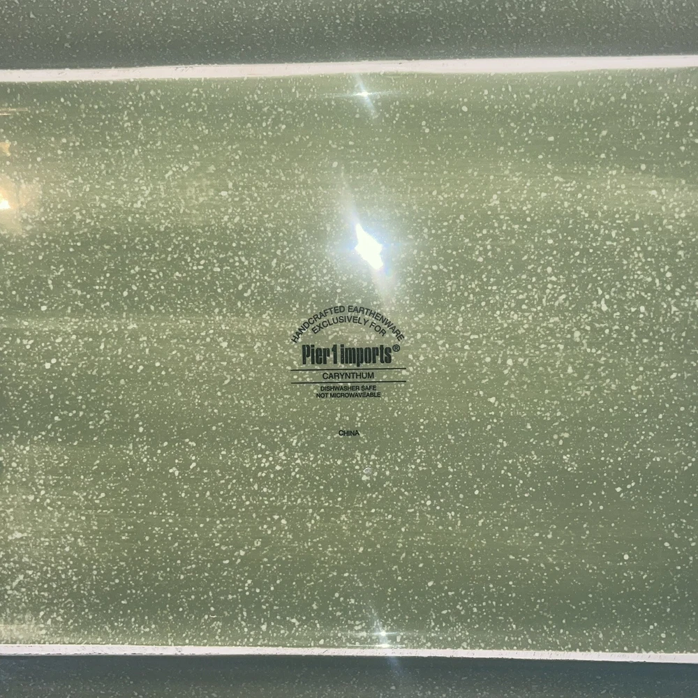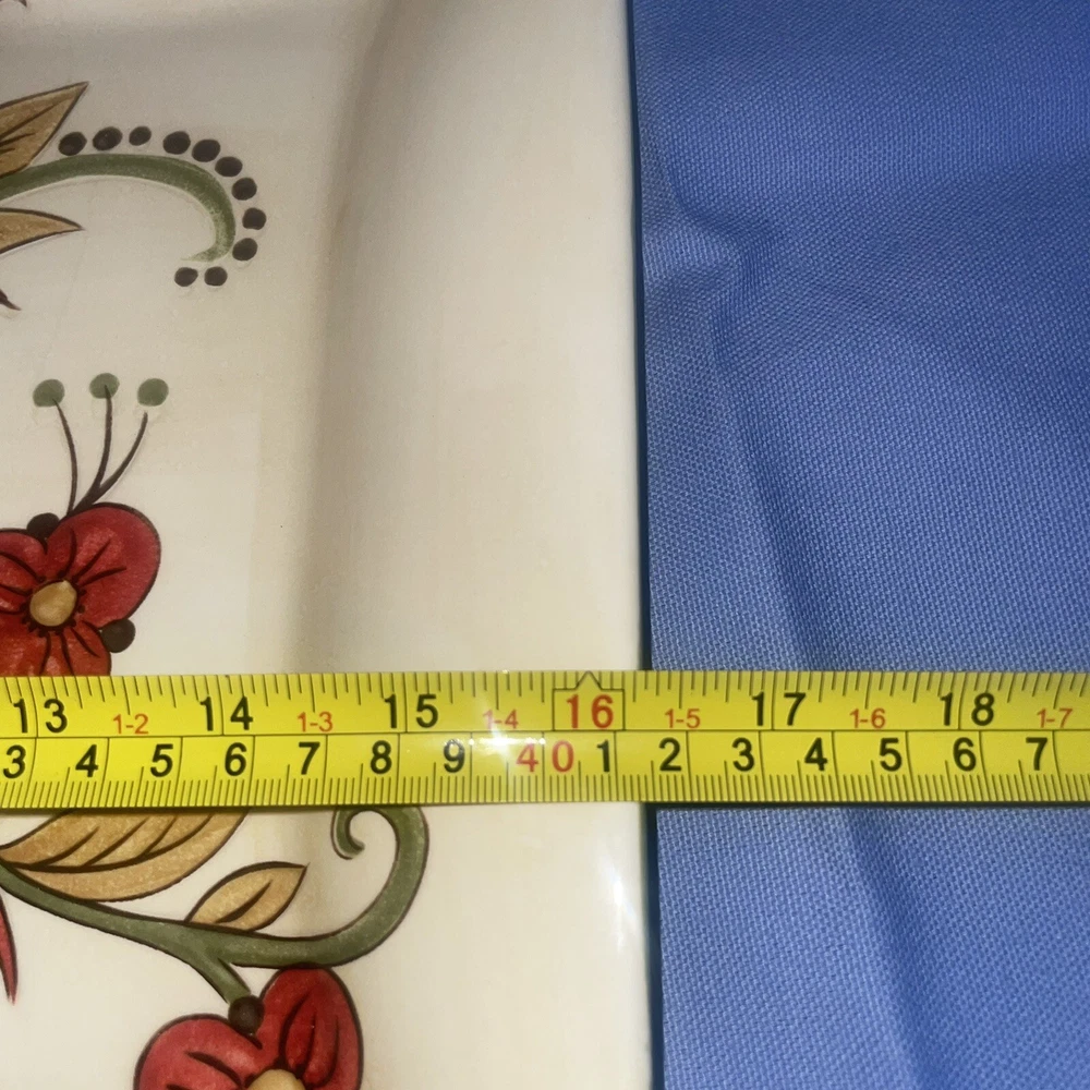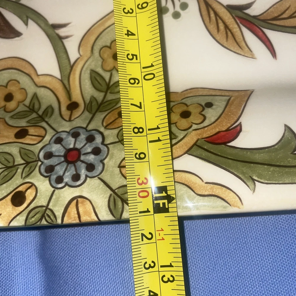 This Pier 1 serving platter and three mugs set features the Carynthum pattern, a colorful floral design perfect for fall or holiday gatherings. The platter is a large 16"x12" rectangle made of ceramic, part of the Pier 1 Imports product line. Both the platter and mugs are dishwasher safe, and mugs are also microwave safe making them practical for everyday use. This retired design adds a decorative touch to your table setting, showcasing a contemporary original production style with an earthenware construction made in China. Perfect for serving and entertaining guests in style. Large platter has a chip (see last photo) I did touch it up and added an acrylic coating over the chip.