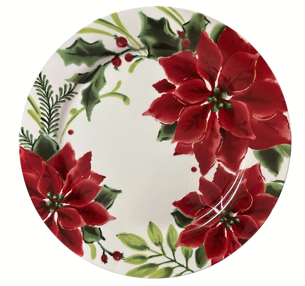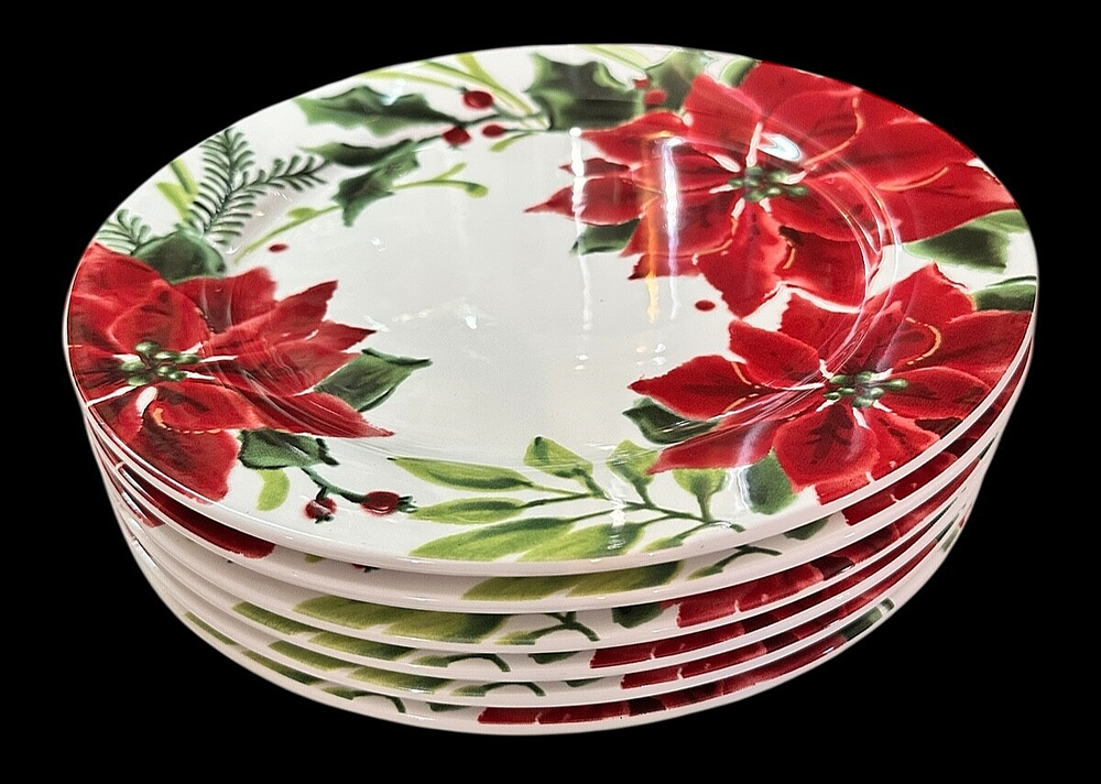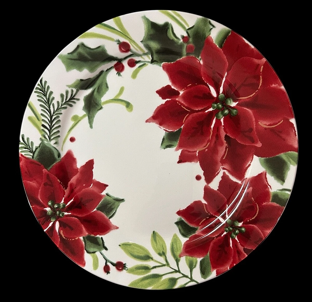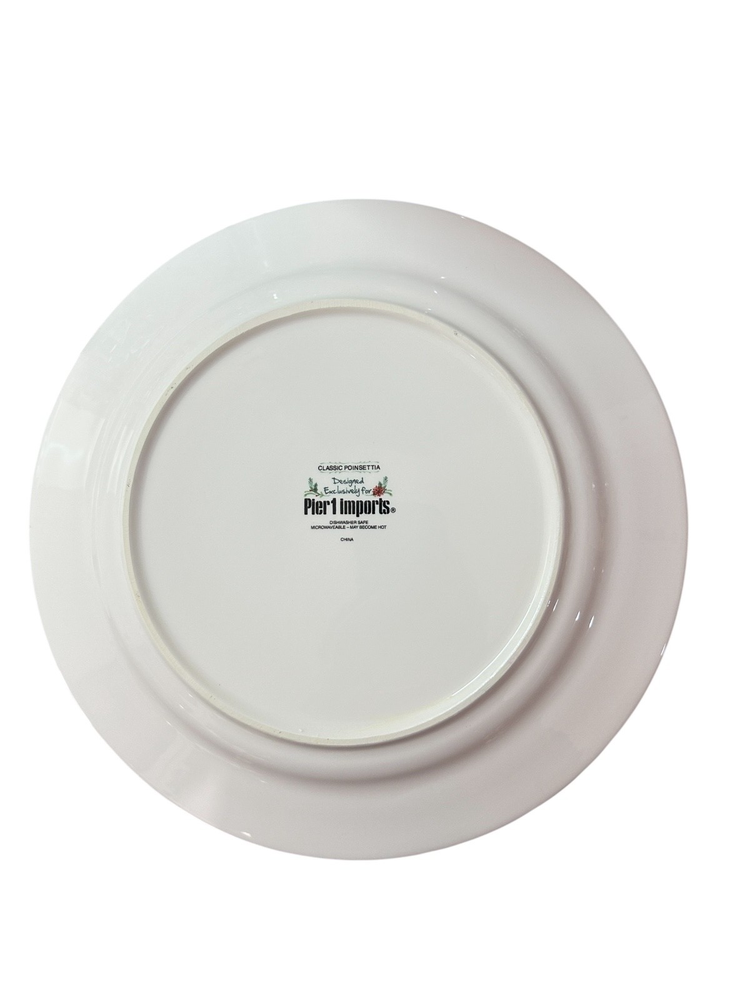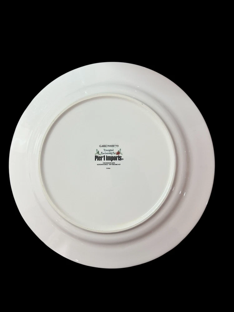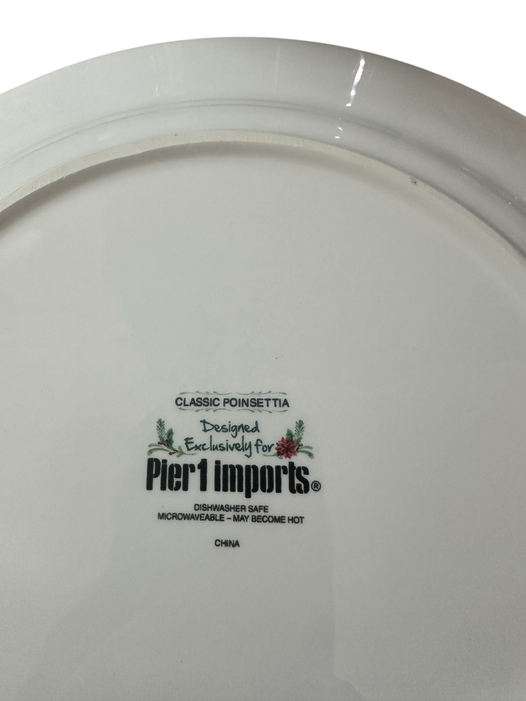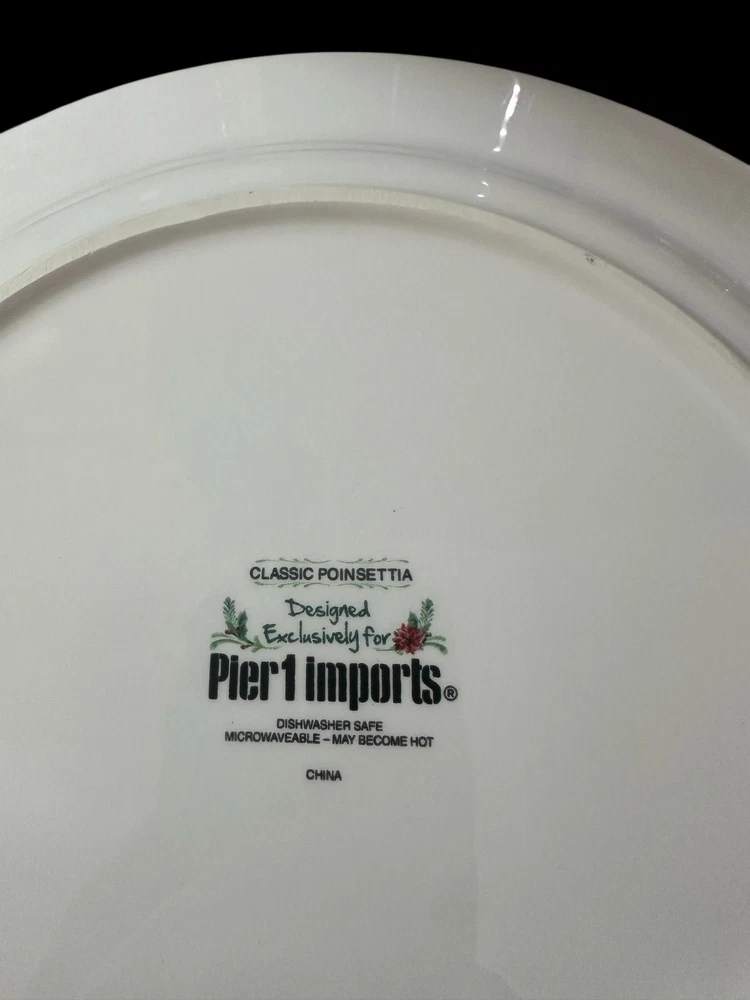 PIER 1 CLASSIC POINSETTIA 11" DINNER PLATES SET OF 6 RED & GREEN CHRISTMAS ADD A FESTIVE TOUCH TO YOUR HOLIDAY TABLE SETTINGS WITH THE PIER 1 CLASSIC POINSETTIA DINNER PLATES. EACH PLATE IN THIS SET OF TWO MEASURES 11 INCHES AND SHOWCASES A VIBRANT RED POINSETTIA PATTERN WITH GREEN ACCENTS, BRINGING THE SPIRIT OF CHRISTMAS TO YOUR DINING EXPERIENCE. CRAFTED FROM HIGH-QUALITY CERAMIC, THESE PLATES ARE BOTH ELEGANT AND PRACTICAL, BEING DISHWASHER SAFE FOR EASY CLEANUP. WITH A GLOSSY FINISH THAT ENHANCES THEIR CONTEMPORARY STYLE, THESE PLATES ARE A PERFECT CHOICE FOR THOSE SPECIAL HOLIDAY OCCASIONS OR FOR EVERYDAY USE DURING THE FESTIVE SEASON. MANUFACTURED IN CHINA BETWEEN 2010 AND 2019, THESE ROUND DINNER PLATES ARE AN ORIGINAL LICENSED REPRODUCTION, ENSURING THEY ARE AUTHENTIC TO THE PIER 1 BRAND AND ITS CLASSIC POINSETTIA DESIGN. ESTATE FRESH, NICE USED CONDITION. PLATES MEASURE 11" IN DIAMETER. MARKED AS SHOWN. PLEASE SEE ALL IMAGES AS THEY ARE AN INTEGRAL PART OF THE DESCRIPTION AND ASK ALL QUESTIONS PRIOR TO BIDDING. ALL ITEMS ARE PRE-OWNED AND AS SUCH MAY SHOW SOME SIGNS OF PREVIOUS USE SUCH AS MINOR MARKS AND BLEMISHES. PLEASE CONTACT US IF YOU WISH A MORE DETAILED DESCRIPTION OF A PARTICULAR ITEM.