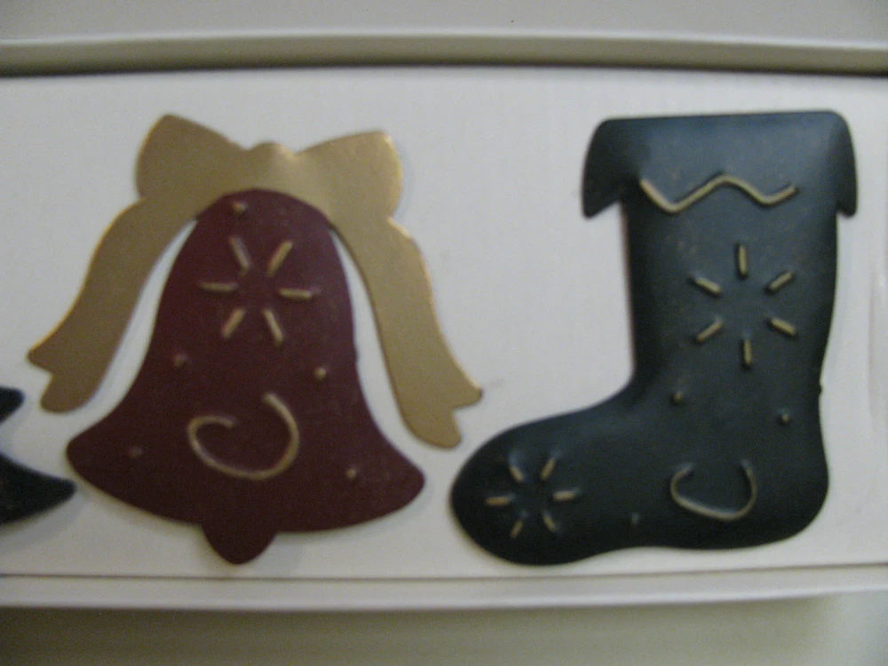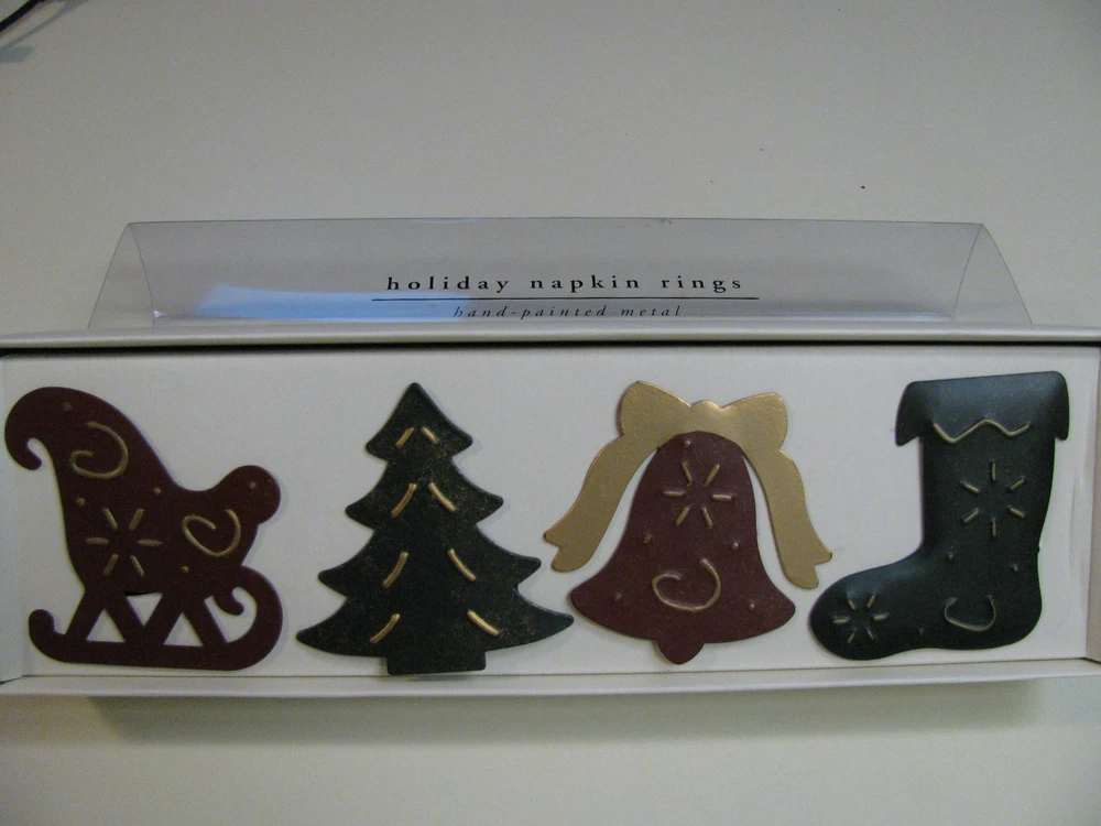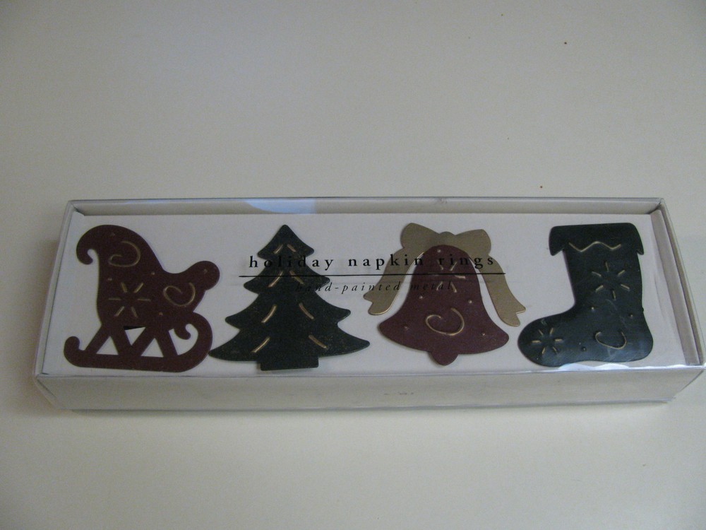 PEIR 1 CHRISTMAS NAPKIN RINGS - SET OF 4 NEW IN BOX Hand Painted Metal - 4 Different Designs - Sleigh, Bell, Tree and Stocking Dark Red Sleigh and Bell Dark Green Christmas Tree and Stocking All with Gold Accent Color BEAUTIFUL!!! Paypal Payment due in 2 days ~ Will ship promptly once payment received. Winning Bidder pays $5.45 Shipping within Continental USA. Sorry, No shipping to Alaska, Hawaii, APO/FPO Addresses, US Protectorates, or International Shipping. Thanks for looking ~ Be sure to check out my other Auctions!