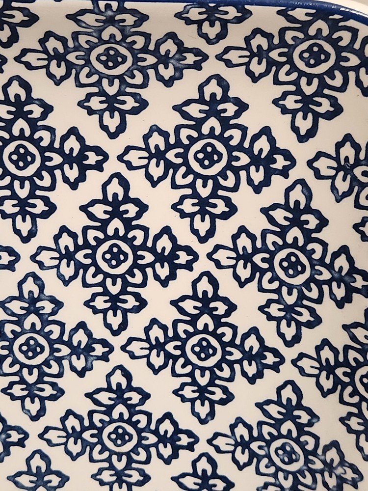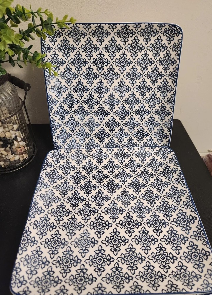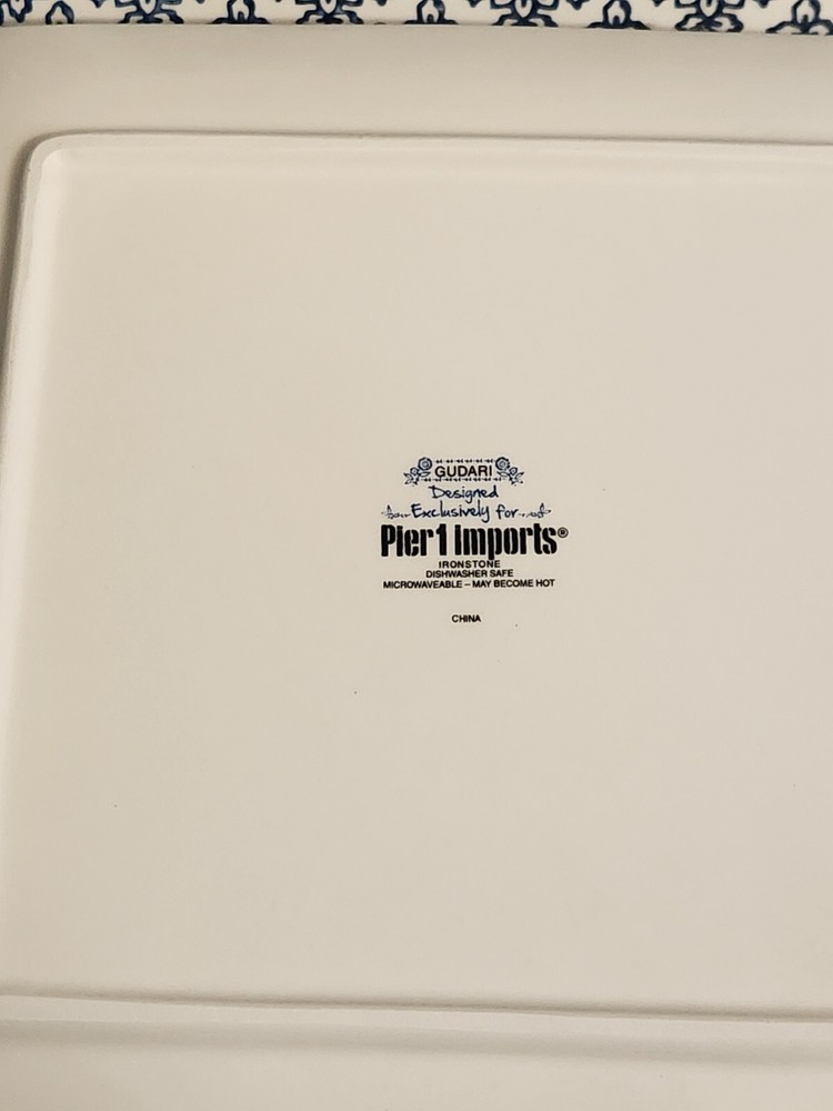 PIER 1 Dinner Plates Designed by Gudari Blue Floral Print Square 10½" Set Of 2 There are no signs of use. They appear to be new. Sorry, I will not separate. At the time of listing, I have multiple sets of 2. Combined shipping is done in the form of a refund once the orders are packed.