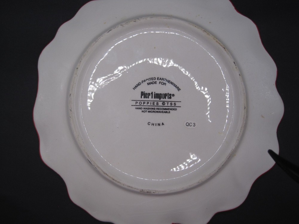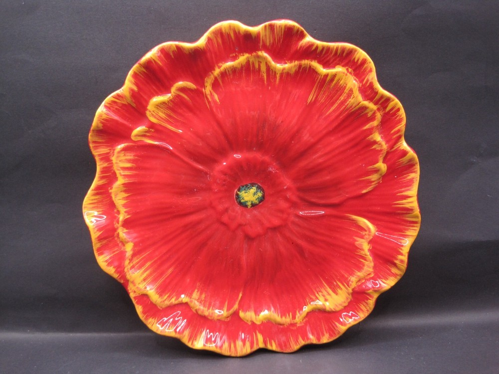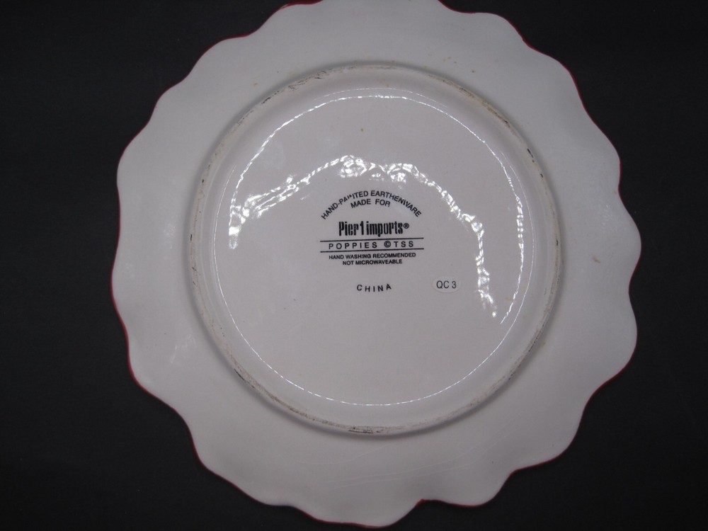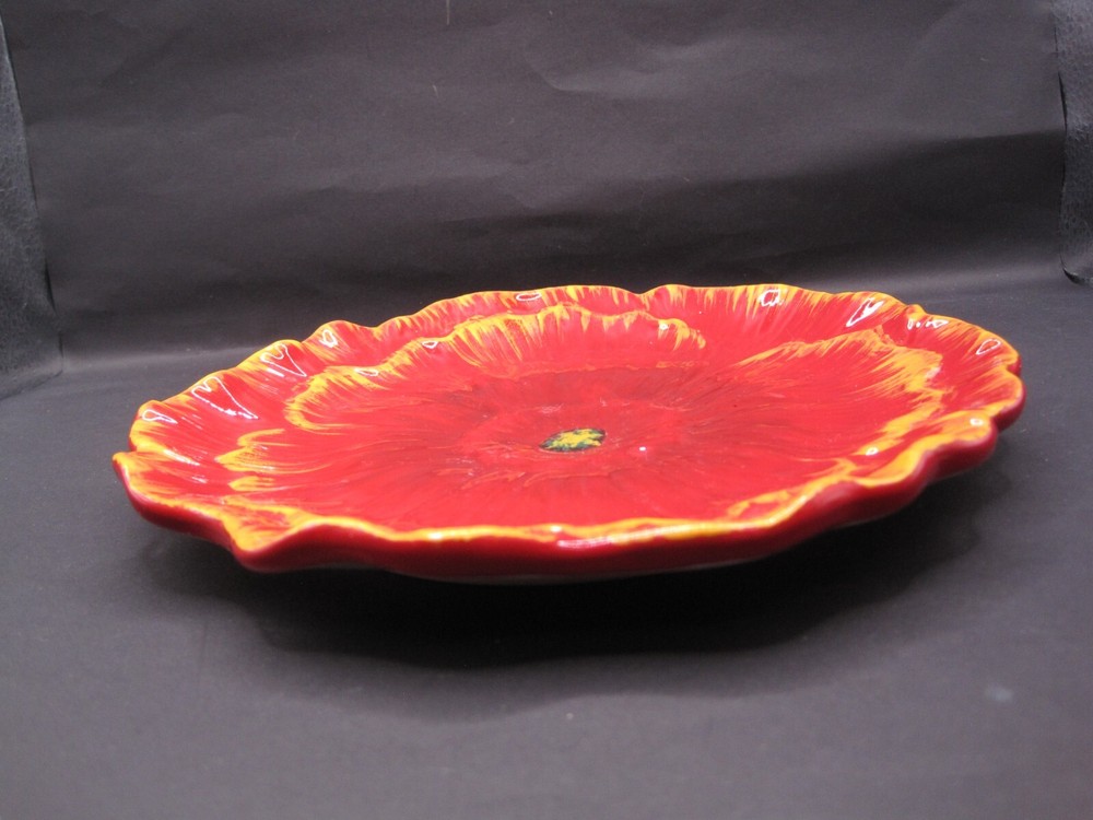 This Pier 1 appetizer dessert plate features a vibrant red poppy flower design, adding a touch of Mediterranean style to any table setting. Made of earthenware, this round plate is hand-painted with a glossy finish, giving it a contemporary original look. The plate is ideal for all occasions, adding a pop of color and elegance to your dining experience. 8" plate Thank you for shopping B's Shoppe 55-B7