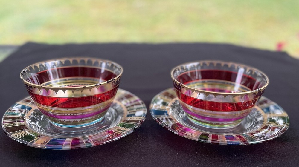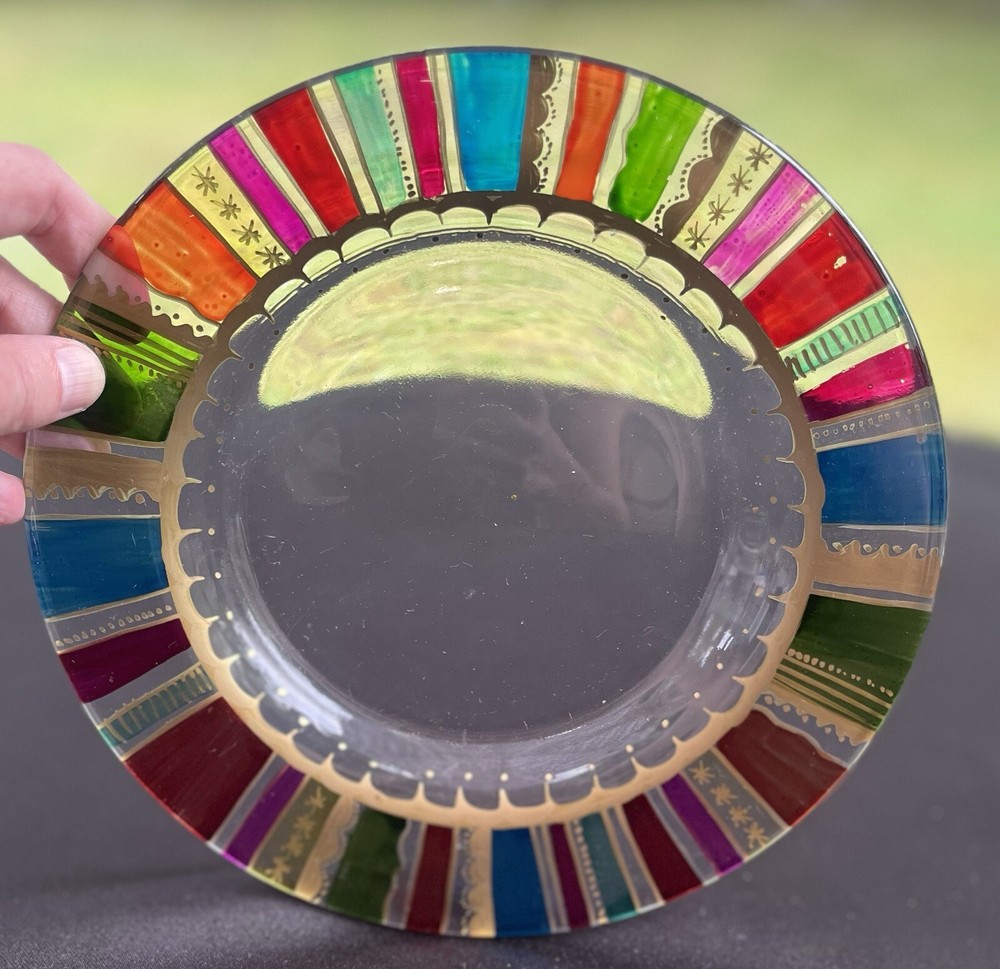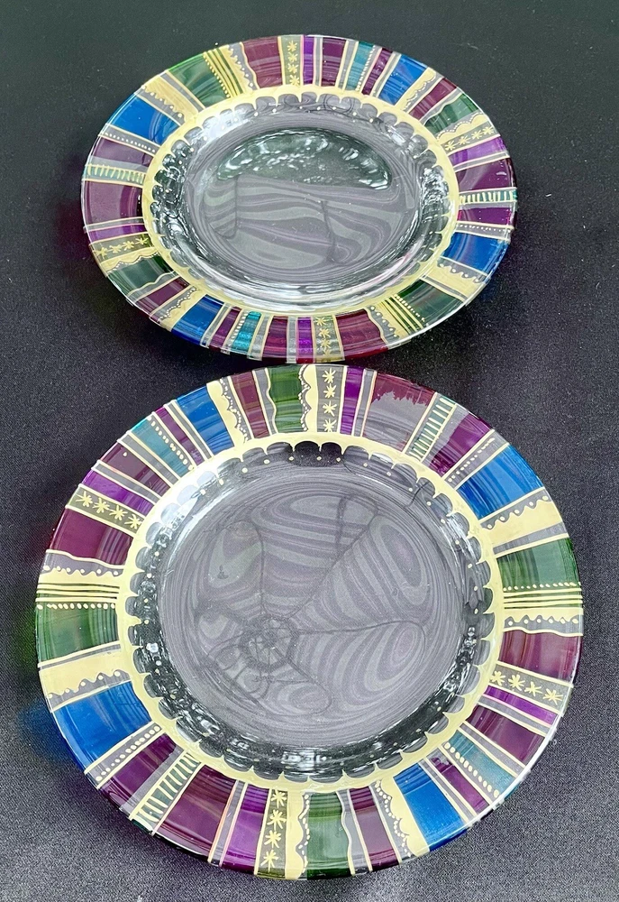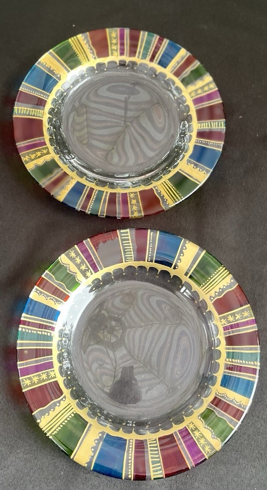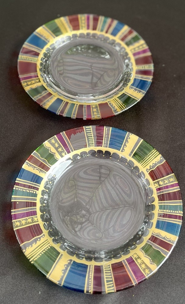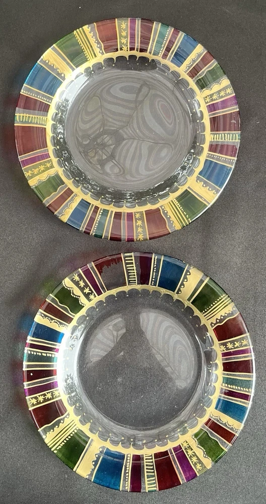 Add some festive flair to your dining table with this PIER 1 set of two 8.25" salad plates and two 5" all-purpose bowls. The set is in very good pre owned condition. There are some spots where the hand painting is wearing off. I have included multiple photos so please see all as they are part of the description. The multicolor striped pattern is spectacularly beautiful and is perfect for any food and drink theme, and the glass material adds a touch of elegance to your table setting. The round shape of the plates and bowls make them easy to hold and serve, while the 8.5" plate diameter and 5.5"Wx2.75"H bowl length provide ample space for your favorite dishes. This four-piece set is a must-have for any kitchen, dining, and bar collection. Add some COLOR to your next meal!