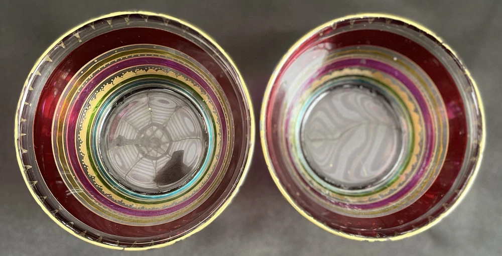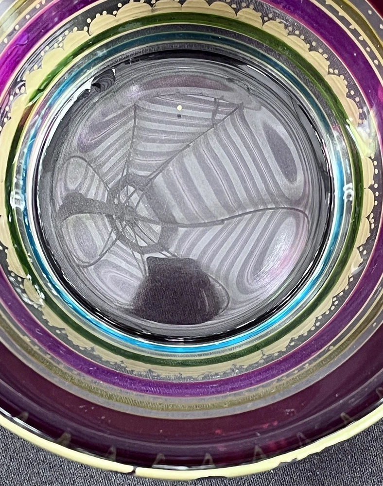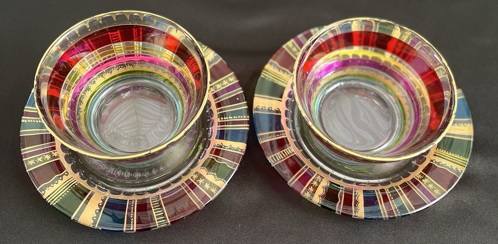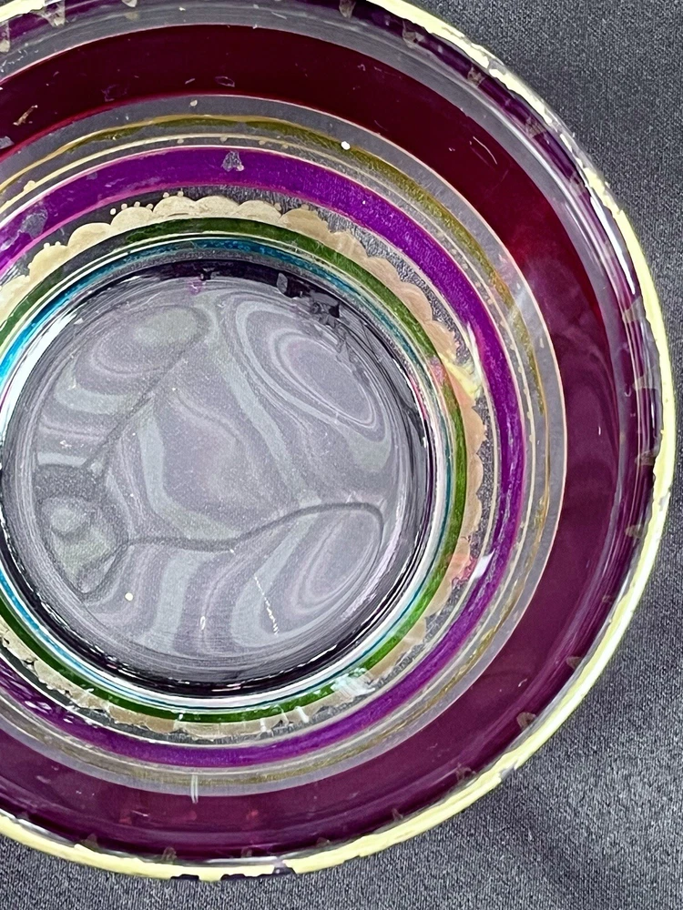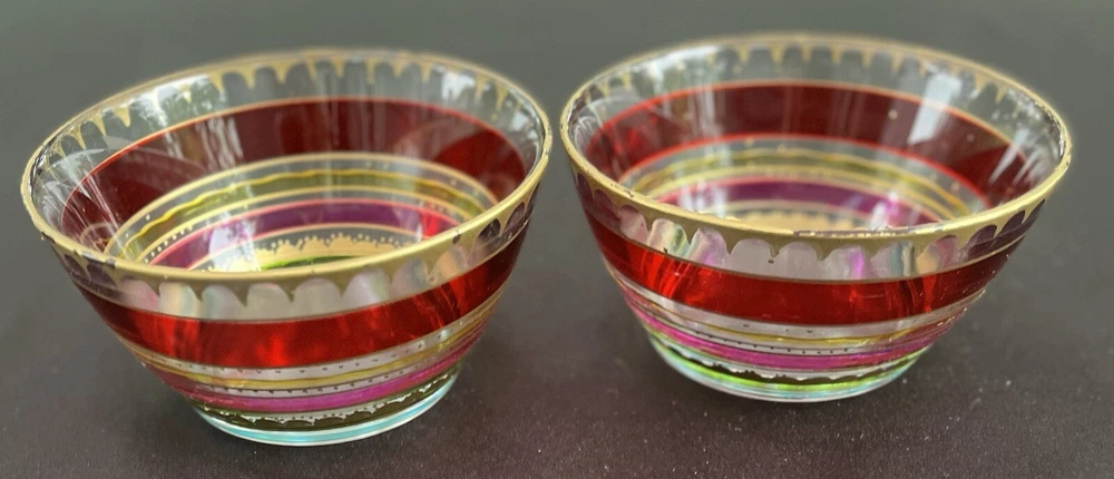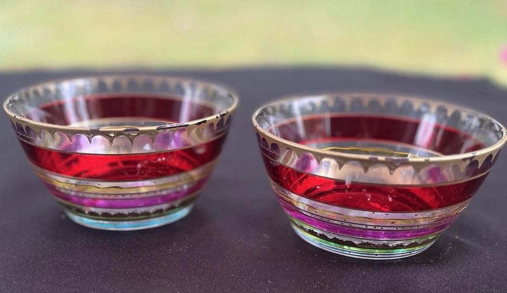 Add some festive flair to your dining table with this PIER 1 set of two 8.25" salad plates and two 5" all-purpose bowls. The set is in very good pre owned condition. There are some spots where the hand painting is wearing off. I have included multiple photos so please see all as they are part of the description. The multicolor striped pattern is spectacularly beautiful and is perfect for any food and drink theme, and the glass material adds a touch of elegance to your table setting. The round shape of the plates and bowls make them easy to hold and serve, while the 8.5" plate diameter and 5.5"Wx2.75"H bowl length provide ample space for your favorite dishes. This four-piece set is a must-have for any kitchen, dining, and bar collection. Add some COLOR to your next meal!