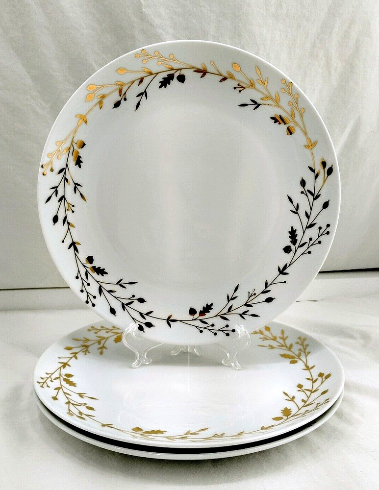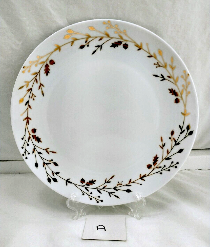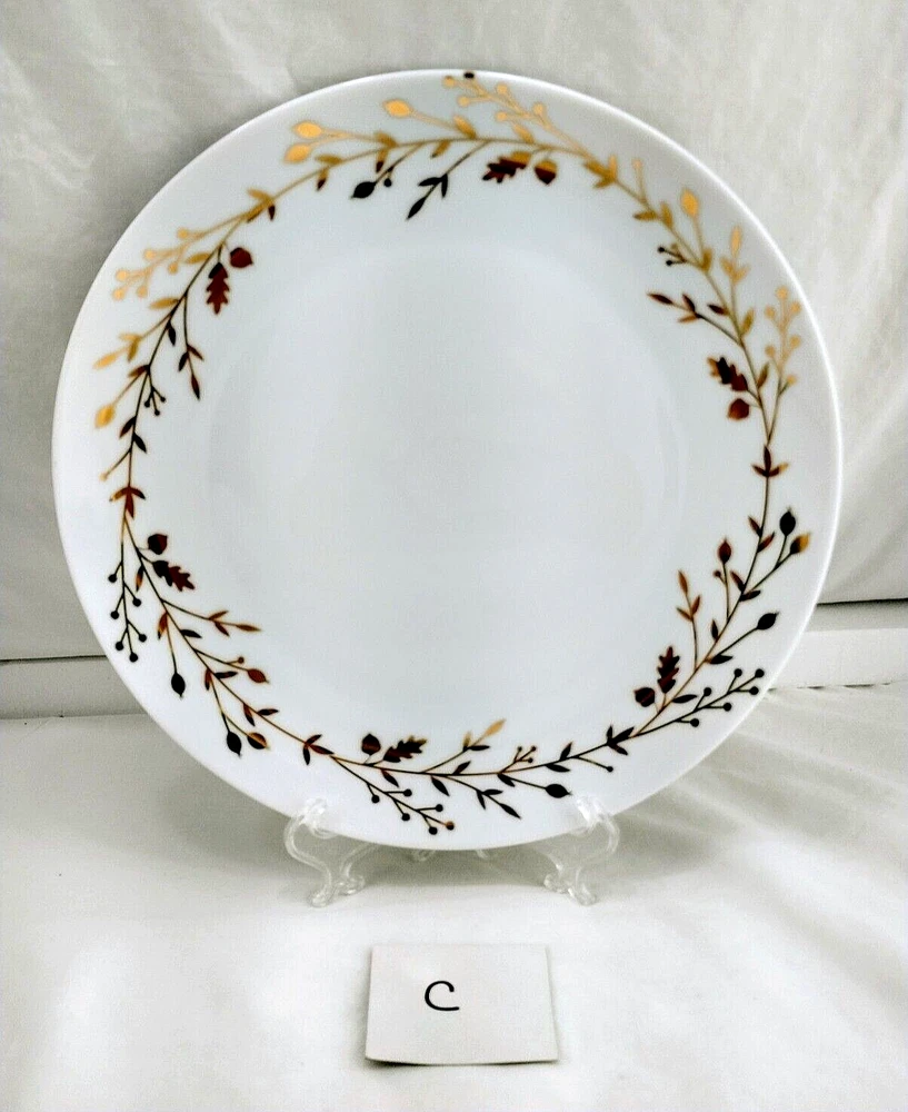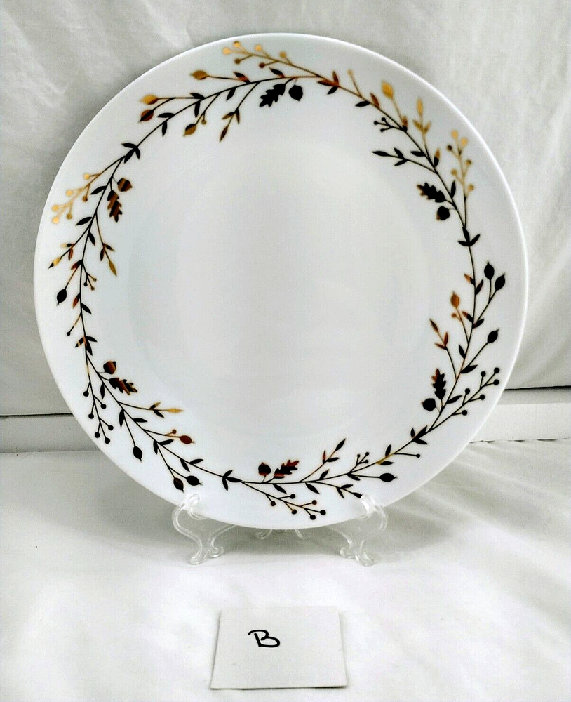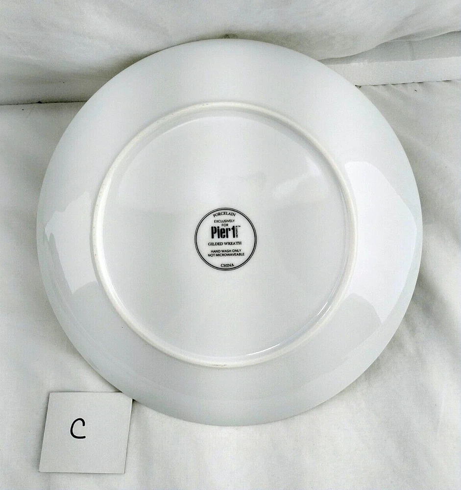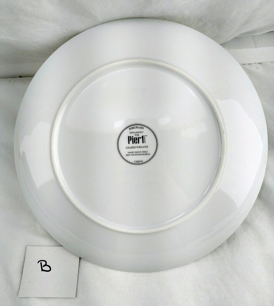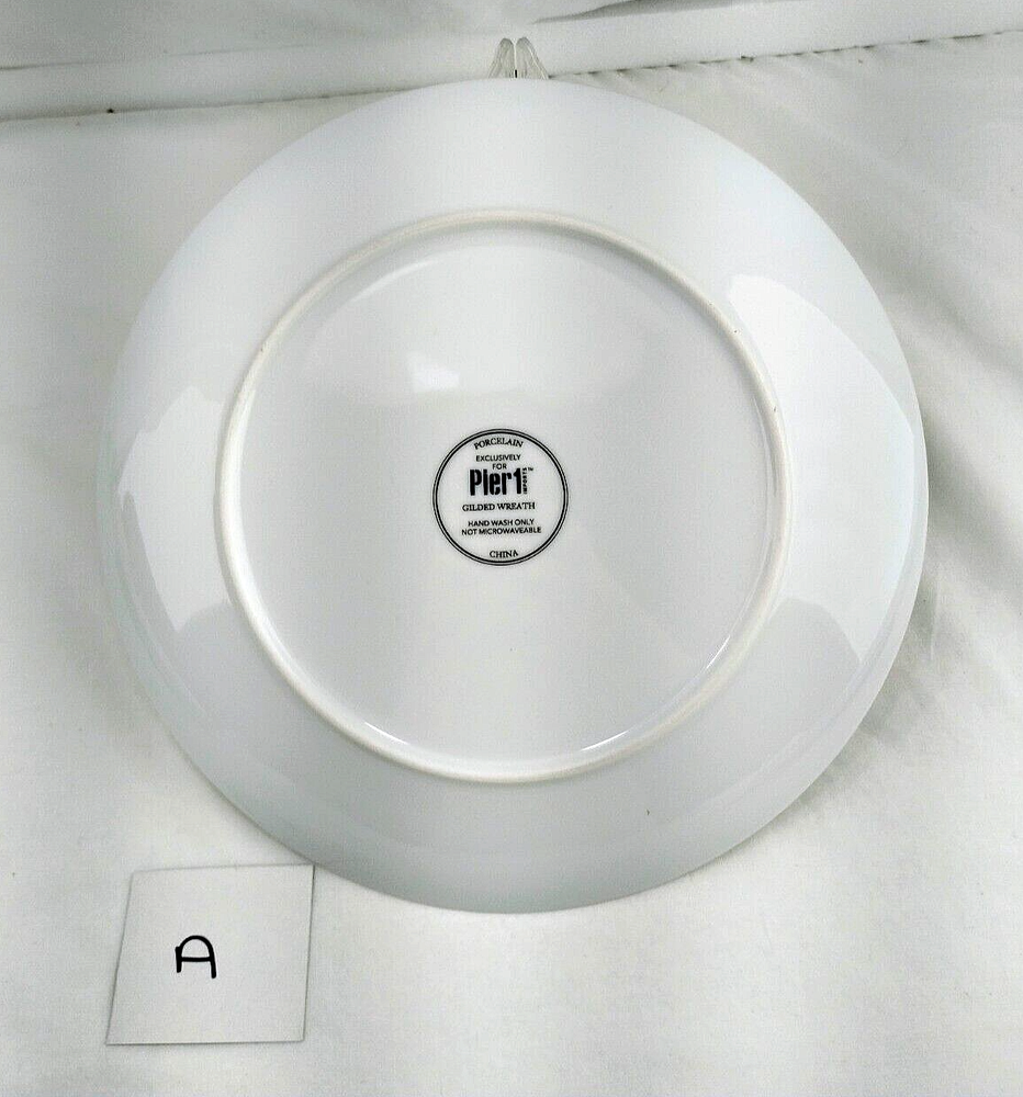 PIER 1 Gilded Wreath 10 1/2" Dinner Plate Discontinued: 2019 Gold Laurel Border on White Porcelain Excellent Used Condition. No Chips or Cracks Items in photos are the actual items for sale. Very minimal signs of wear / use. (Center eating surface has very light utensil marks) Maybe use a couple of times. Three plates are available at the time of the listing. Each plate is marked in photos. You may choose the individual plate by contacting us. If you make no selection before shipping we will ship one at random. Thank you in advance! Most items ship the next day!