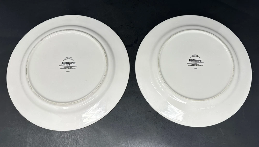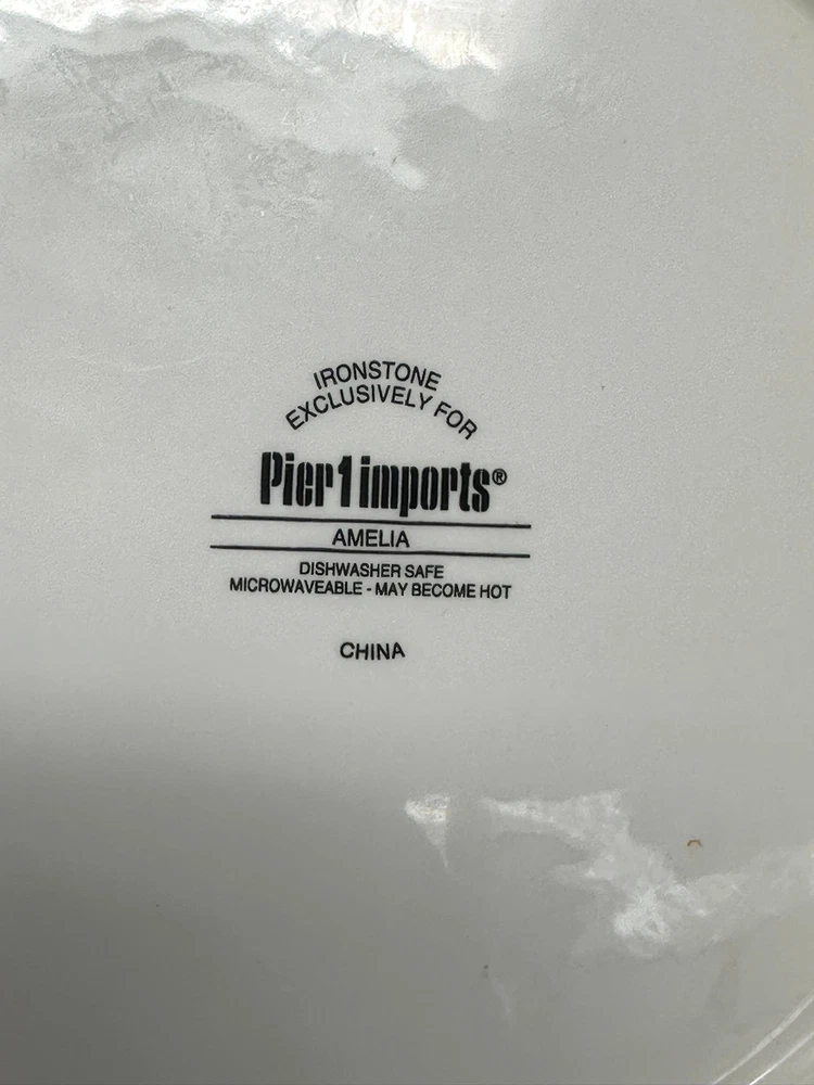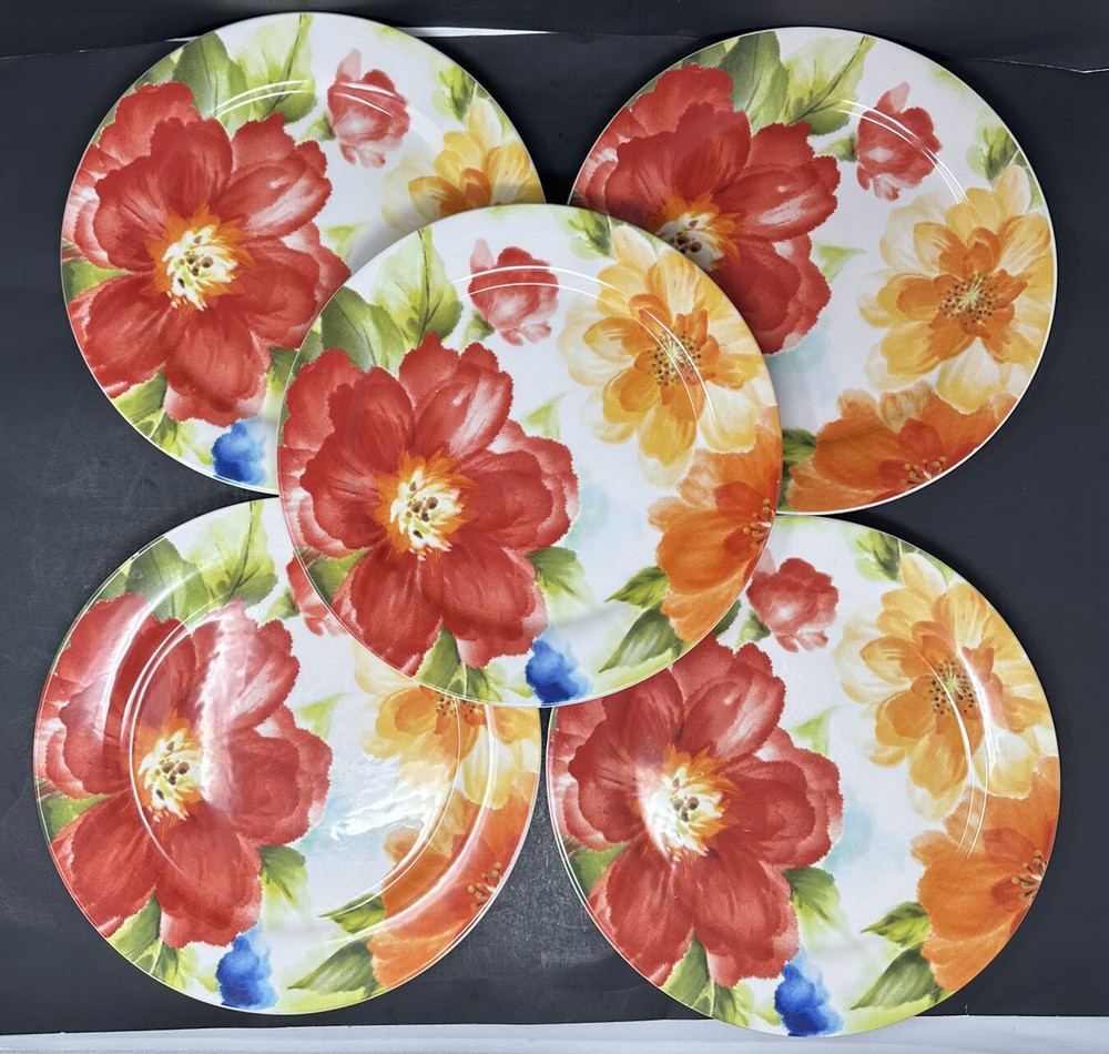 For your consideration is this lovely set of five (5) Pier 1 dinner plates in the Amelia pattern – a beautiful bright floral pattern in shades of red, blue, orange, yellow, and green. These exquisite plates were only in production from 2012 to 2017. They measure 10 3/4” across and 7/8” tall. Marking states “Ironstone Exclusively For Pier 1 Imports ® | Amelia | Dishwasher Safe | Microwaveable – May Become Hot | China.” Please note: These dinner plates are in very good, used condition, with no cracks or repairs, just some utensil wear. Two plates have two small chips each on the rim, and one nick to the glaze, and another has a chip on the underside rim (which is not noticeable unless you flip the plate over to look for it). Please see photos #4, #5, #6, #8, #10, #14, #15, #16, and #17. Glare from camera. Listing and template services provided by inkFrog
