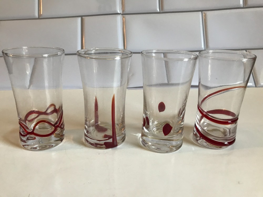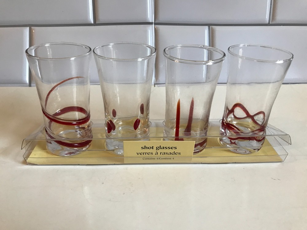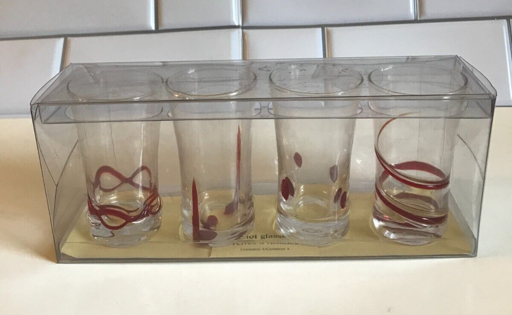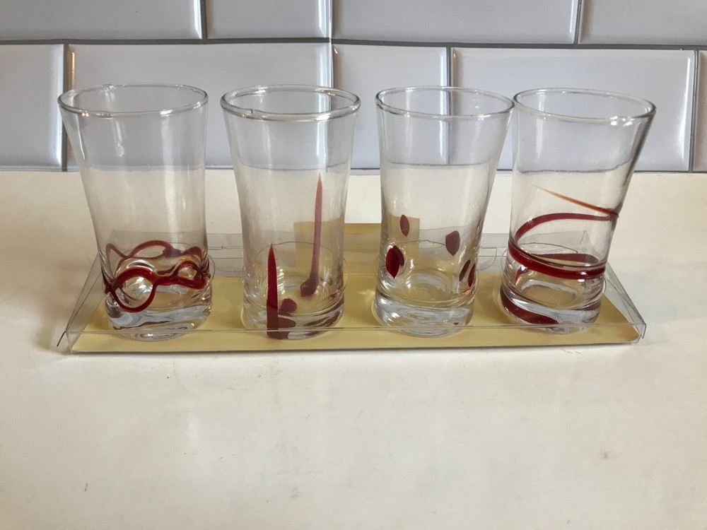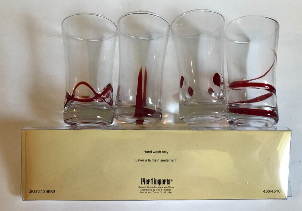 Like New ~ Original Box ~ PIER 1 IMPORTS ~ CLEAR BLOWN GLASS WITH RED ACCENTS ~ SET OF 4 ~ See Condition Description & Photos ~ CHECK OUT MY OTHER PIER 1 ITEMS ~ From a Smoke Free Home! I strive to give an accurate description of my items. Pictures are an accurate depiction of the item. Please REVIEW the description and pictures carefully. Please ask any questions before you purchase the item. Be sure to Add me to your FAVORITES List! CHECK OUT MY STORE! {1031} 1.+3.<***