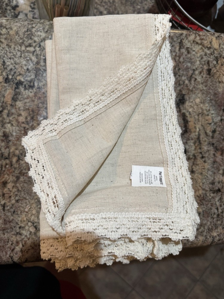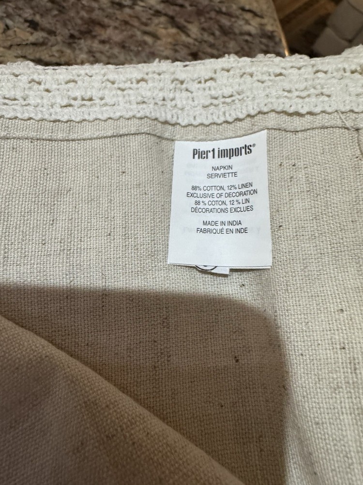 Pier one cream and lace trim cloth dinner napkins New (6) Cloth dinner napkins Cream solid pattern with lace trim Set of 6 brand new Never used Bought from pier one imports Sorry no returns Sorry no refunds
